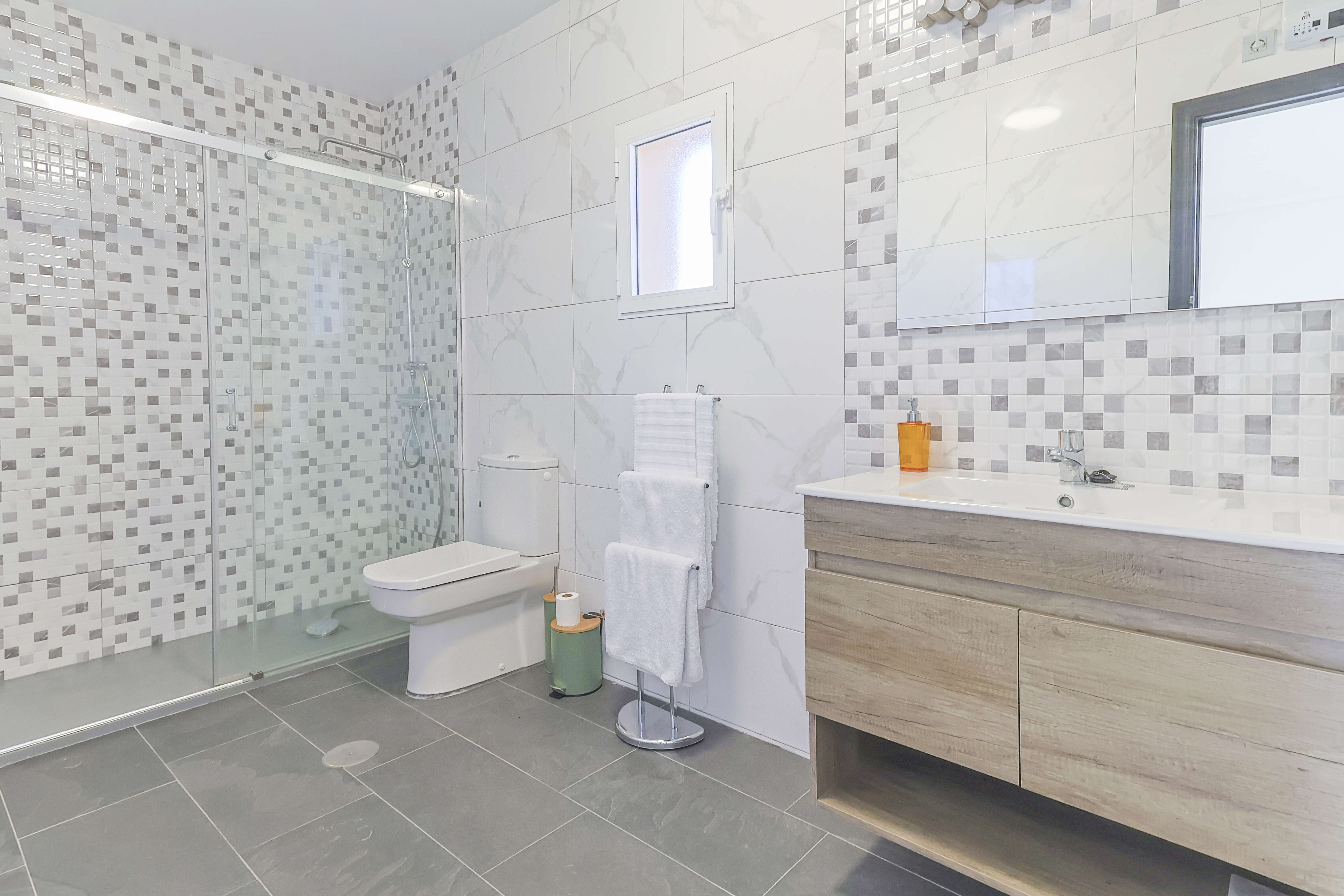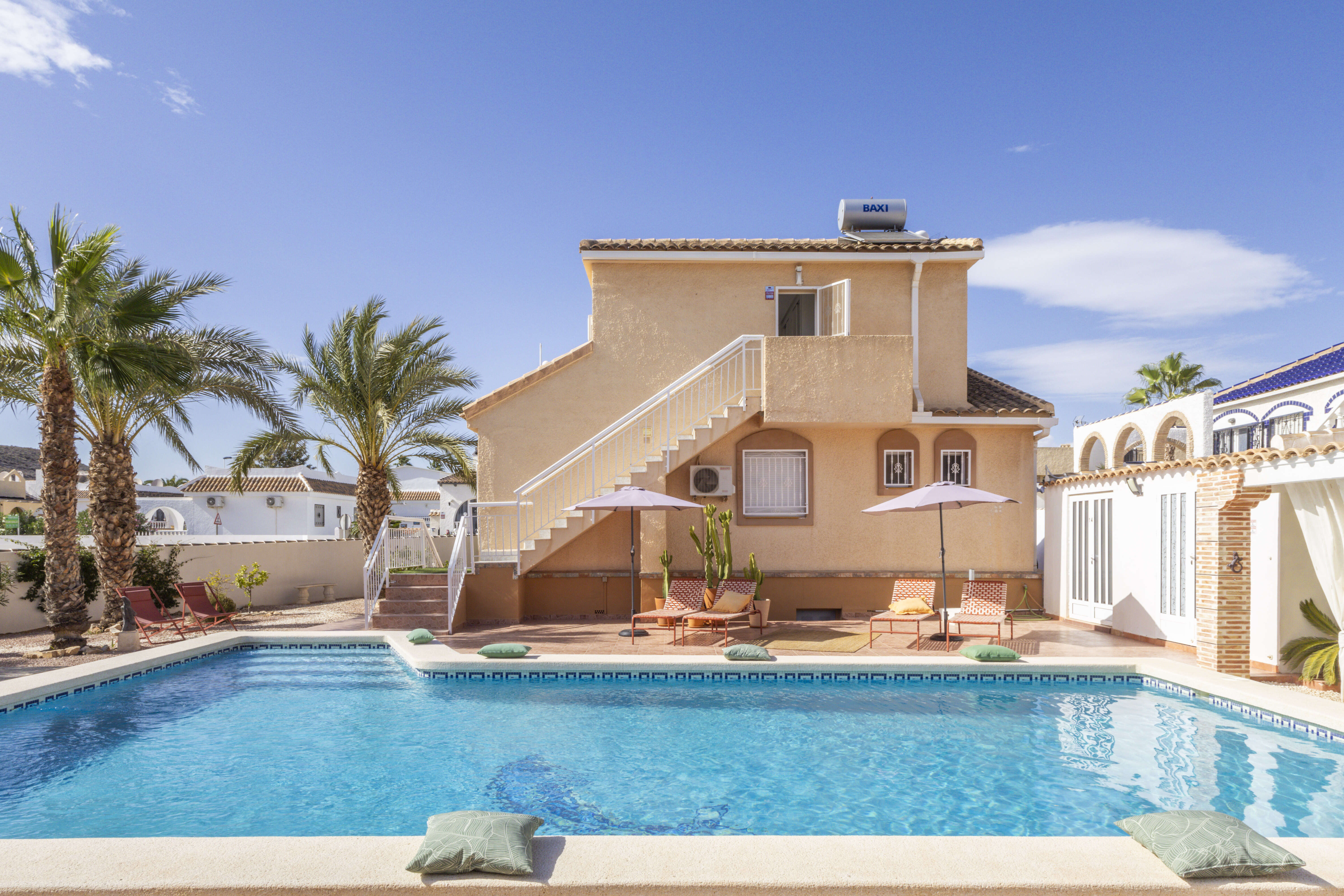 L'intérieur comprend un salon confortable et une cuisine moderne équipée des derniers appareils de cuisine. La maison dispose également de trois chambres, toutes équipées de lits confortables et de nouveaux matelas pour une bonne nuit de sommeil. De plus, il y a trois salles de bains modernes et élégantes, offrant tout le confort nécessaire. Climatisation et moustiquaires dans toute la maison.