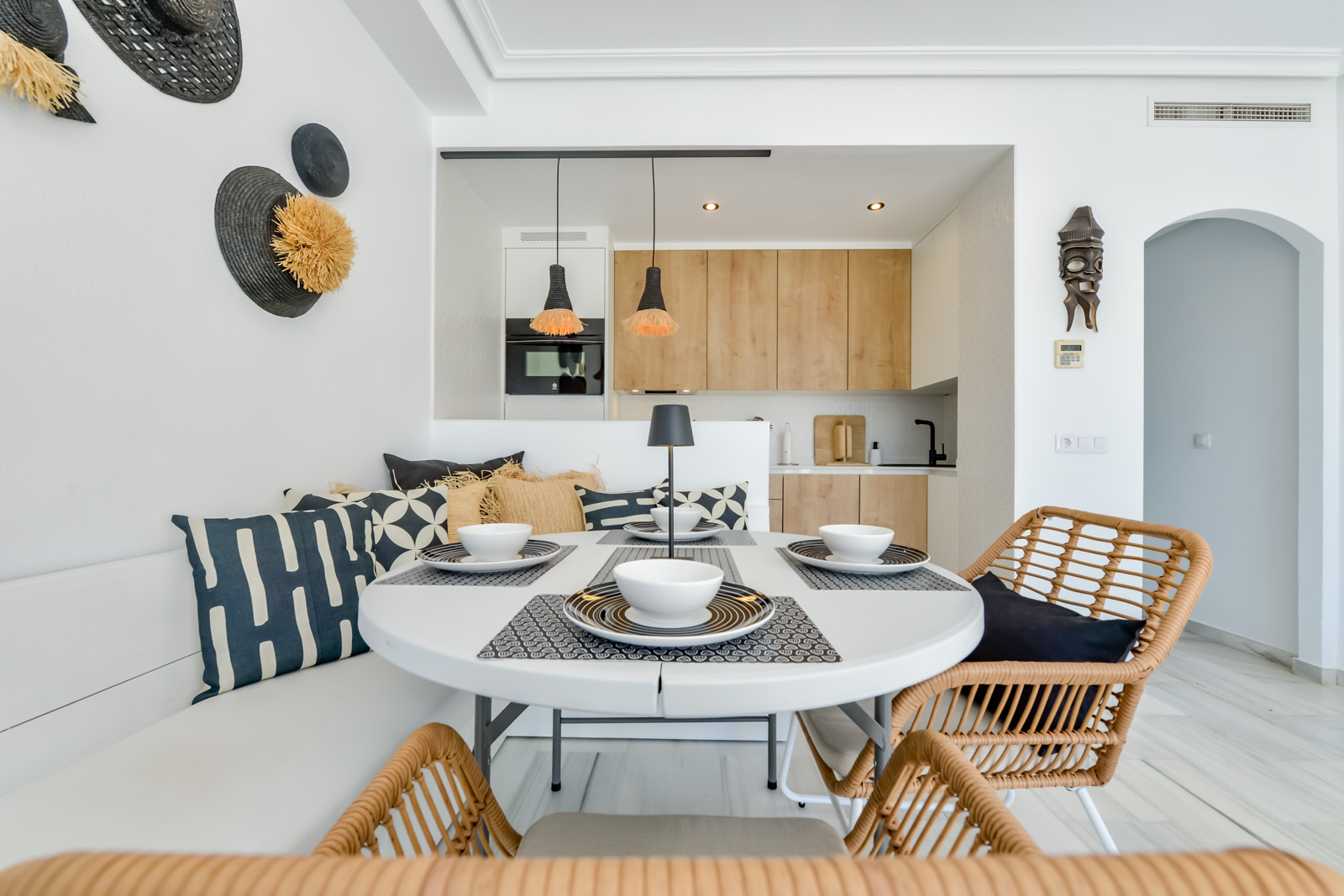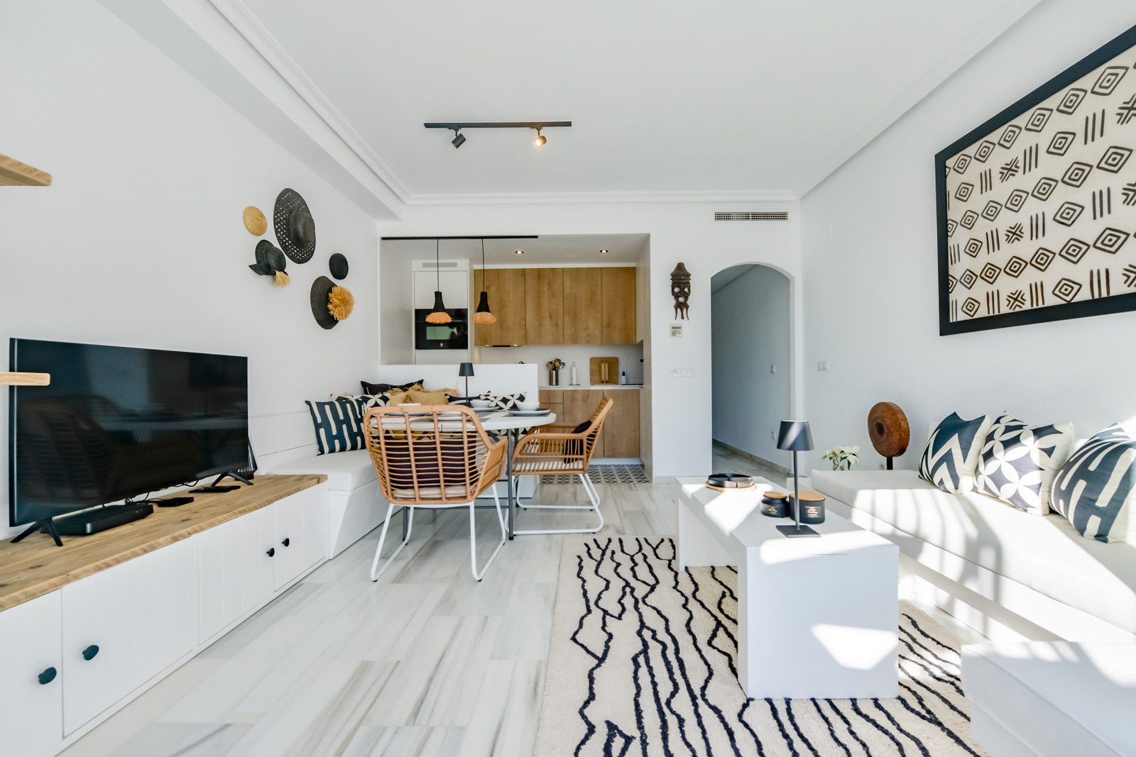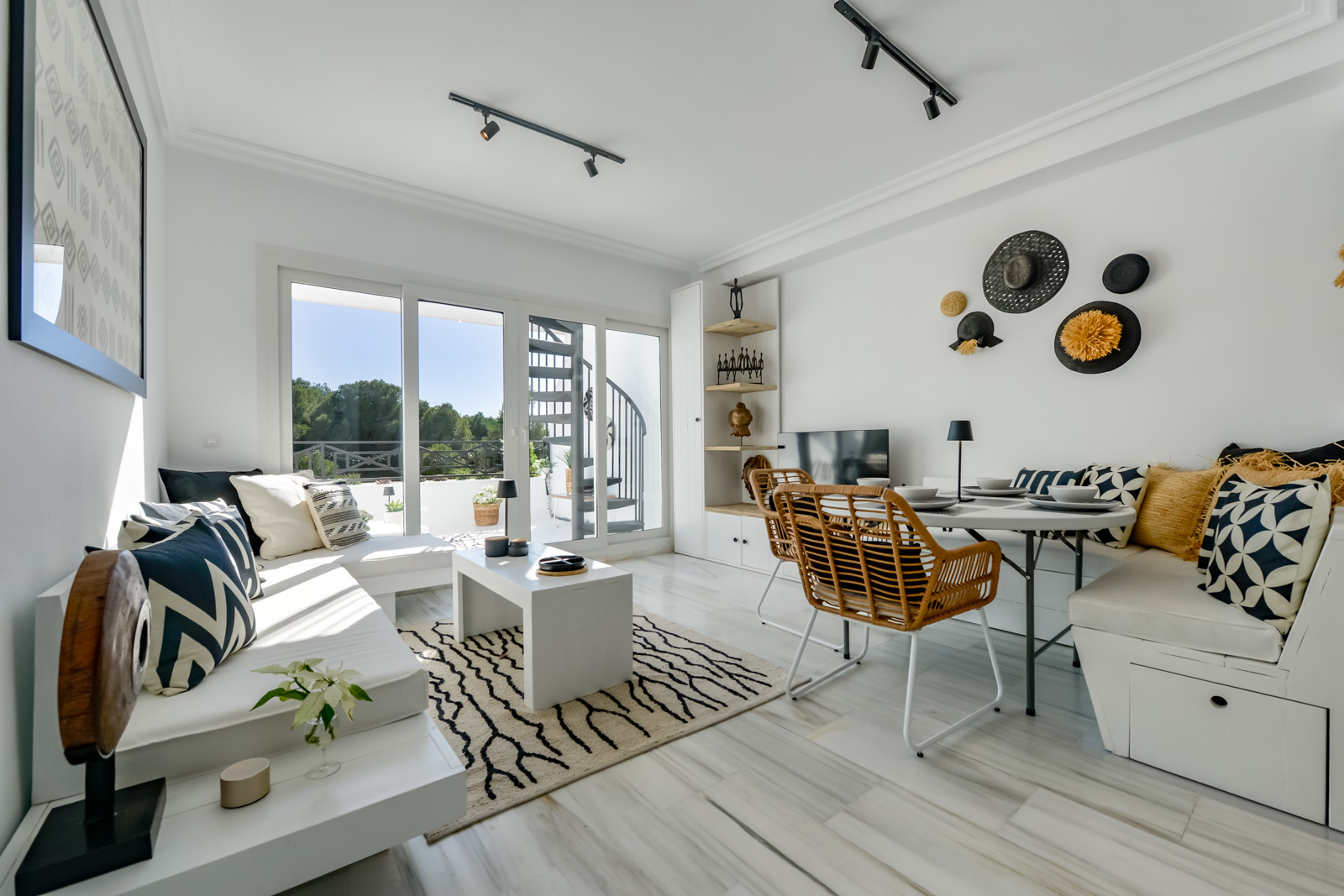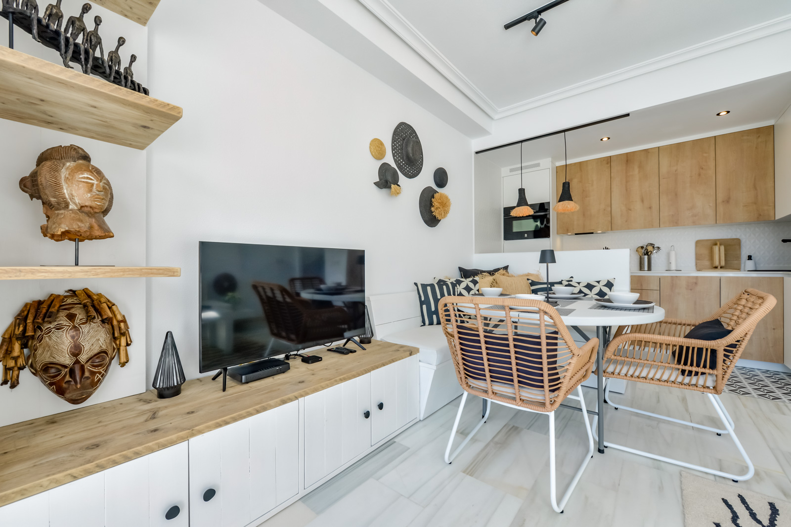Cet appartement lumineux de style bohème dispose de plusieurs terrasses, dont une terrasse rooftop avec salon d'extérieur, douche extérieure et un petit bassin (ouvert du 01/05 au 15/10) pour vous rafraîchir durant les journées chaudes. Toutes les terrasses offrent des vues panoramiques sur la nature, la mer et la magnifique baie de Puerto Blanco. On ne se croirait pas en ville !