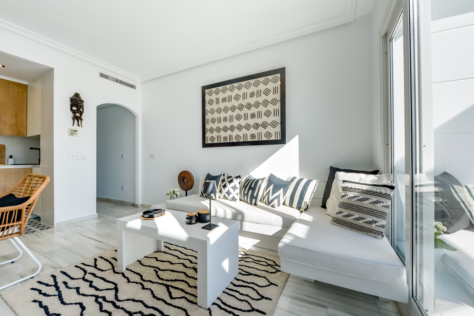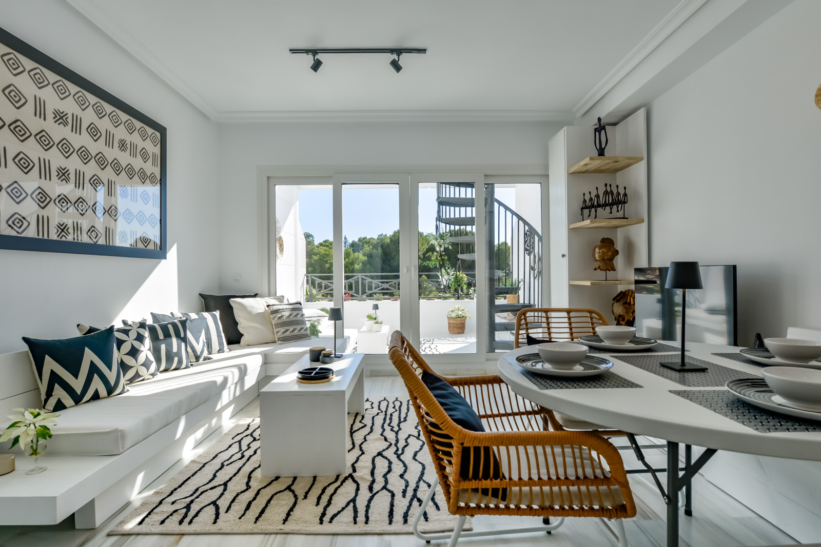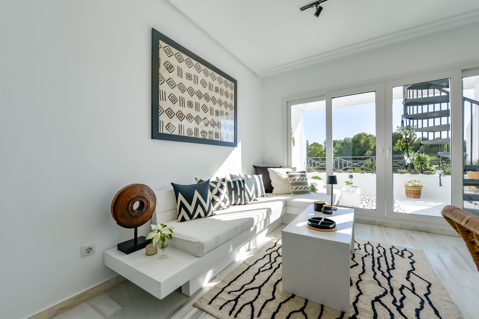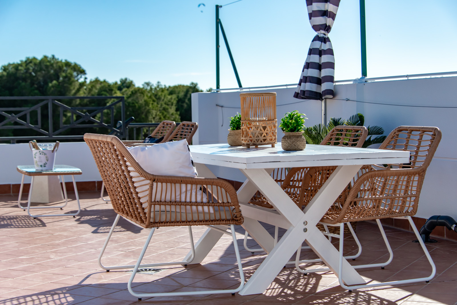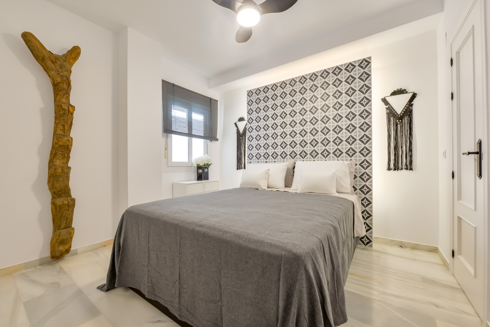 Cet appartement lumineux de style bohème dispose de plusieurs terrasses, dont une terrasse rooftop avec salon d'extérieur, douche extérieure et un petit bassin (ouvert du 01/05 au 15/10) pour vous rafraîchir durant les journées chaudes. Toutes les terrasses offrent des vues panoramiques sur la nature, la mer et la magnifique baie de Puerto Blanco. On ne se croirait pas en ville !