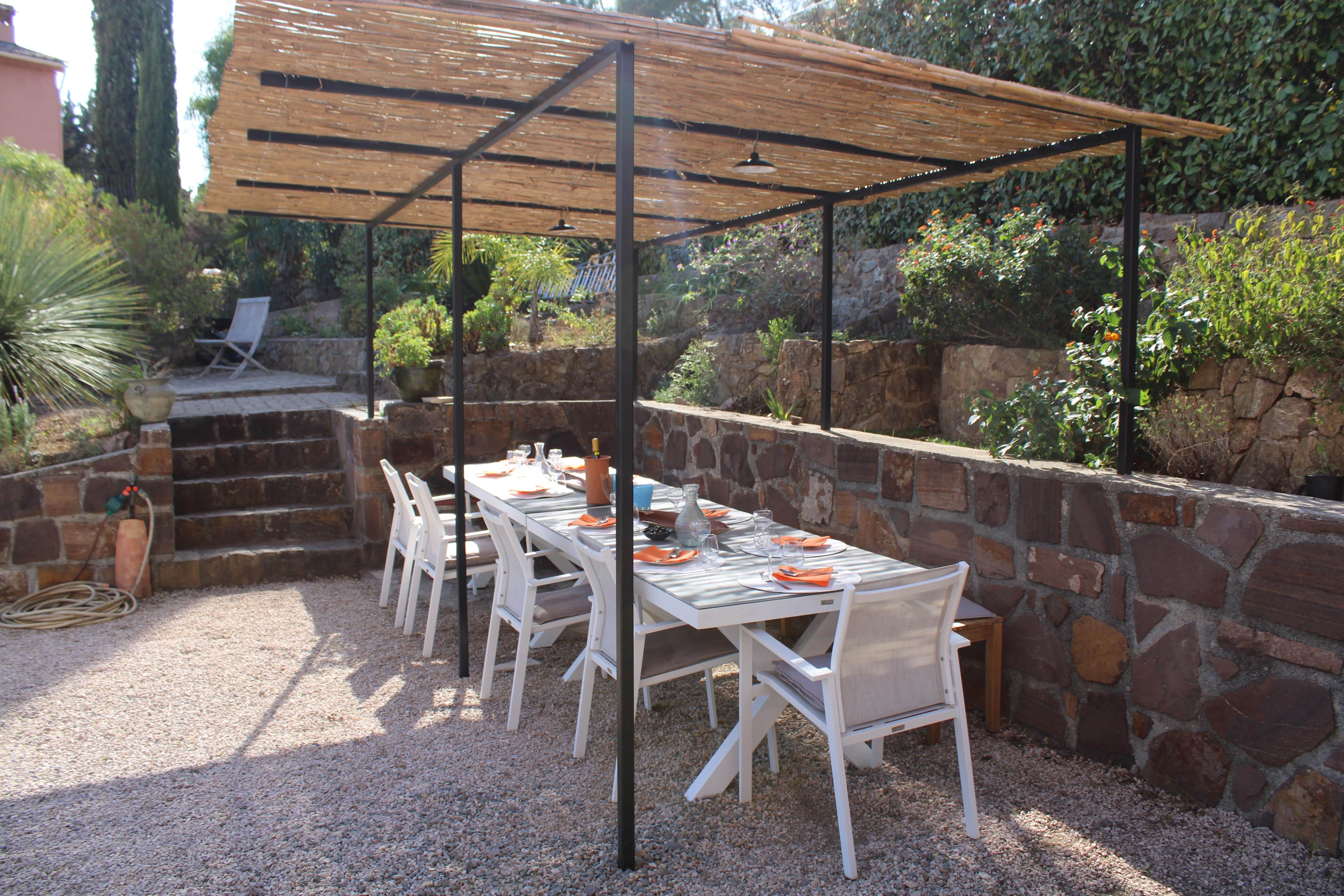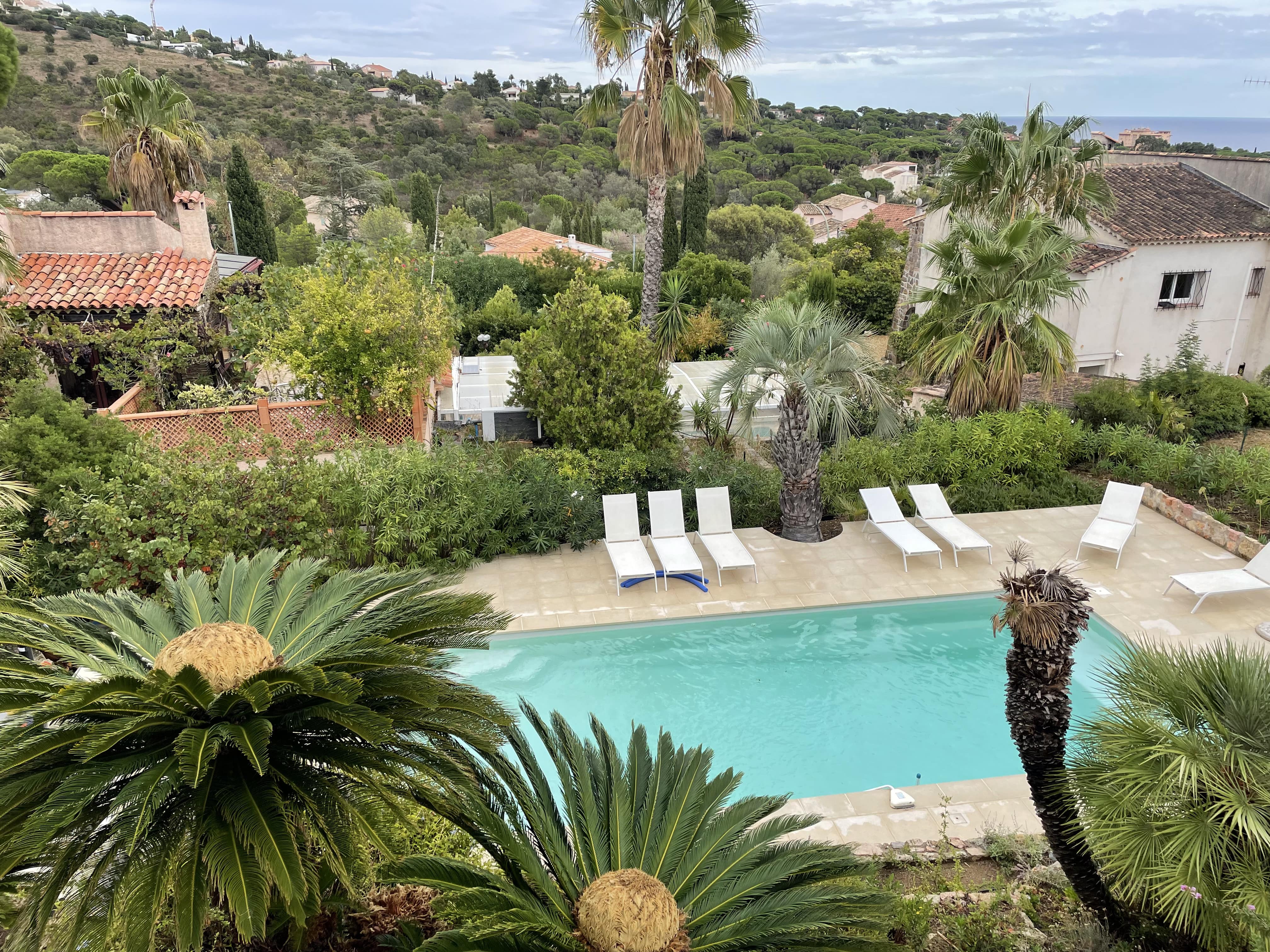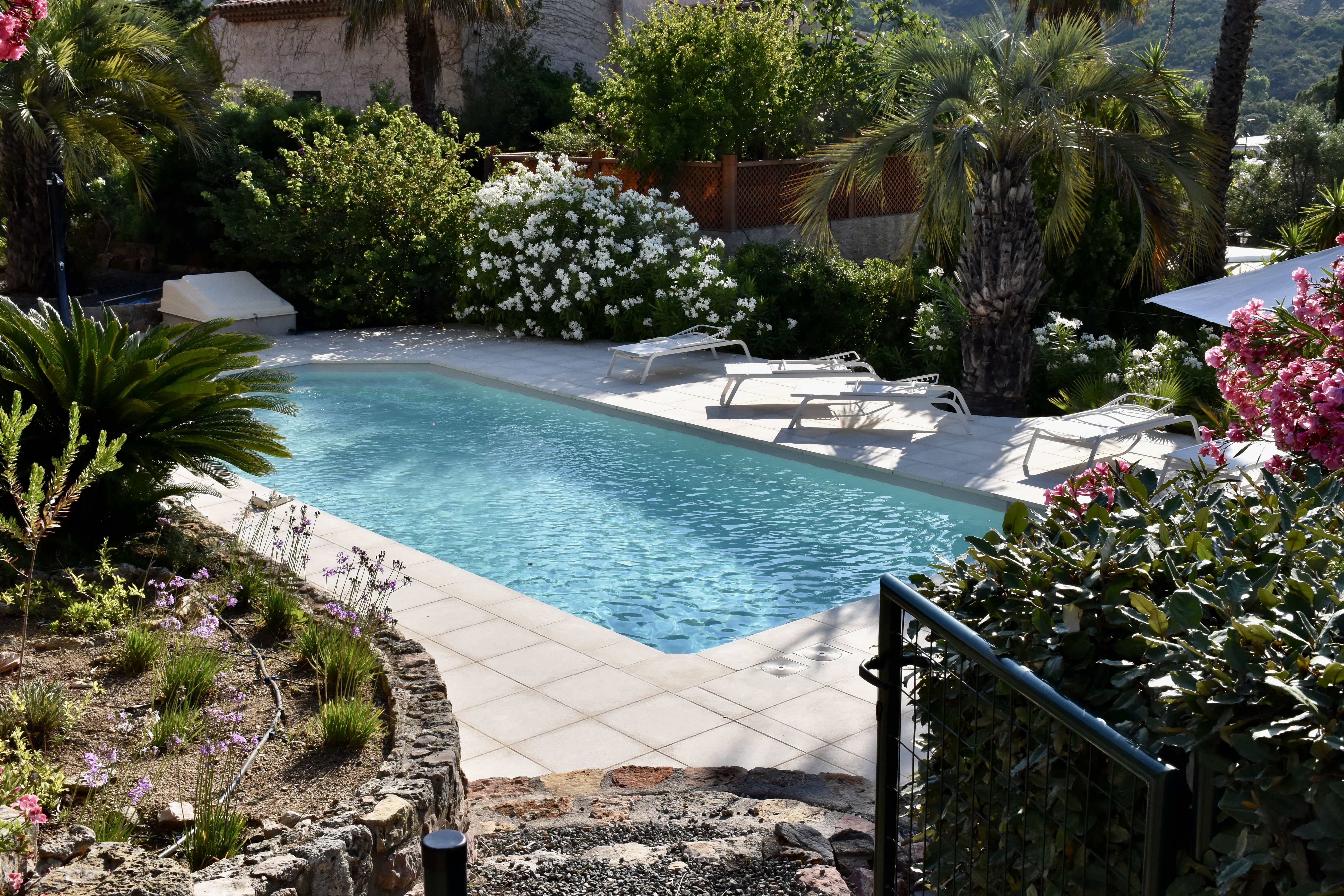 Extérieur : Un jardin rempli de palmiers Idéale pour les familles ou groupes d’amis, cette villa de vacances à la Côte d'Azur vous séduira par son beau jardin arboré et sa grande piscine privée (10 x 4 m, profondeur 1,80 m), pouvant être chauffée sur demande. Située en contrebas, la piscine est ouverte du 1 mai au 15 octobre et sur demande en avril. La piscine est traitée au sel et équipée d'une alarme pour plus de sécurité. Elle est entourée d’une terrasse avec 10 chaises longues et une douche extérieure. Profitez également d’une piste de pétanque, d’un baby-foot et de nombreux jeux de société à votre disposition. Enfin, une grande terrasse plein sud, attenante à la maison, vous accueille avec une table pour 14 convives sous une pergola couverte.
