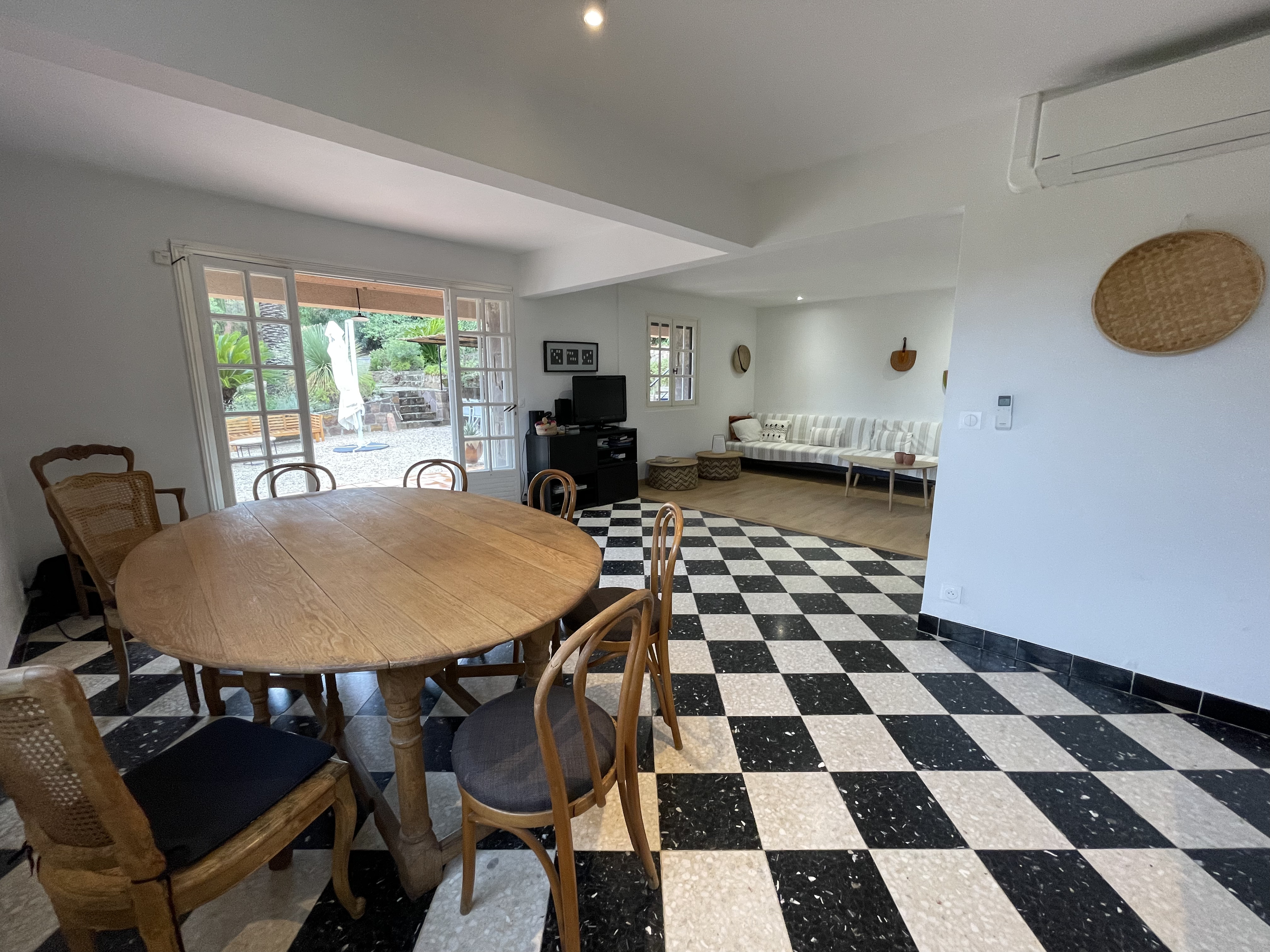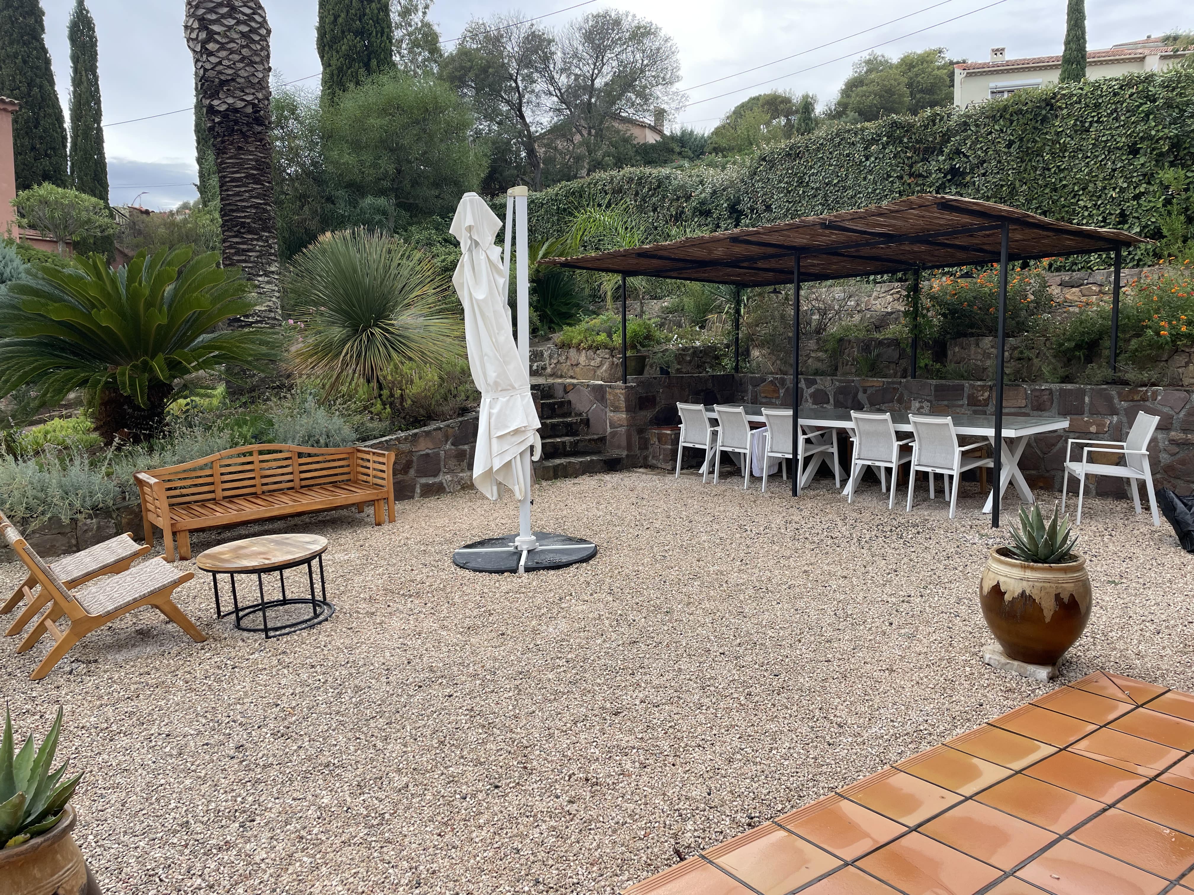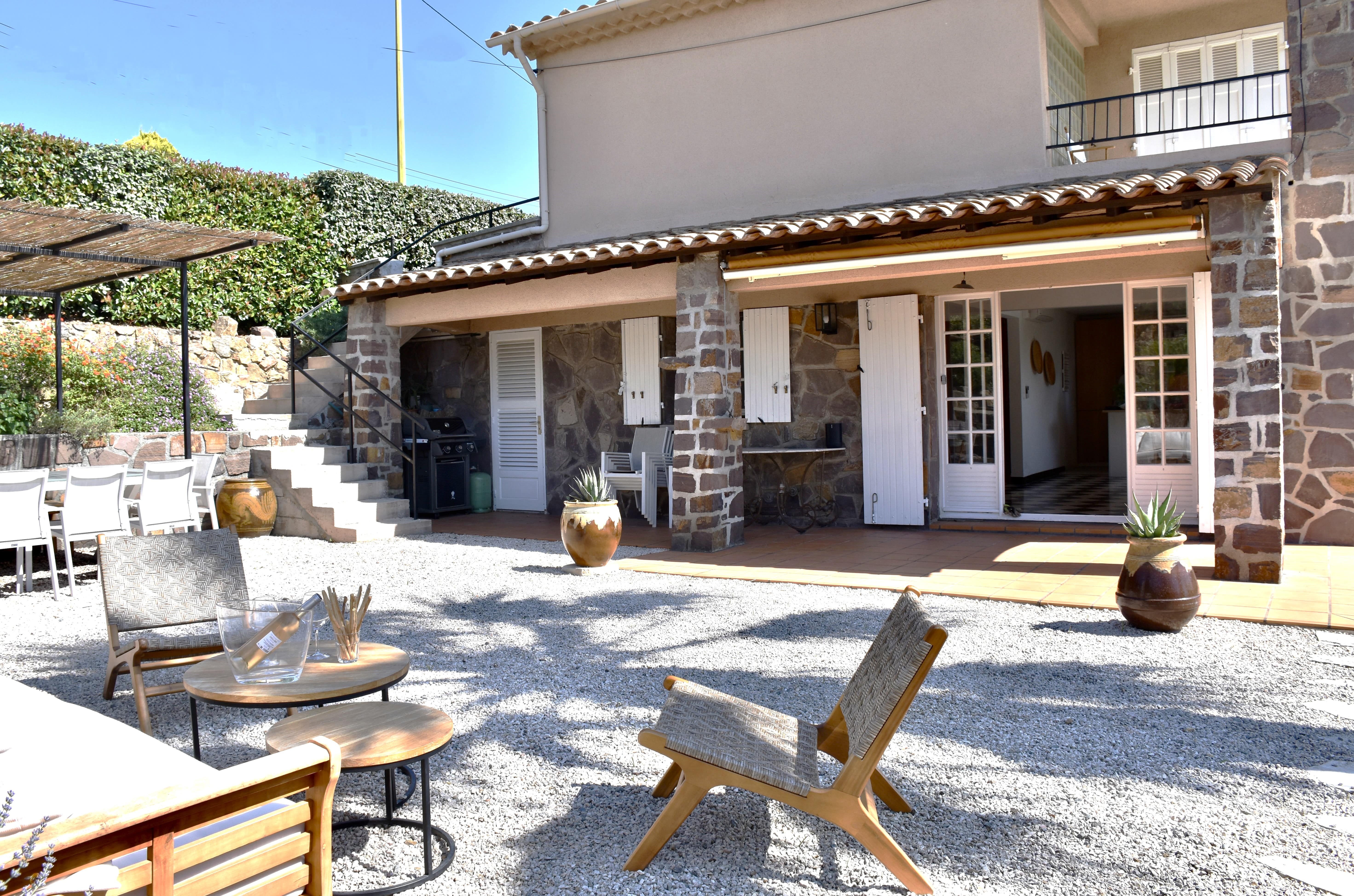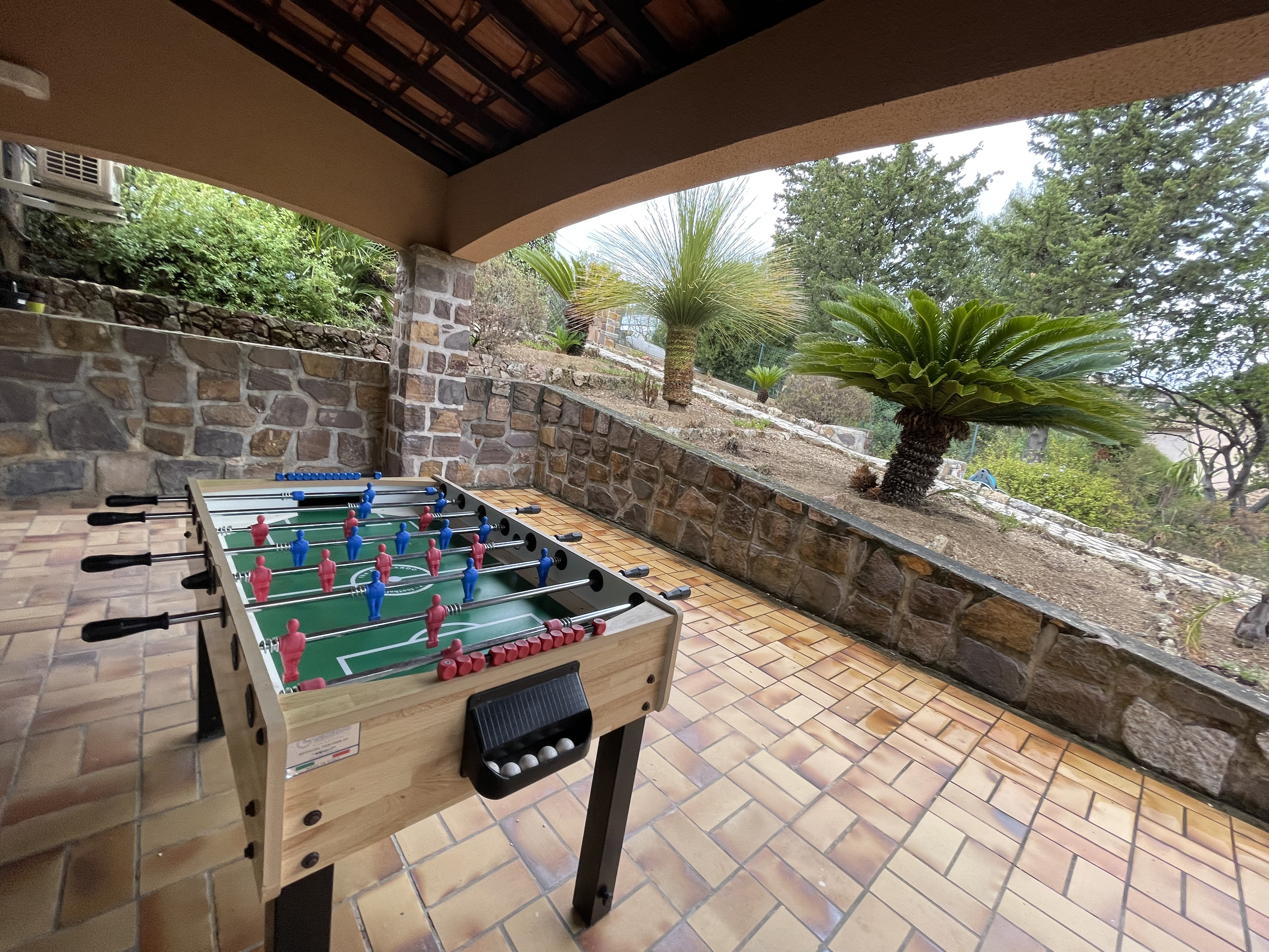 Extérieur : Un jardin rempli de palmiers Idéale pour les familles ou groupes d’amis, cette villa de vacances à la Côte d'Azur vous séduira par son beau jardin arboré et sa grande piscine privée (10 x 4 m, profondeur 1,80 m), pouvant être chauffée sur demande. Située en contrebas, la piscine est ouverte du 1 mai au 15 octobre et sur demande en avril. La piscine est traitée au sel et équipée d'une alarme pour plus de sécurité. Elle est entourée d’une terrasse avec 10 chaises longues et une douche extérieure. Profitez également d’une piste de pétanque, d’un baby-foot et de nombreux jeux de société à votre disposition. Enfin, une grande terrasse plein sud, attenante à la maison, vous accueille avec une table pour 14 convives sous une pergola couverte.