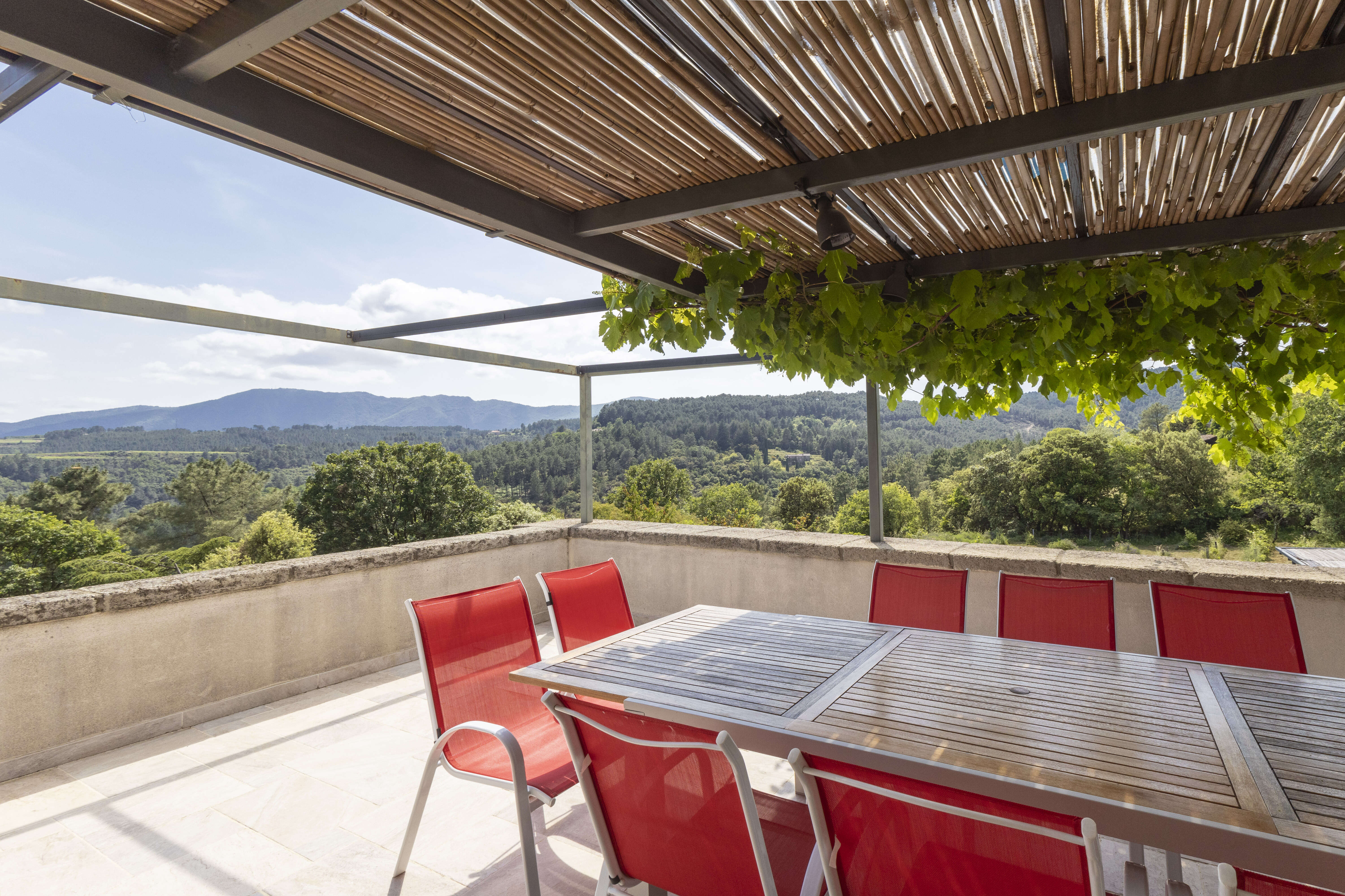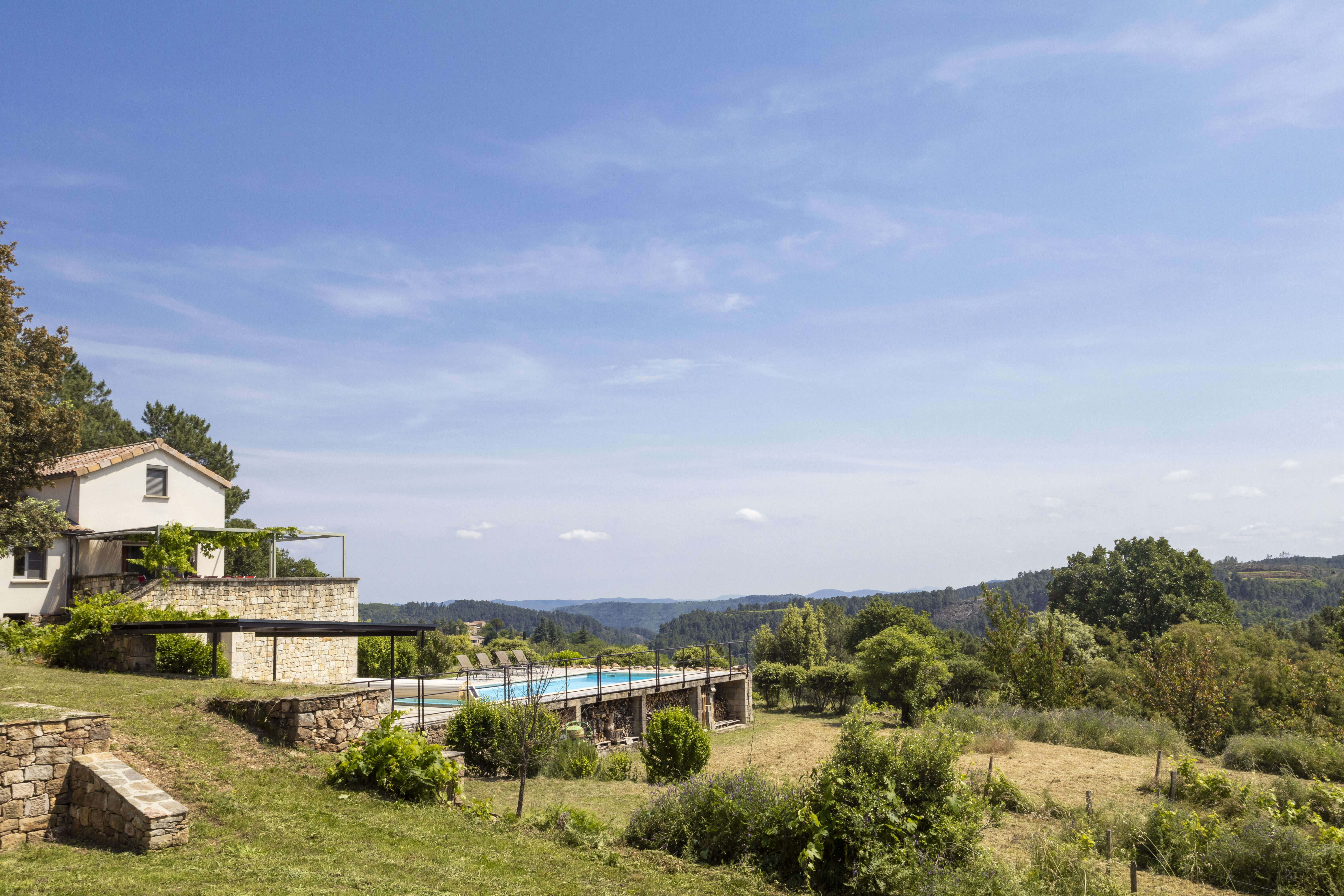 Découvrez la Villa Terre Rouge Haut, une magnifique villa avec piscine privée pour 6 adultes et 2 enfants. Nichée dans les paysages spectaculaires de l'Ardèche méridionale, à la lisière du Parc national des Cévennes, elle offre une vue panoramique sur la vallée et l'impressionnant massif du Serre de Barre.