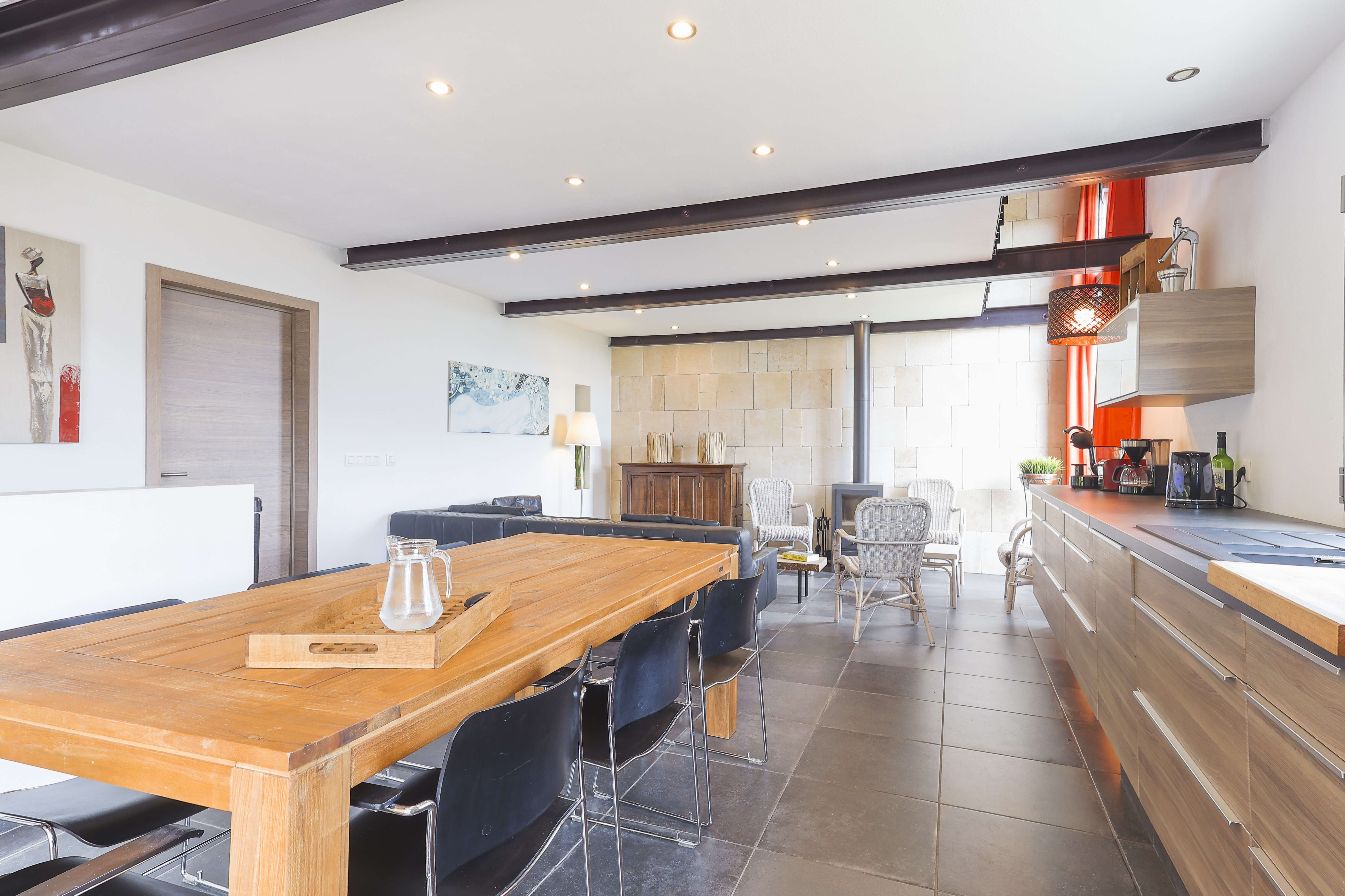 Cette maison spacieuse et bien conçue s'étend sur deux niveaux si vous louez la Villa Terre Rouge en entier (pour 10 à 12 personnes). Ici vous ne louez que la partie du haut de la villa, soit pour 6 personnes (+ éventuellement 2 enfants dans la mezzanine).