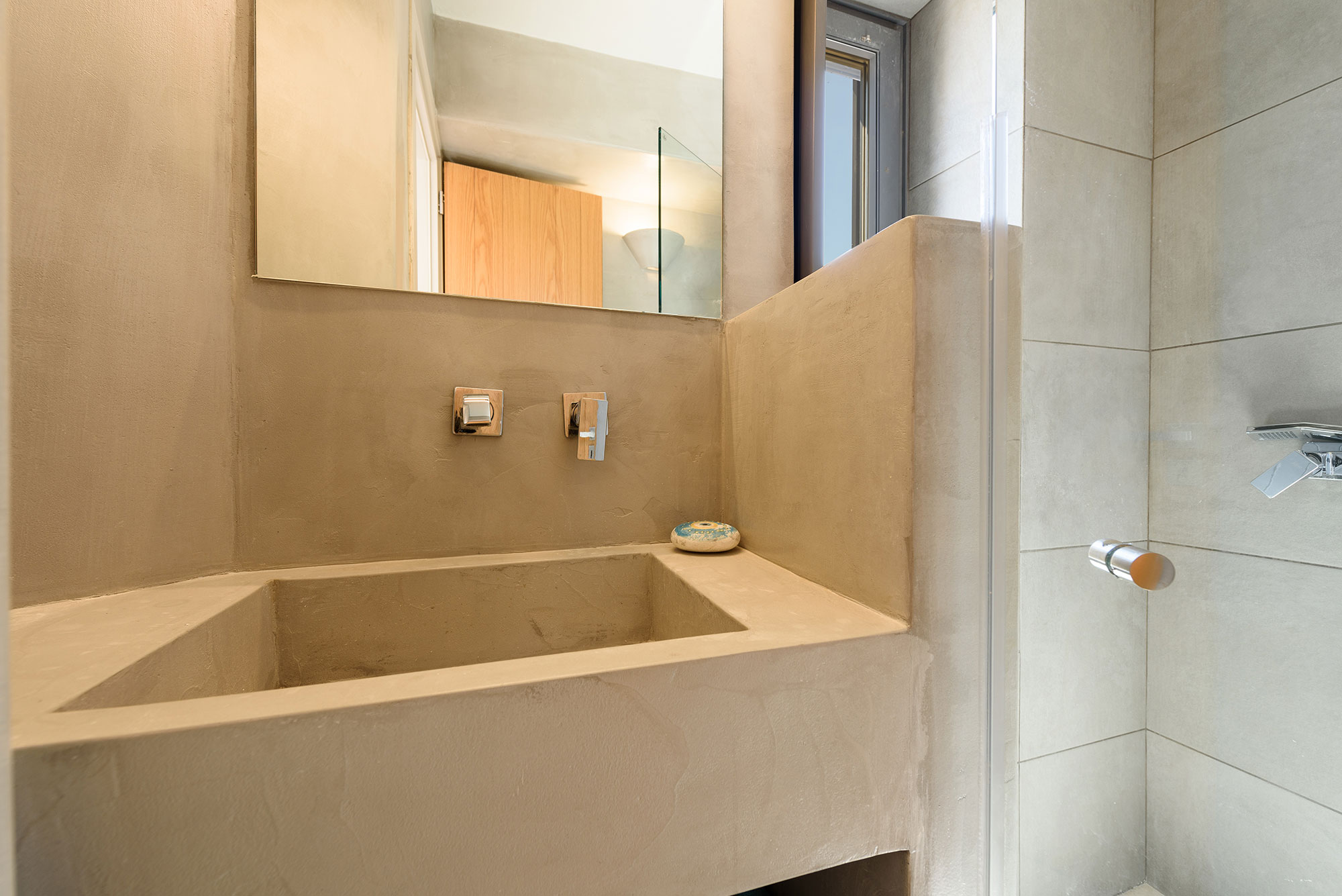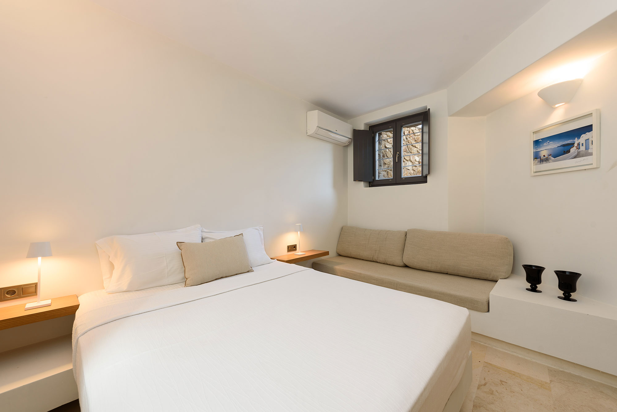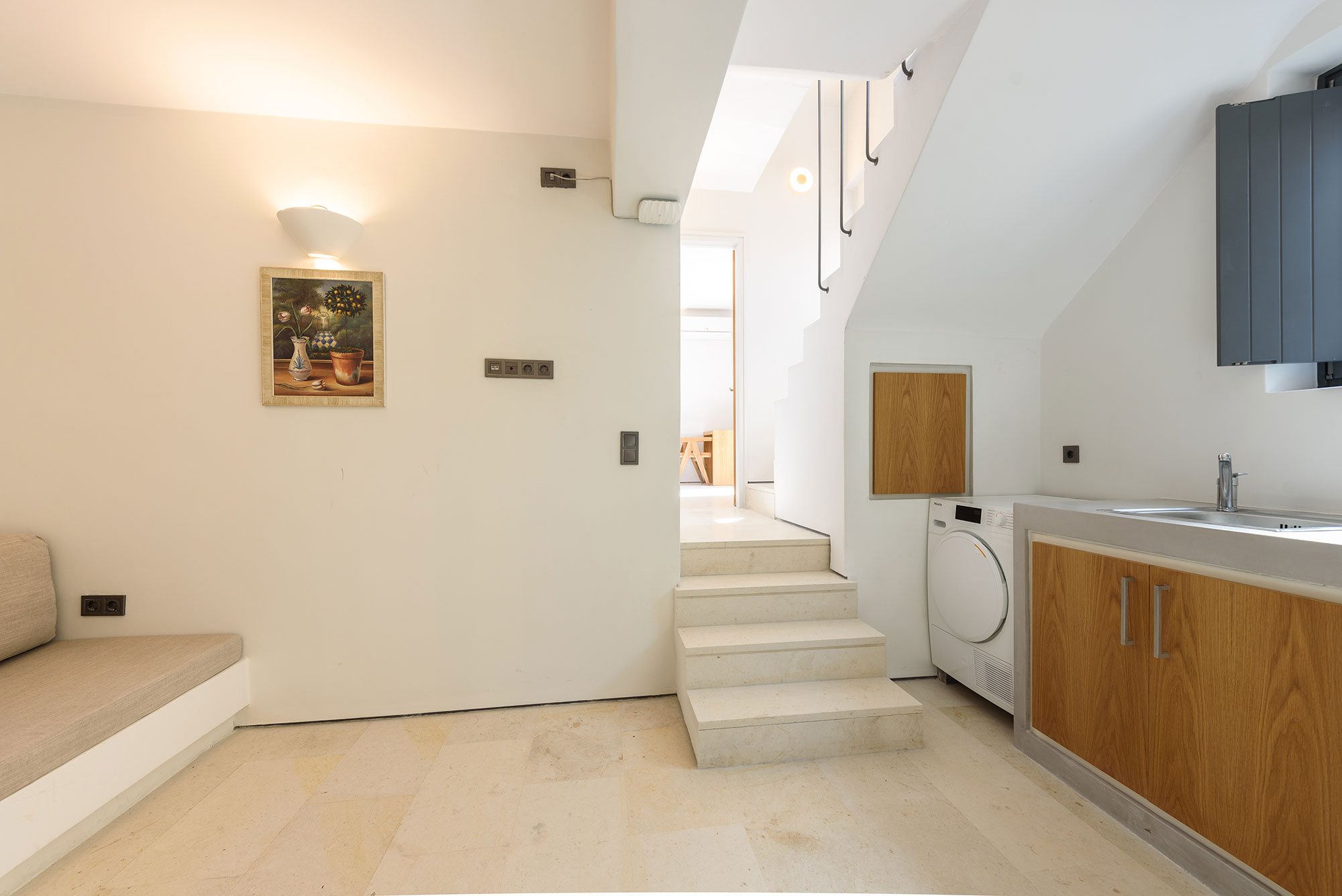 Intérieur En entrant par la grande porte en bois, vous êtes accueilli dans un intérieur élégant et moderne. Au demi-étage, vous trouverez une chambre spacieuse avec une salle de bains privative et une vue imprenable sur la mer. Au rez-de-chaussée, vous trouverez deux chambres confortables, chacune avec une salle de bains séparée, ainsi qu'un salon confortable où vous pourrez vous détendre après une journée de soleil et de mer. Toutes les pièces sont climatisées.
