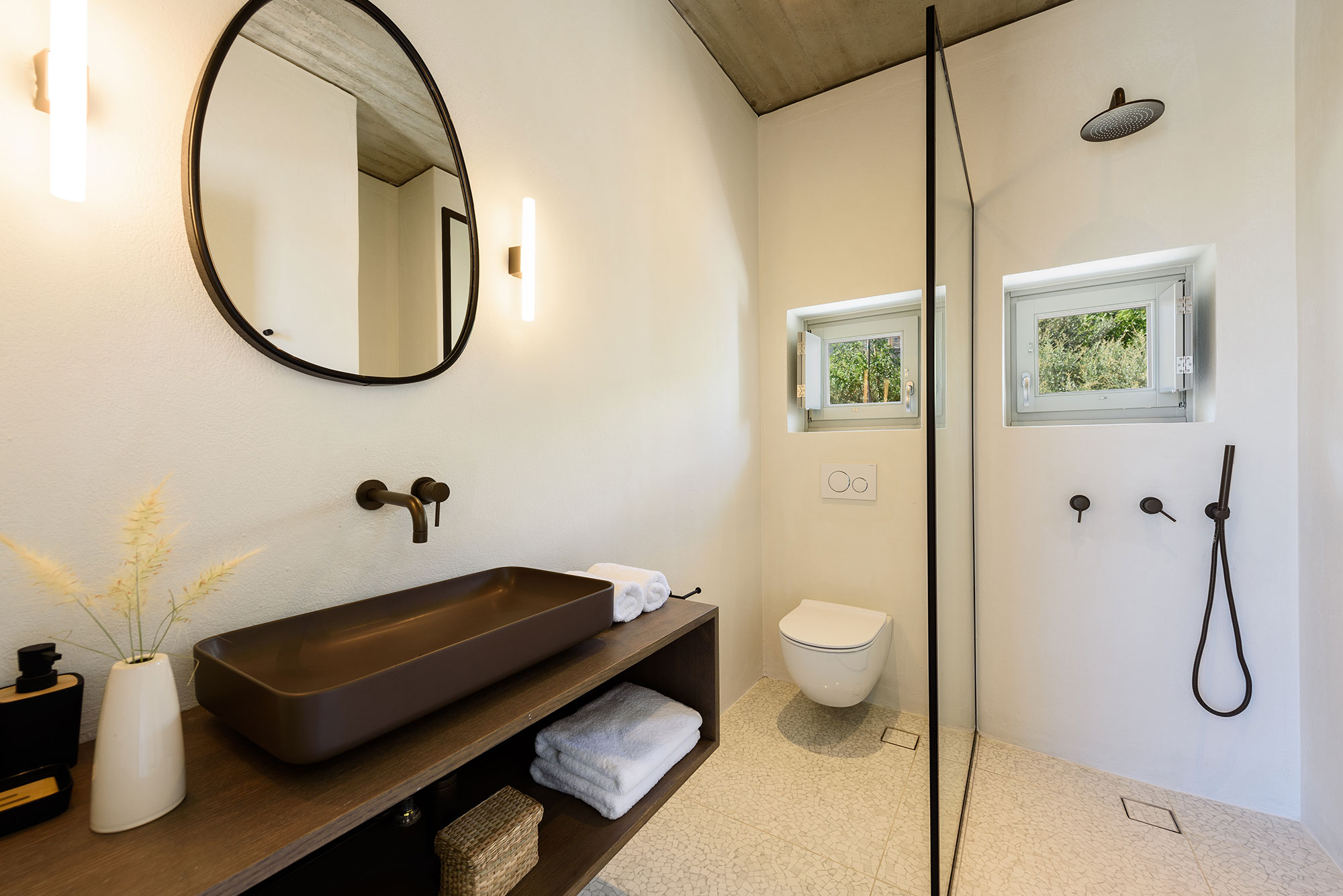 Extérieur De larges baies vitrées s’ouvrent sur la terrasse orientée Sud et sur la piscine privée (3,7 x 8 m), entourée de transats et de mobilier d’extérieur pour se détendre. Une terrasse couverte avec table à manger est également disponible pour profiter des repas en plein air, même aux heures les plus chaudes. Depuis la terrasse, vous pourrez admirer une vue panoramique sur les environs. Un parking privé avec carport est également à votre disposition.
