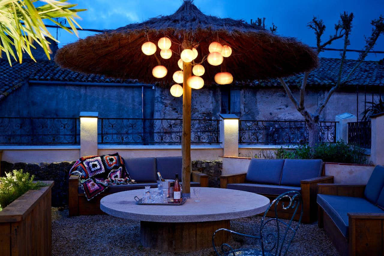 Vous pouvez discuter dans le salon extérieur de luxe. L'éclairage extérieur crée une atmosphère particulière.