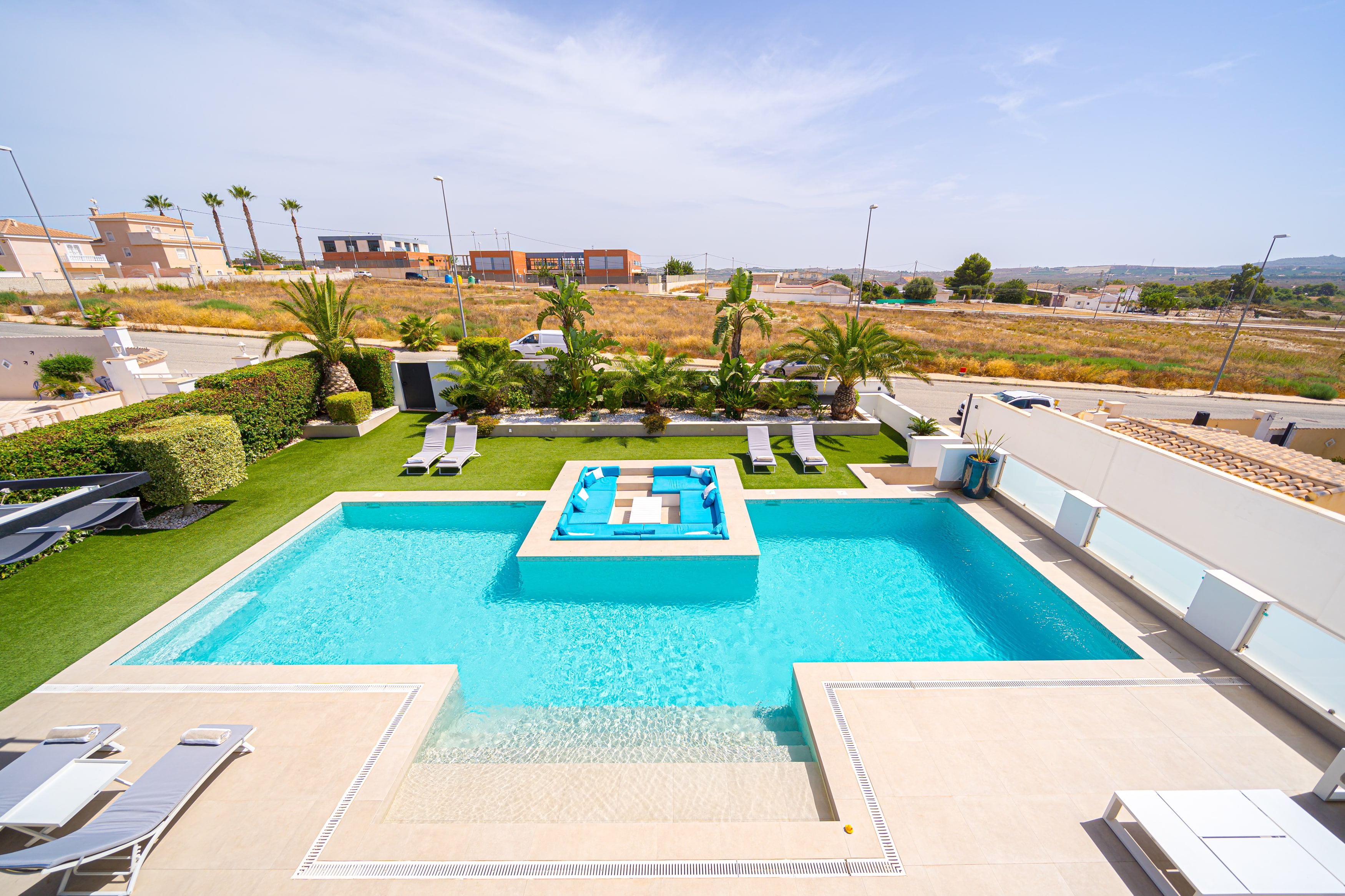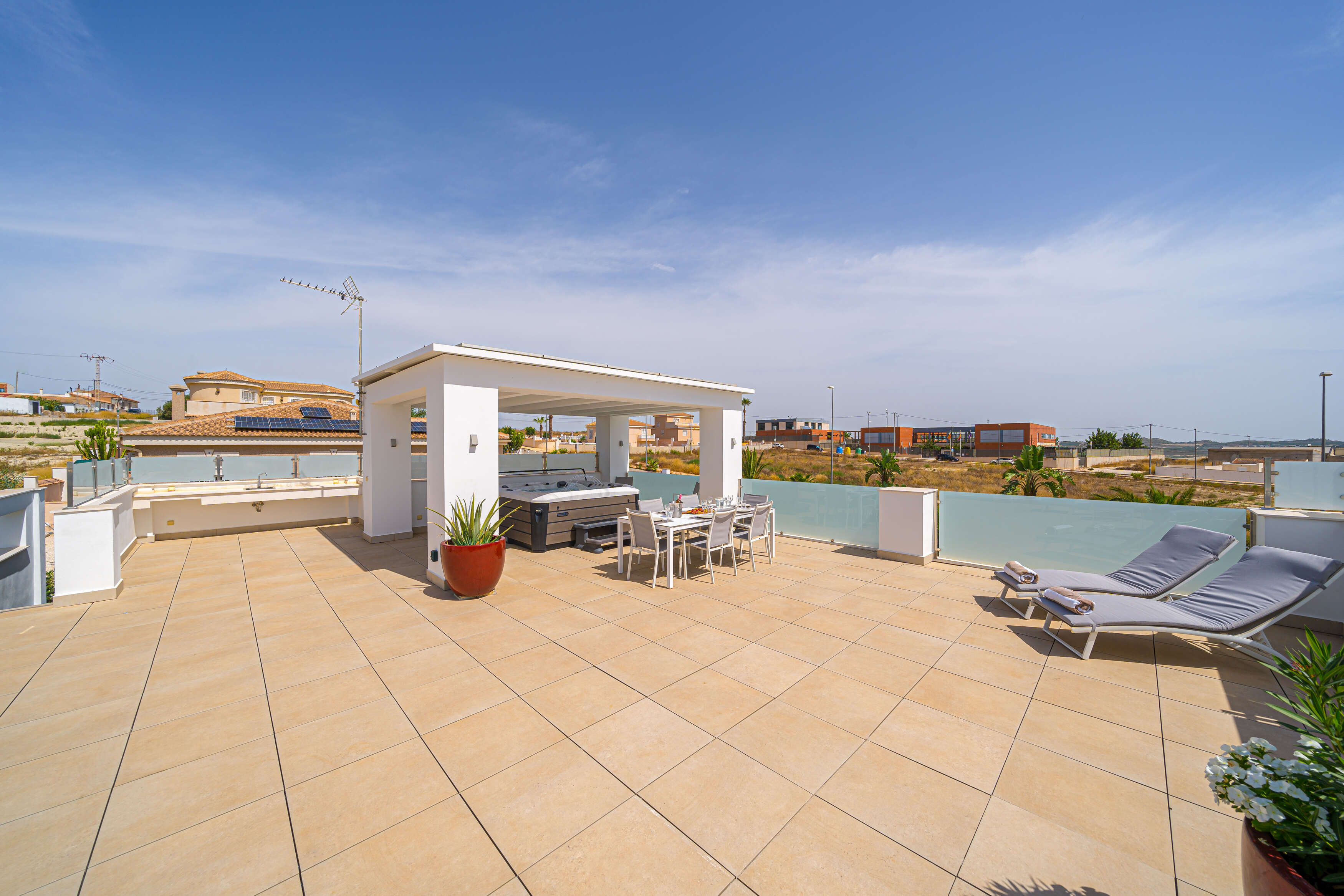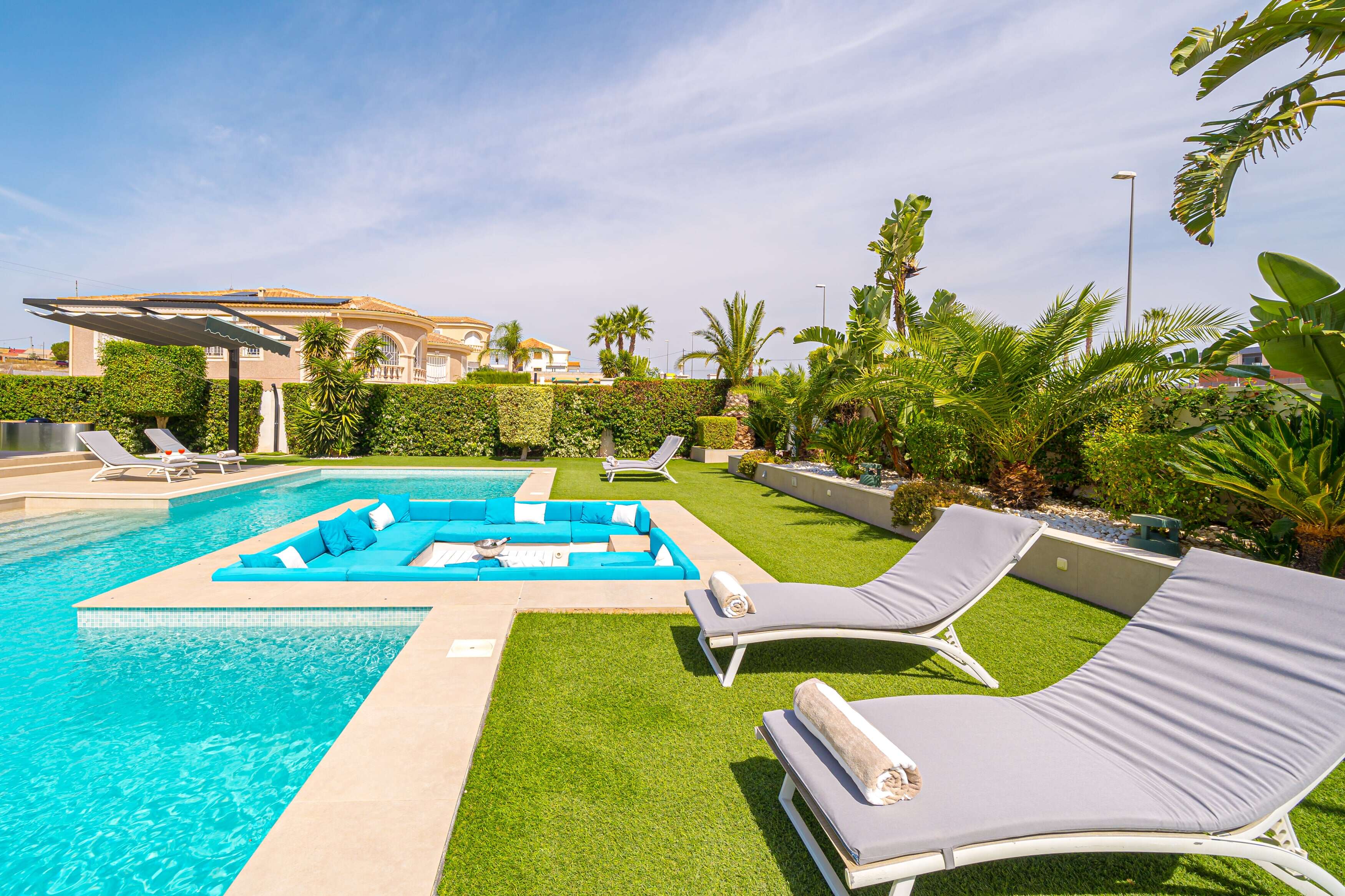 L'extérieur : Vie en plein air de luxe, du lever au coucher du soleil La Villa Torremendo est une luxueuse villa de vacances sur la Costa Blanca ensoleillée, avec plusieurs terrasses et salons agréables. La belle piscine est unique avec un coin salon joliment éclairé dans l'eau et permet de se détendre à l'état pur. Vous trouverez également une douche extérieure, un barbecue, une table de ping-pong et, sur le toit, un solarium avec une grande table à manger - tout ce qu'il faut pour passer de merveilleuses journées et soirées d'été. Le studio au rez-de-chaussée, accessible de l'extérieur, dispose d'une salle de douche privée et d'une kitchenette pour plus de confort.