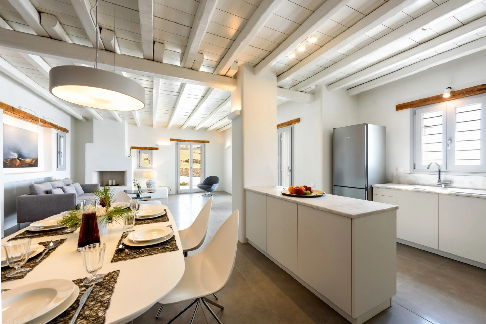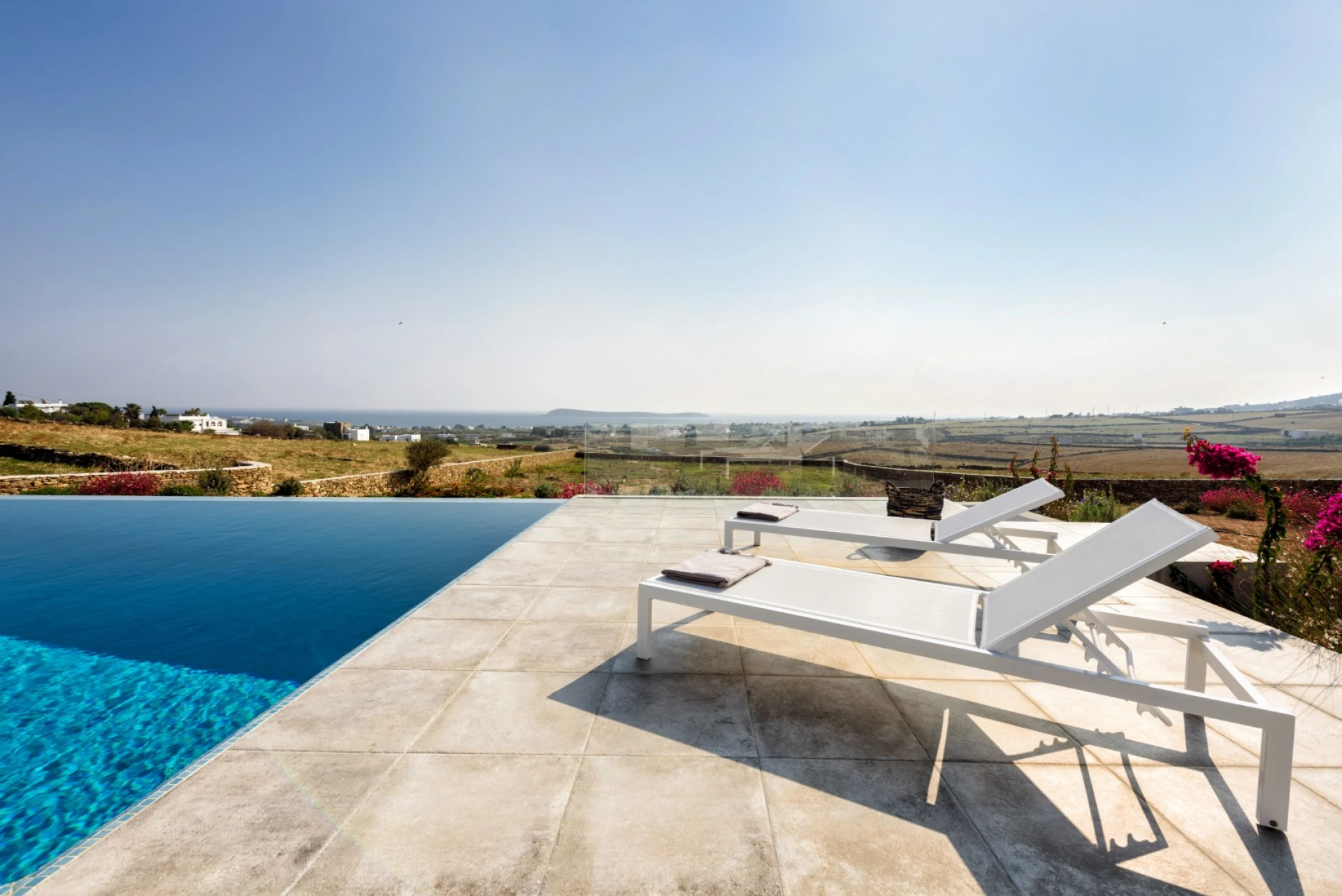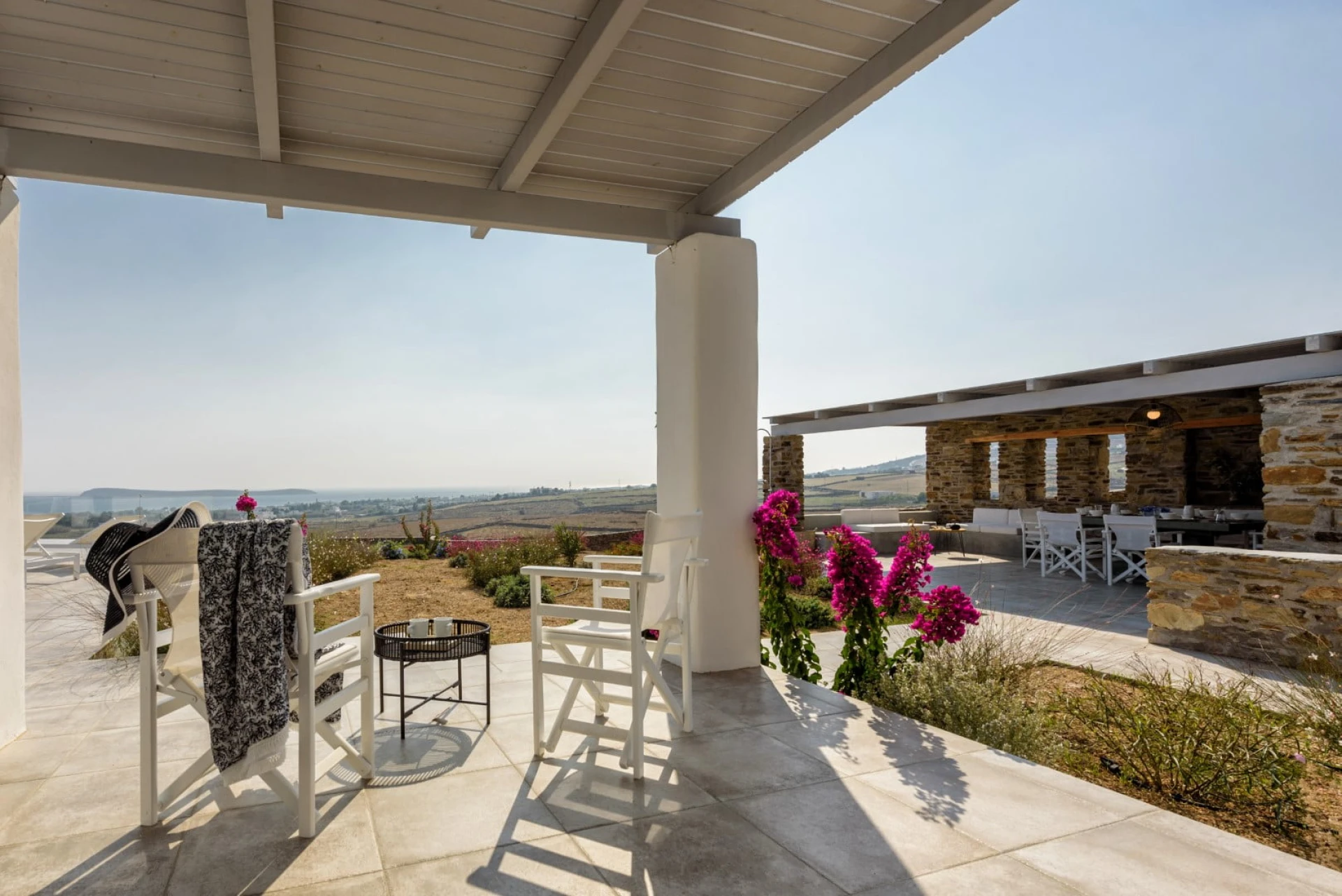 La piscine privée est entourée d'une terrasse ensoleillée avec des chaises longues, où vous pouvez profiter du soleil et des vues panoramiques. La pergola couverte, avec sa table à manger et son barbecue, offre un cadre idéal pour les repas en plein air, tout en respirant l'air frais de l'île. C'est l'endroit idéal pour se réunir, se détendre et profiter de la beauté des lieux.
