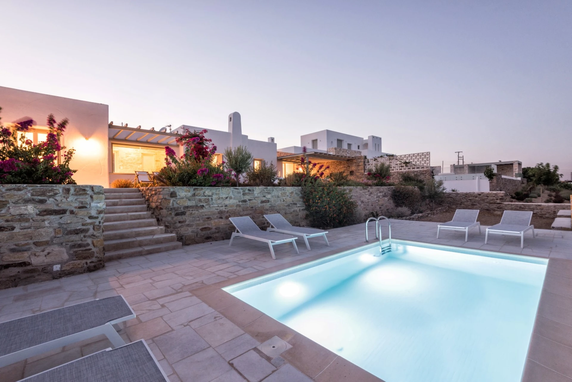 La villa bénéficie d’un emplacement privilégié, à proximité des plus belles plages, des villages pittoresques et des principaux points d’accès de l’île. Les plus belles plages de l'île sont à seulement quelques kilomètres : Golden Beach à 2km, Farangas Beach à 12km et Santa Maria Beach à 19km. Le Port de Paros-Antiparos se trouve à seulement 20 km tandis que l'aéroport à seulement 16km. De nombreux villages typiques valent également le détour comme Piso Livadi à 5km, Lefkes à 10 km ou Naousa à 15km. Parikia et son port se trouve à seulement 20km.