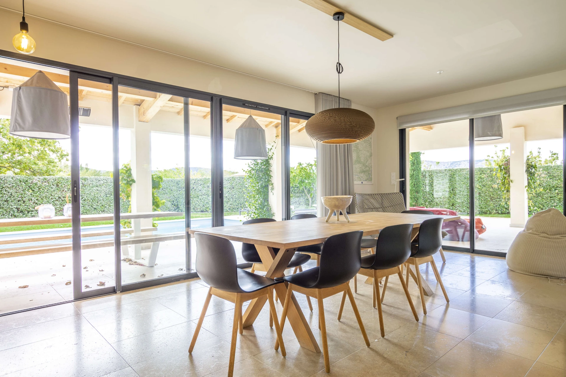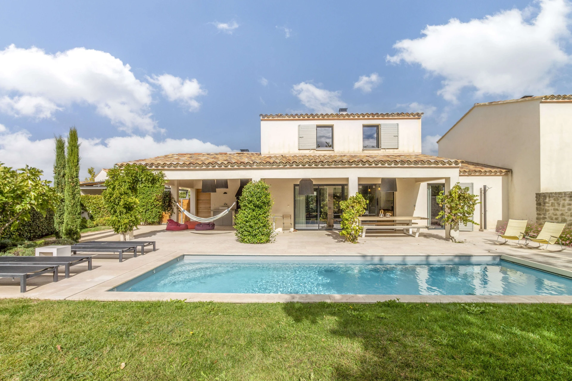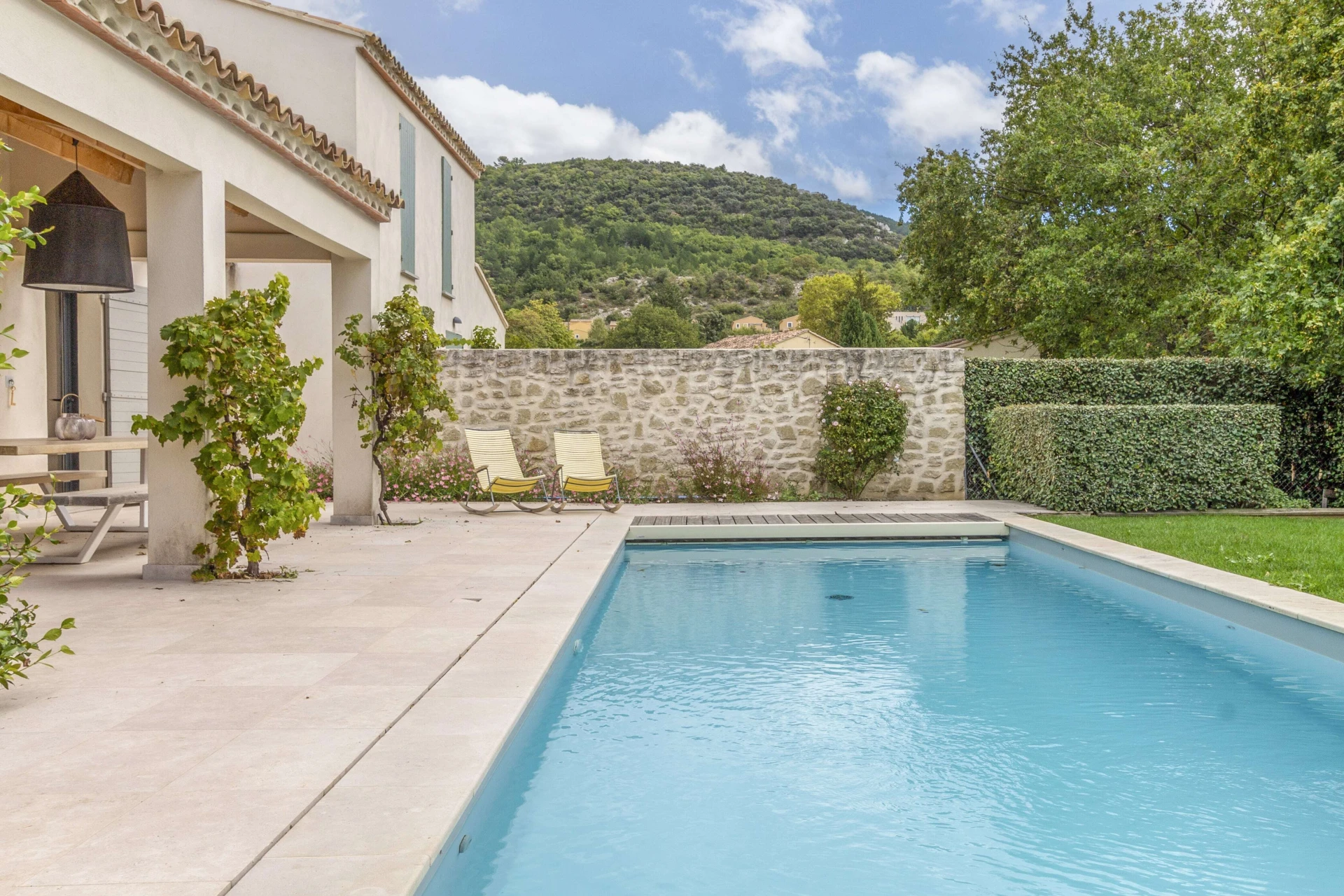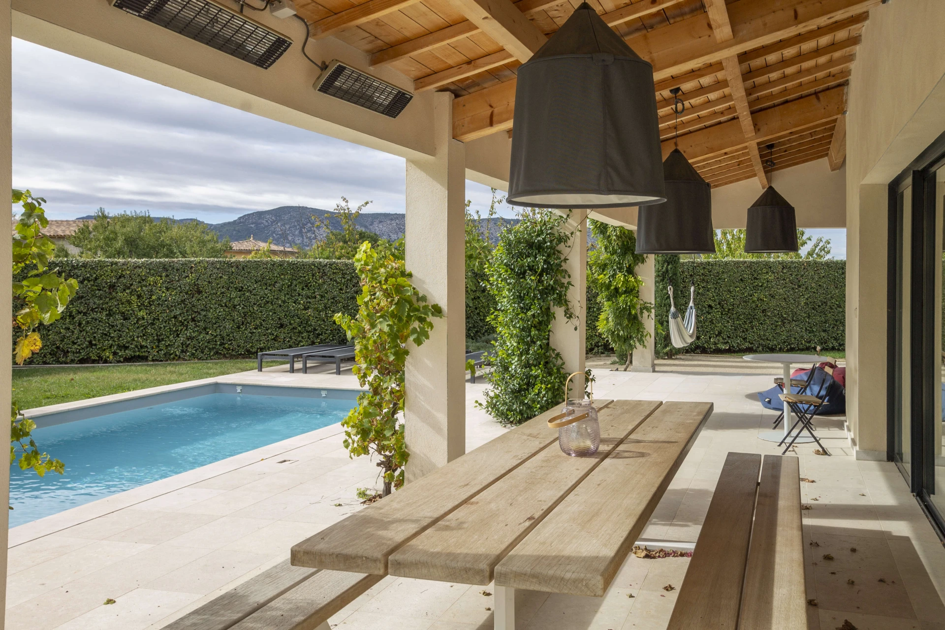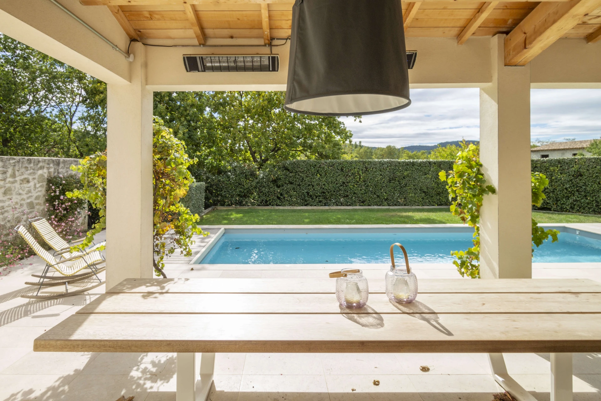 La maison de vacances avec piscine privée et jardin clos a tout pour passer d'agréables vacances à Malaucène. L'intérieur est luxueusement meublé avec un design danois. La belle pièce à vivre avec cuisine ouverte donne directement sur la terrasse couverte dotée d'une cuisine d'été et d'un barbecue. Il y a une chambre avec salle de bain au rez-de-chaussée qui a également un accès direct à la terrasse et à la piscine privée. La maison est donc accessible aux personnes à mobilité réduite. Il y a un système de refroidissement qui peut réduire la température des pièces jusqu'à 22°C lors de vagues de chaleur extrêmes.