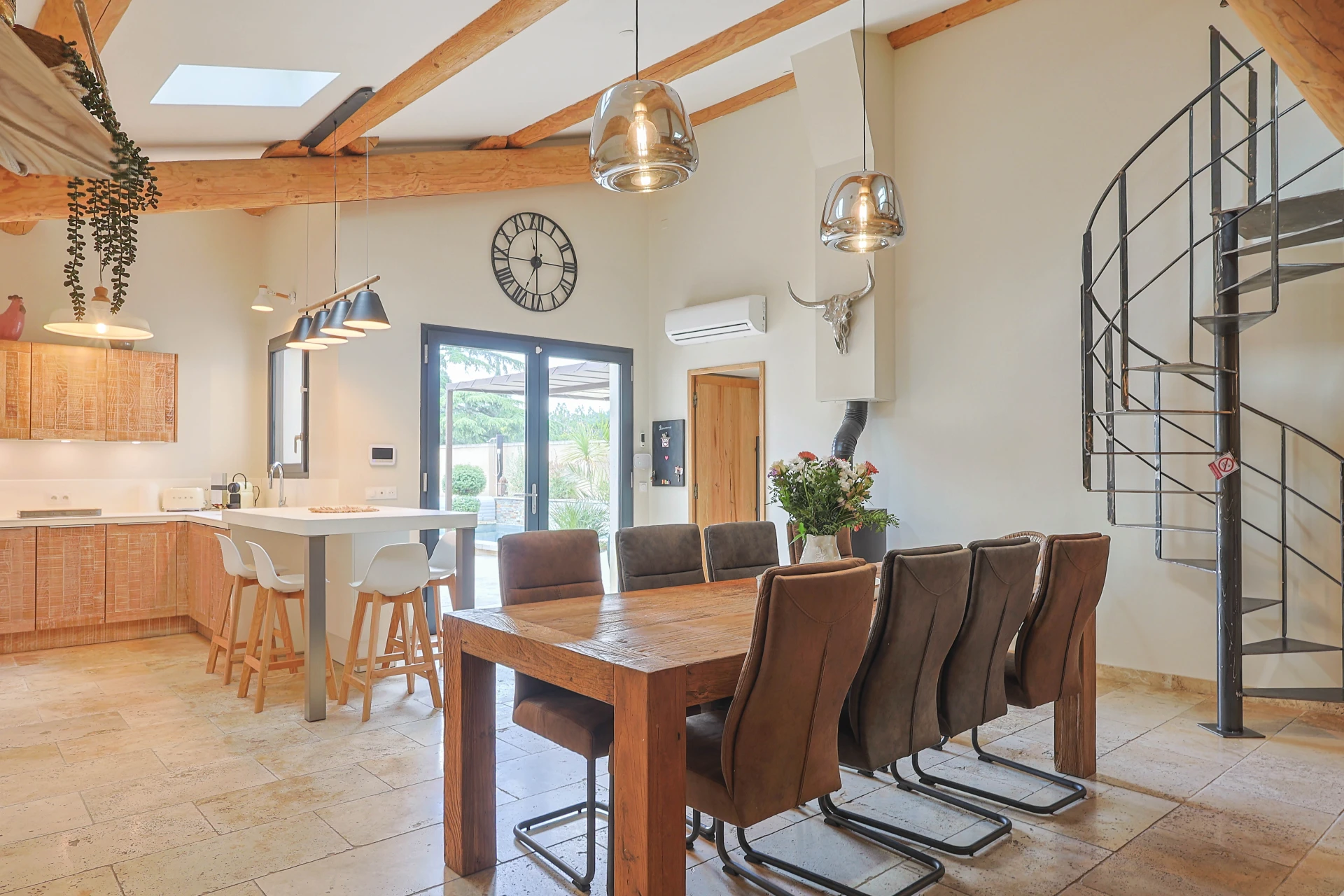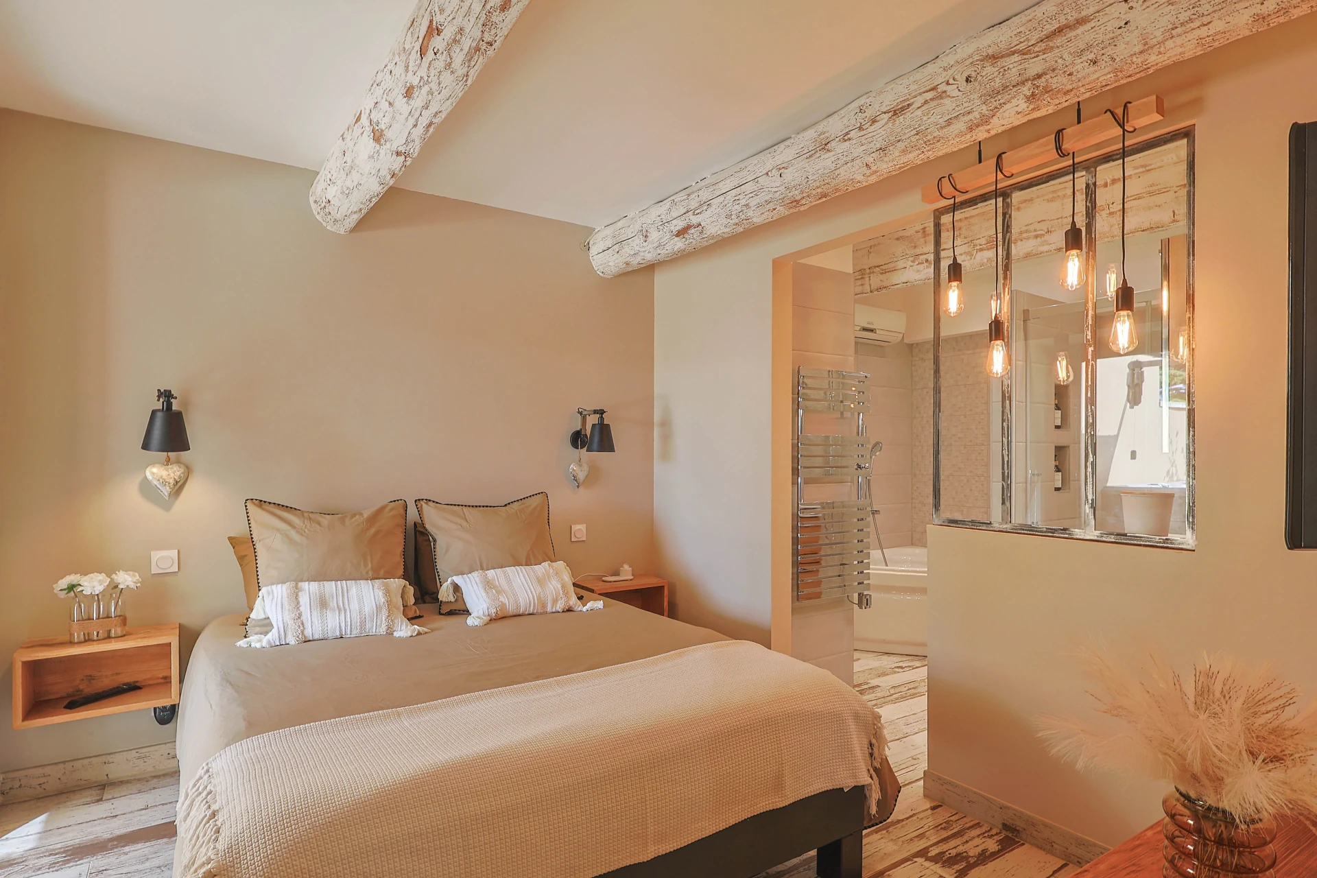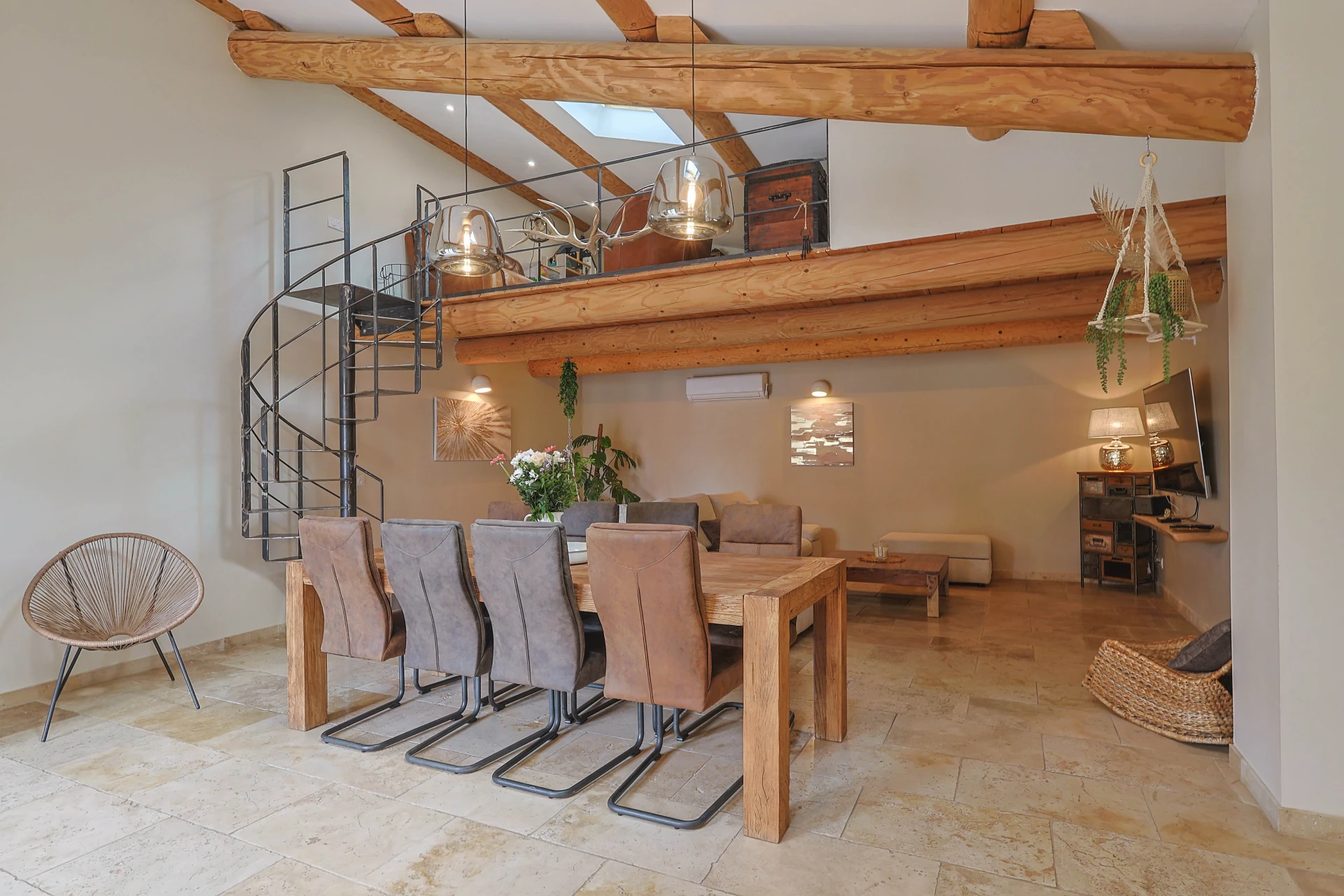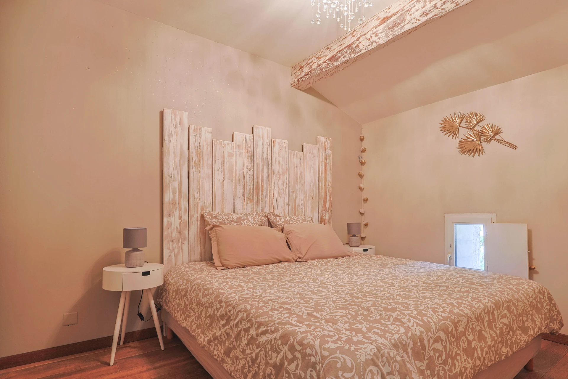 Cette maison de vacances pour 6 personnes en Provence est très bien équipée pour assurer un maximum de confort durant votre séjour. Une cuisine ouverte entièrement équipée donne directement sur une jolie table à manger ainsi que sur un salon convivial. Le séjour est orné de belles poutres en bois typiques de la région et dégage une atmosphère cocoon et chaleureuse. De plus, le séjour est entièrement climatisé. Toujours au rez-de-chaussée se trouve une première chambre double avec sa salle de bain privative. A l'étage, vous trouverez les deux autres chambres à coucher se partageant une salle de douche. La climatisation se trouve dans le couloir à l'étage, et diffuse bien dans les chambres à coucher.