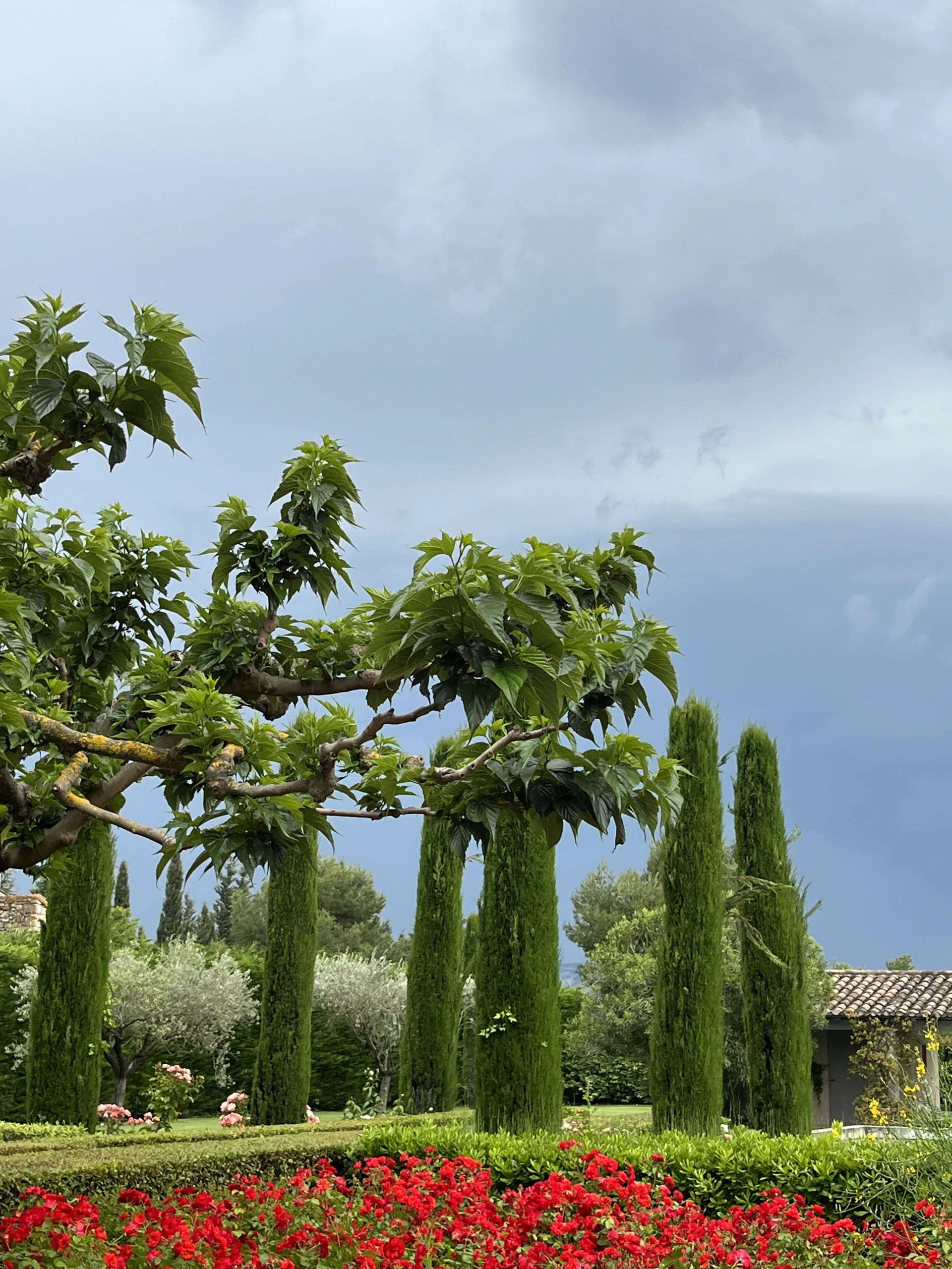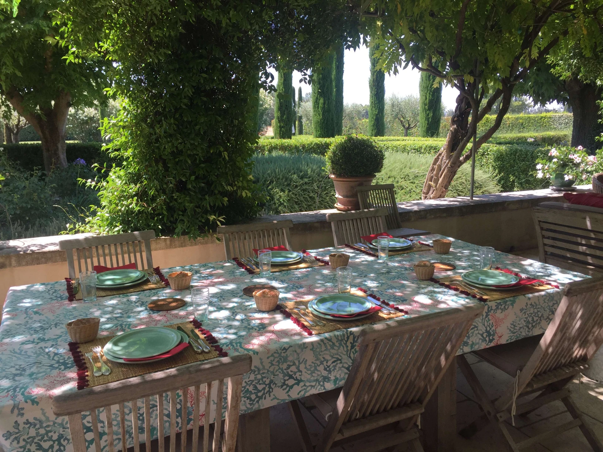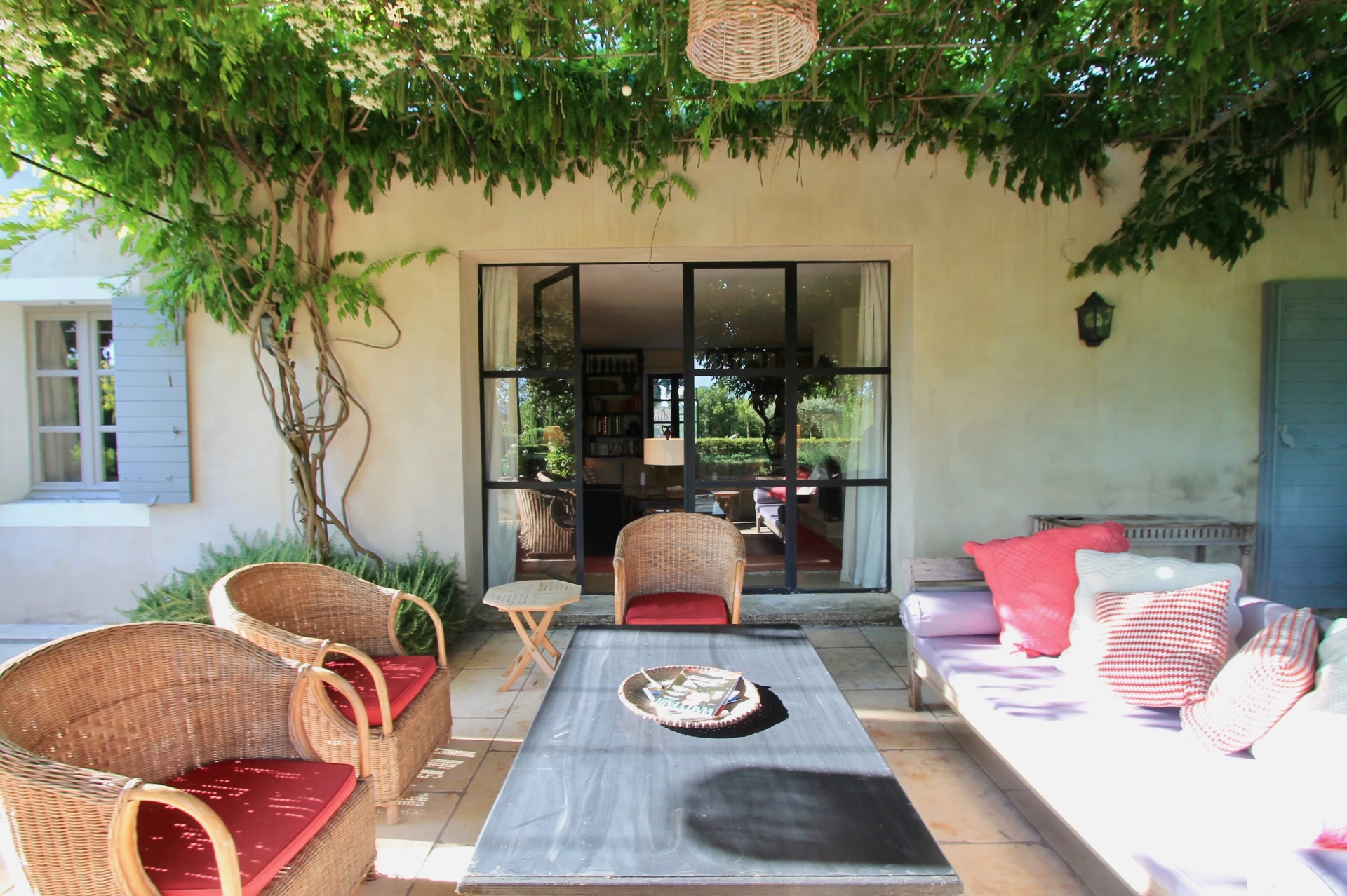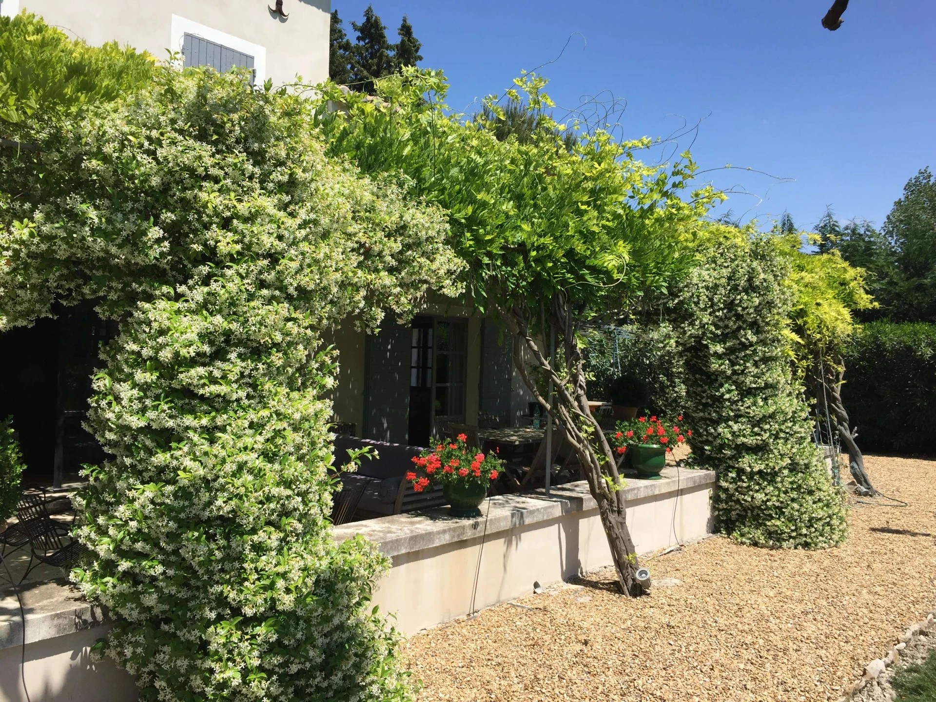 Sur toute la longueur de la maison et donnant sur le jardin et la piscine, une magnifique terrasse abritée par une ravissante tonnelle recouverte de glycines. Cette terrasse comprend une partie salon de plein air avec un canapé en rotin et des fauteuils confortables et une partie salle à manger avec une table et des chaises en teck pour huit personnes. Ce cadre magnifique est idéal pour se détendre dans ce lieu si calme, pour recevoir et profiter en toute quiétude des repas 'al fresco' .