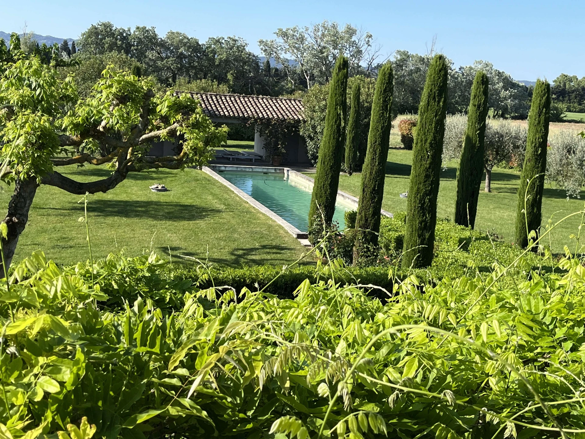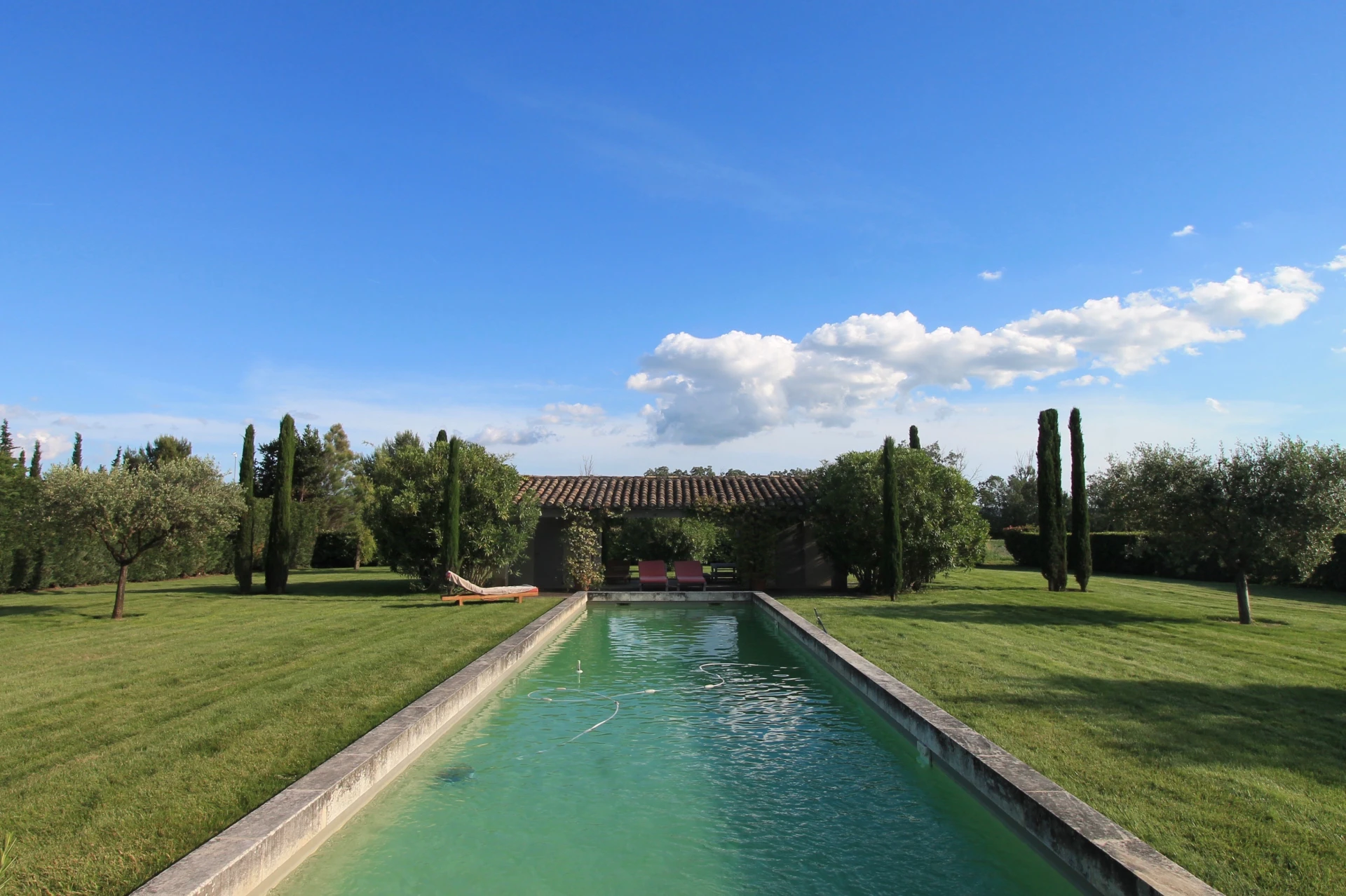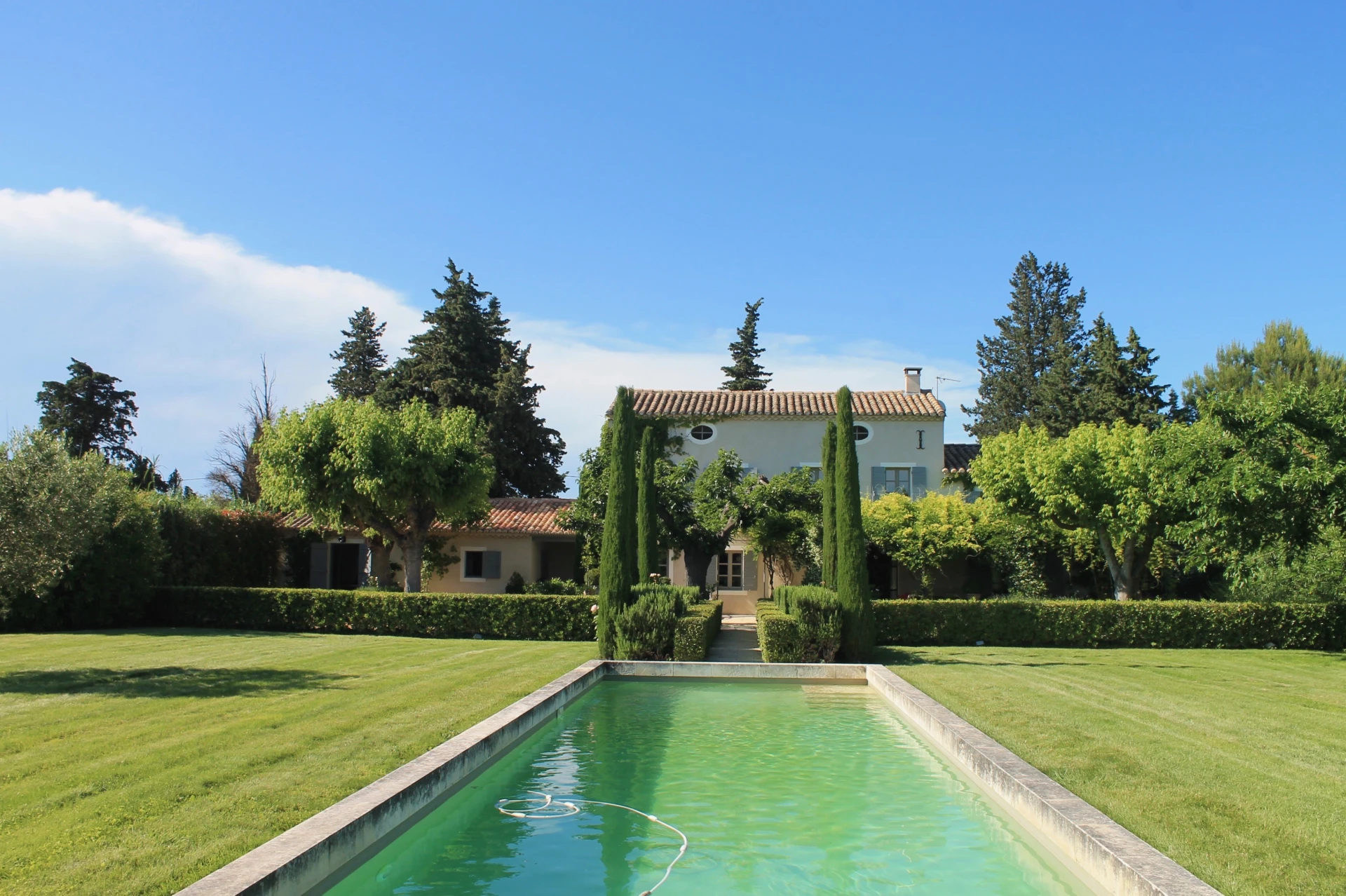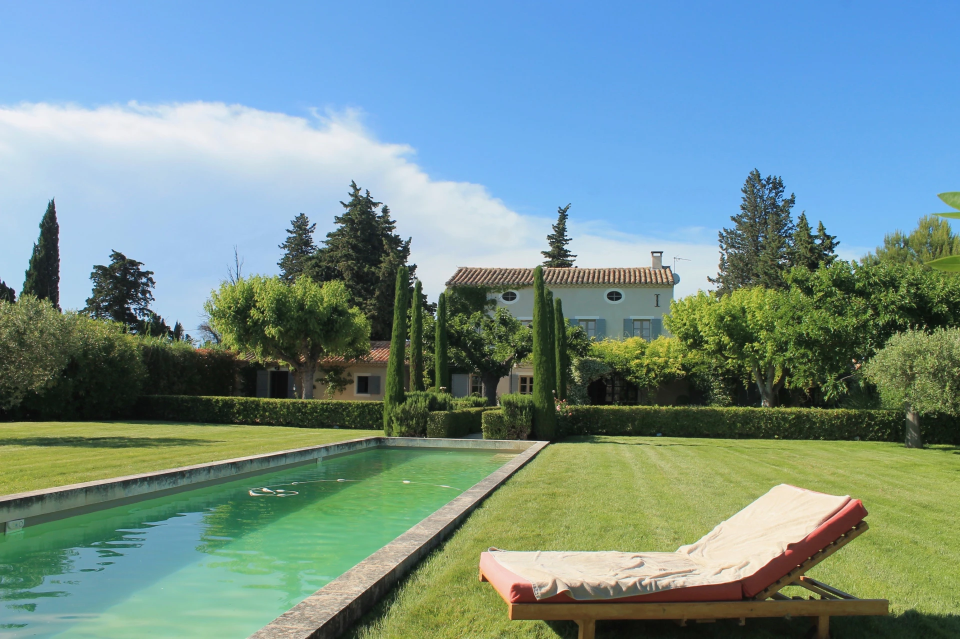 Le Mas se situe dans un grand jardin avec de vastes pelouses, de nombreux arbres, de beaux parterres verdoyants, agrémentés de lavande, de lauriers roses, de massifs de fleurs et d'arbustes. Au centre de la pelouse une très jolie piscine prolongée par une pool house avec toilettes et une agréable terrasse couverte.