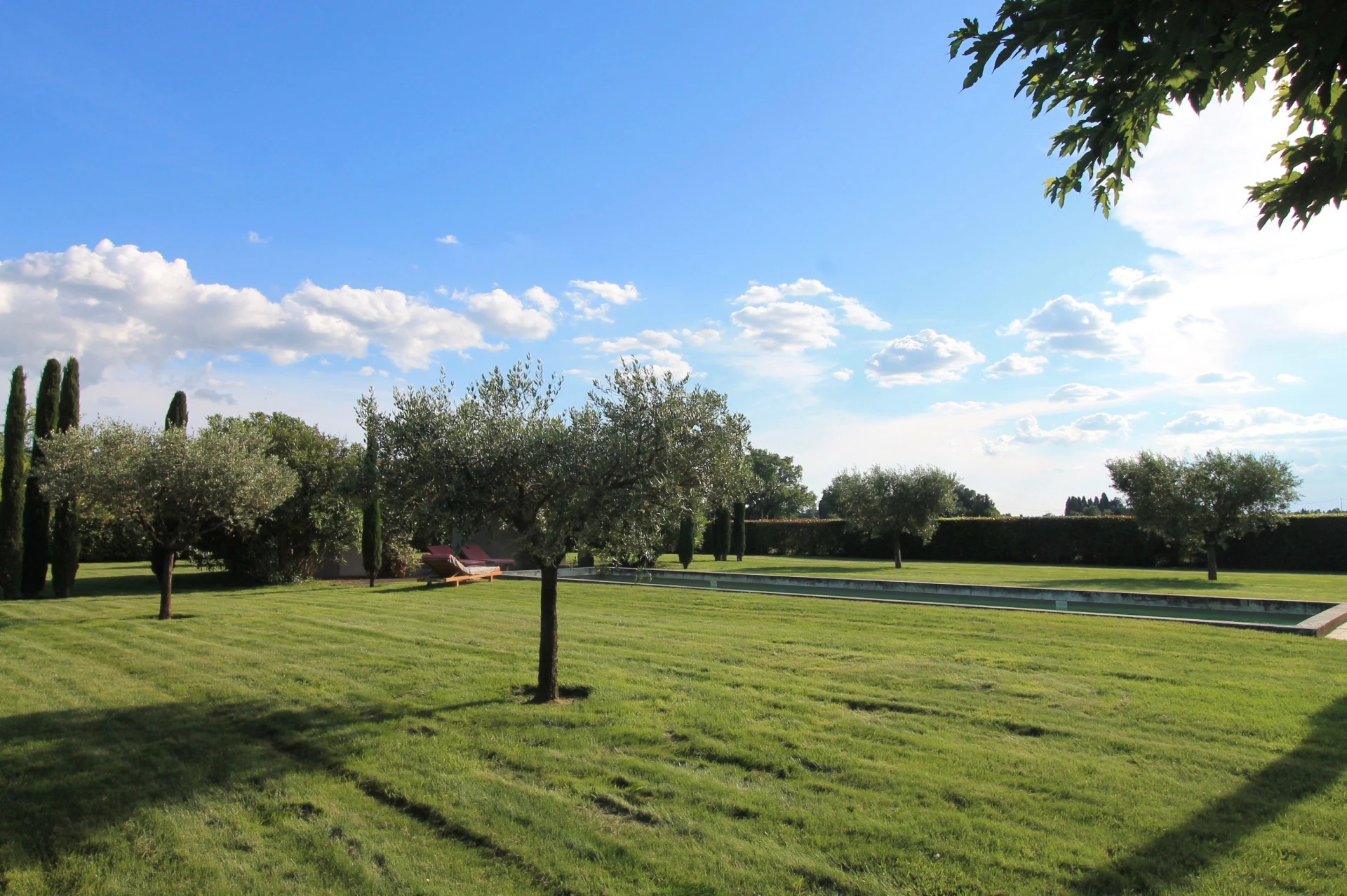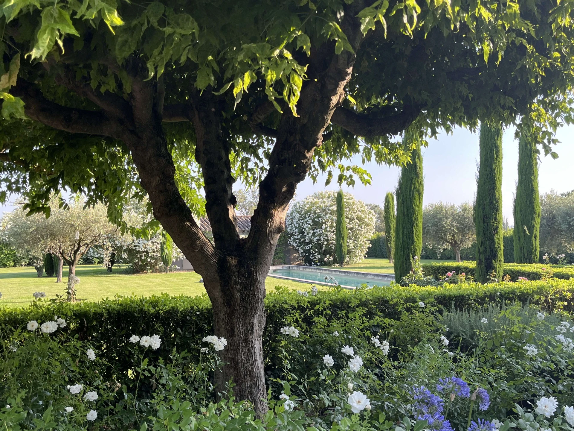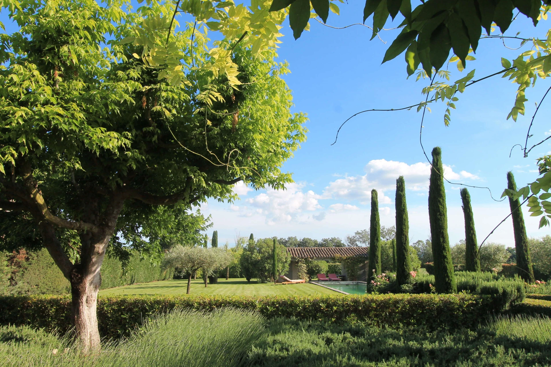 Le Mas se situe dans un grand jardin avec de vastes pelouses, de nombreux arbres, de beaux parterres verdoyants, agrémentés de lavande, de lauriers roses, de massifs de fleurs et d'arbustes. Au centre de la pelouse une très jolie piscine prolongée par une pool house avec toilettes et une agréable terrasse couverte.