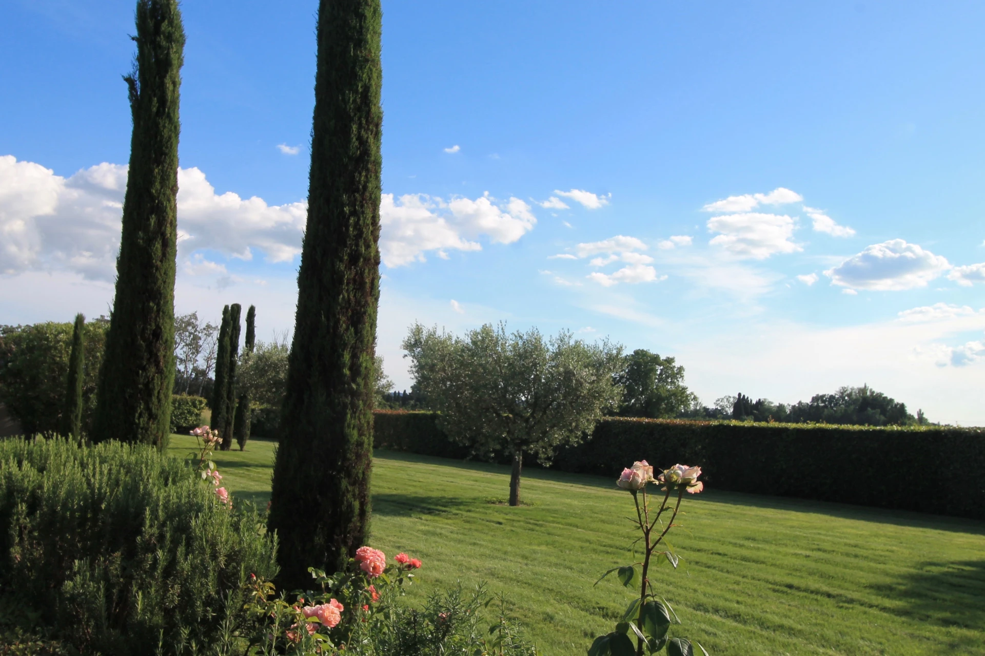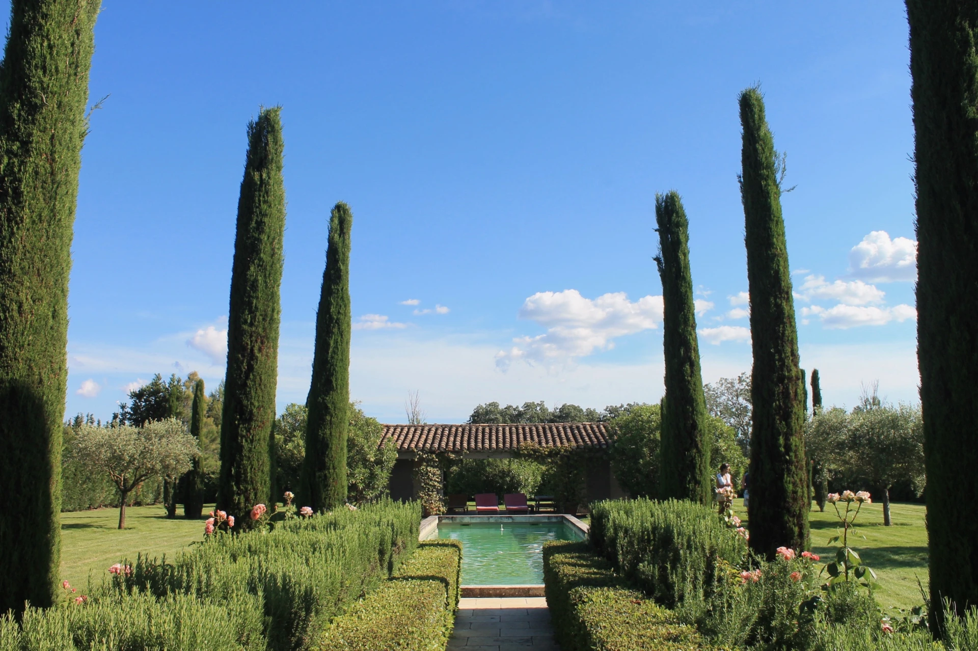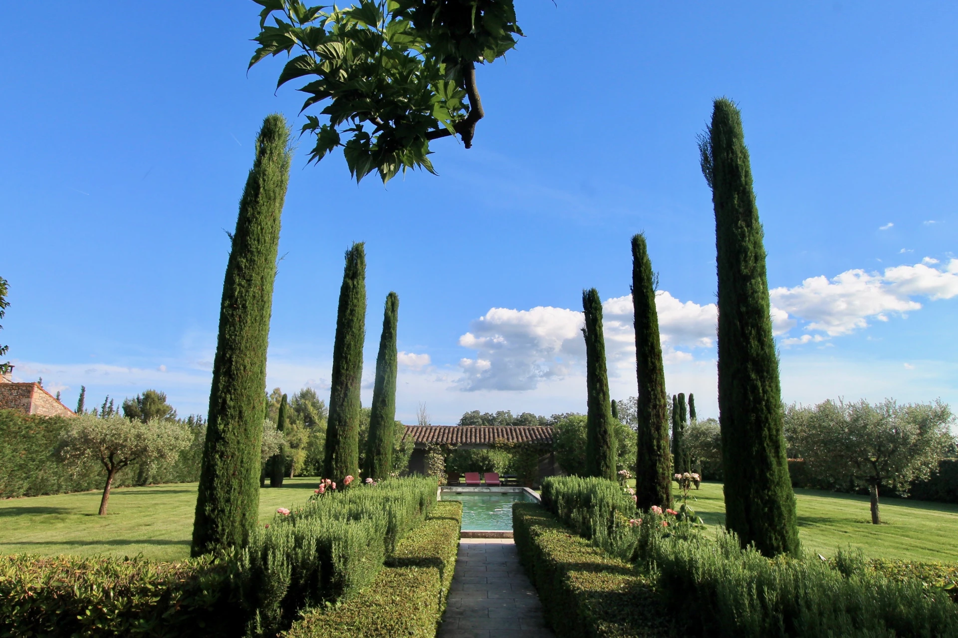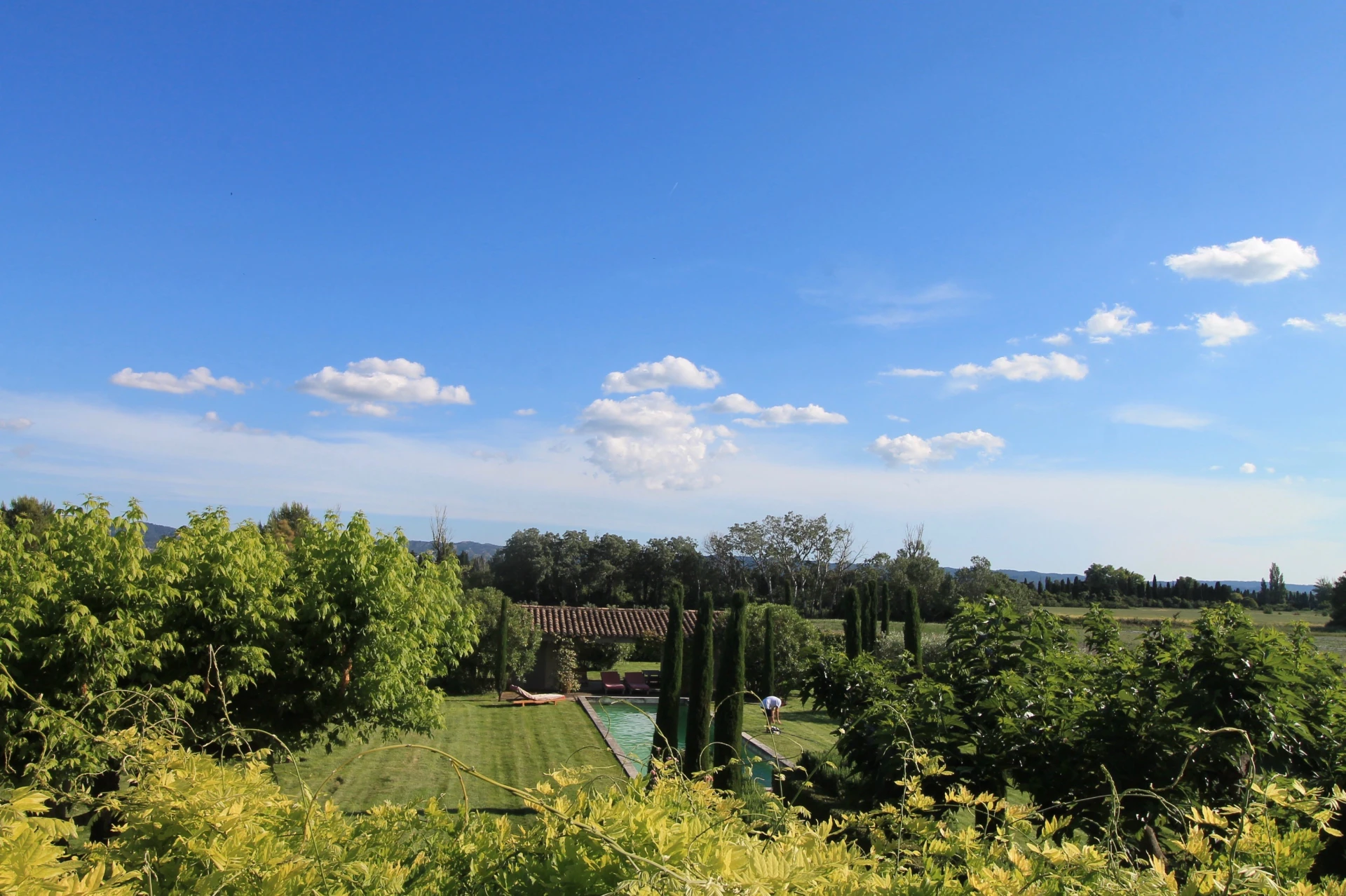 Le Mas se situe dans un grand jardin avec de vastes pelouses, de nombreux arbres, de beaux parterres verdoyants, agrémentés de lavande, de lauriers roses, de massifs de fleurs et d'arbustes. Au centre de la pelouse une très jolie piscine prolongée par une pool house avec toilettes et une agréable terrasse couverte.
