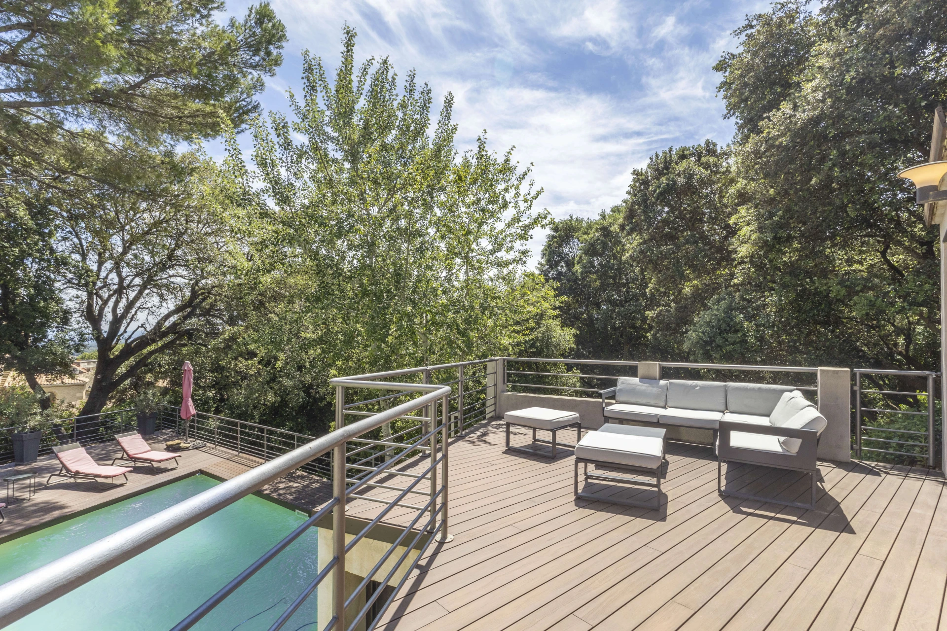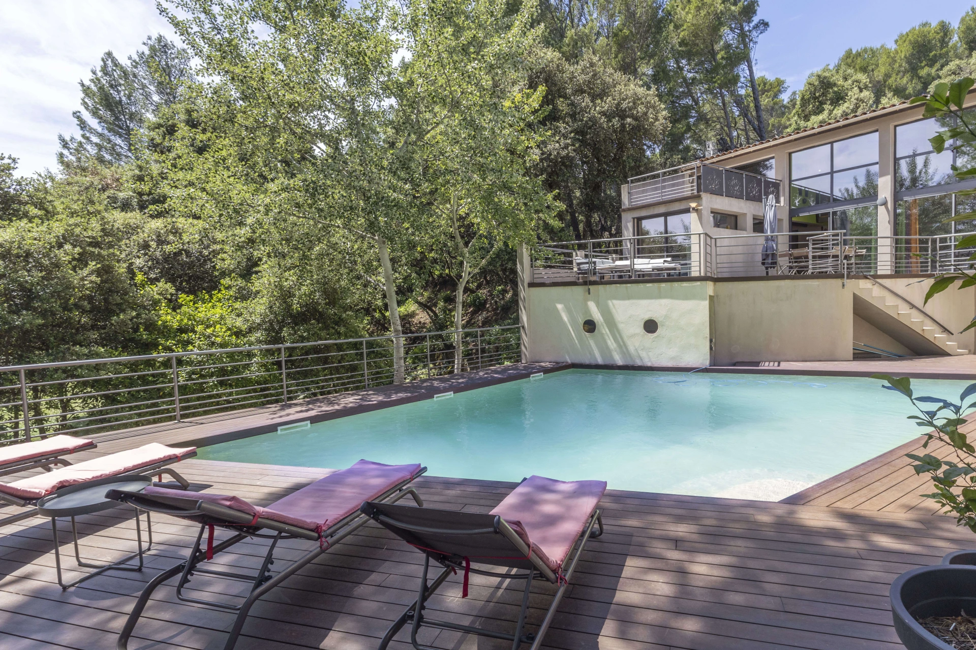 Il y a une terrasse à l'extérieure en bois de 50m² surplombant une grande piscine de 12 x 6 m (saut possible) entourée d’une terrasse en bois de 130 m². Le jardin offre des petits coins d'ombres, très agréables, pendant la journée. En juillet/août, la villa est pour 10 personnes. Les autres mois pour maximum 8 personnes. Le propriétaire habite sur place dans une autre maison, votre intimité est garantie.