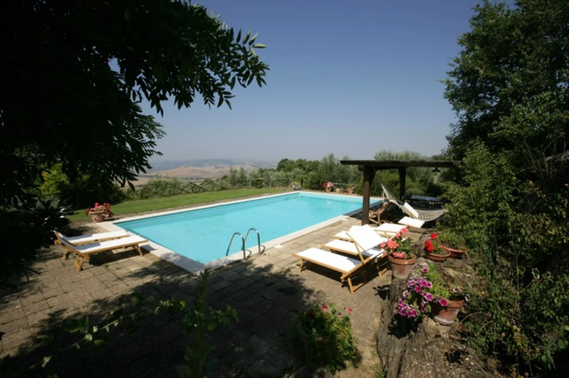 Autour de la grande piscine privée (6x12m) vous trouverez de nombreux espaces verts et fleuris. La vue sur la vallée est fabuleuse. Un patio absolument charmant vous offre de l’ombre et vous pourrez y déguster un bon repas, boire un verre ou lire un bon livre. Divin !