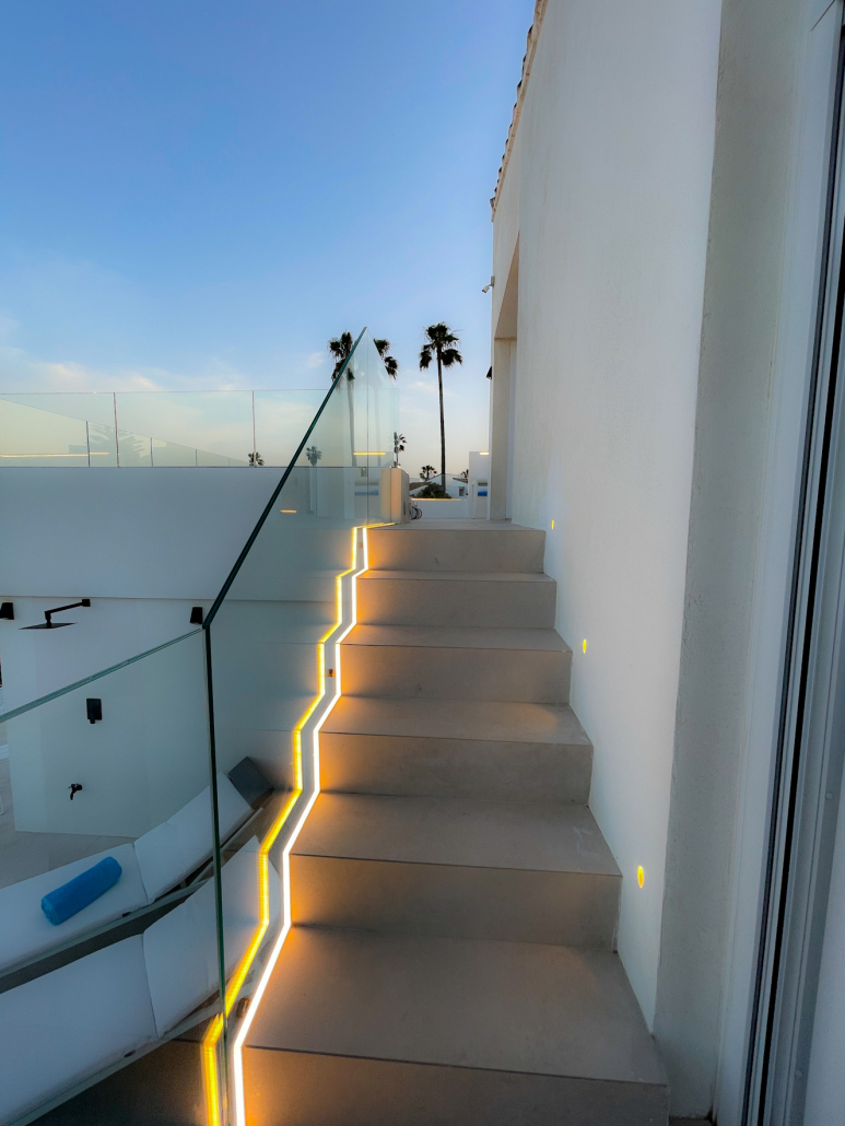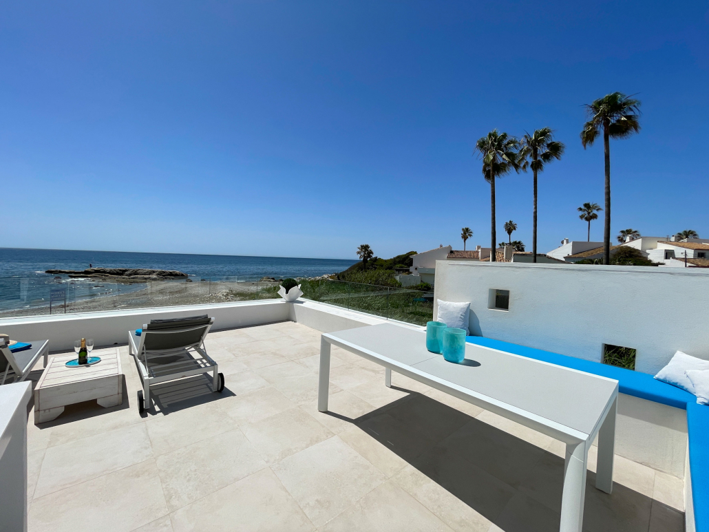 Dit luxe vakantiehuis aan zee in Estepona biedt een prachtig interieur met hoogstaande materialen. Er is een alarm aanwezig en verschillende high-tech snufjes zoals het automatisch bedienen van de rolluiken, lichten en airco. De open keuken geeft uit op de eetplaats en living. Alle ruimtes genieten van een adembenemend uitzicht op strand en zee en bieden directe toegang tot terrassen.