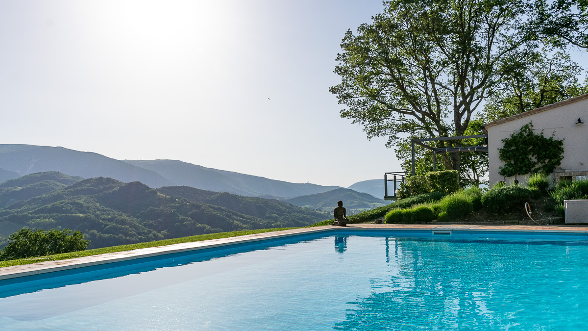Het zeer groot gemeenschappelijk zwembad (6x12m) van het vakantiehuis in Italië is omringd door terrassen waar voldoende ligbedden en parasols voorzien worden. Het gemeenschappelijk zwembad van het vakantiehuis in Le Marche geeft ook opnieuw uit op de prachtige Italiaanse velden en bergen.