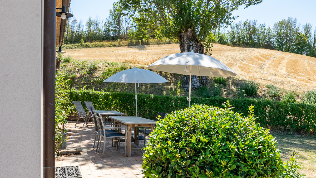 Het zeer groot gemeenschappelijk zwembad (6x12m) is omringd door terrassen waar voldoende ligbedden en parasols voorzien worden. Het gemeenschappelijk zwembad geeft ook opnieuw uit op de prachtige Italiaanse velden en bergen.