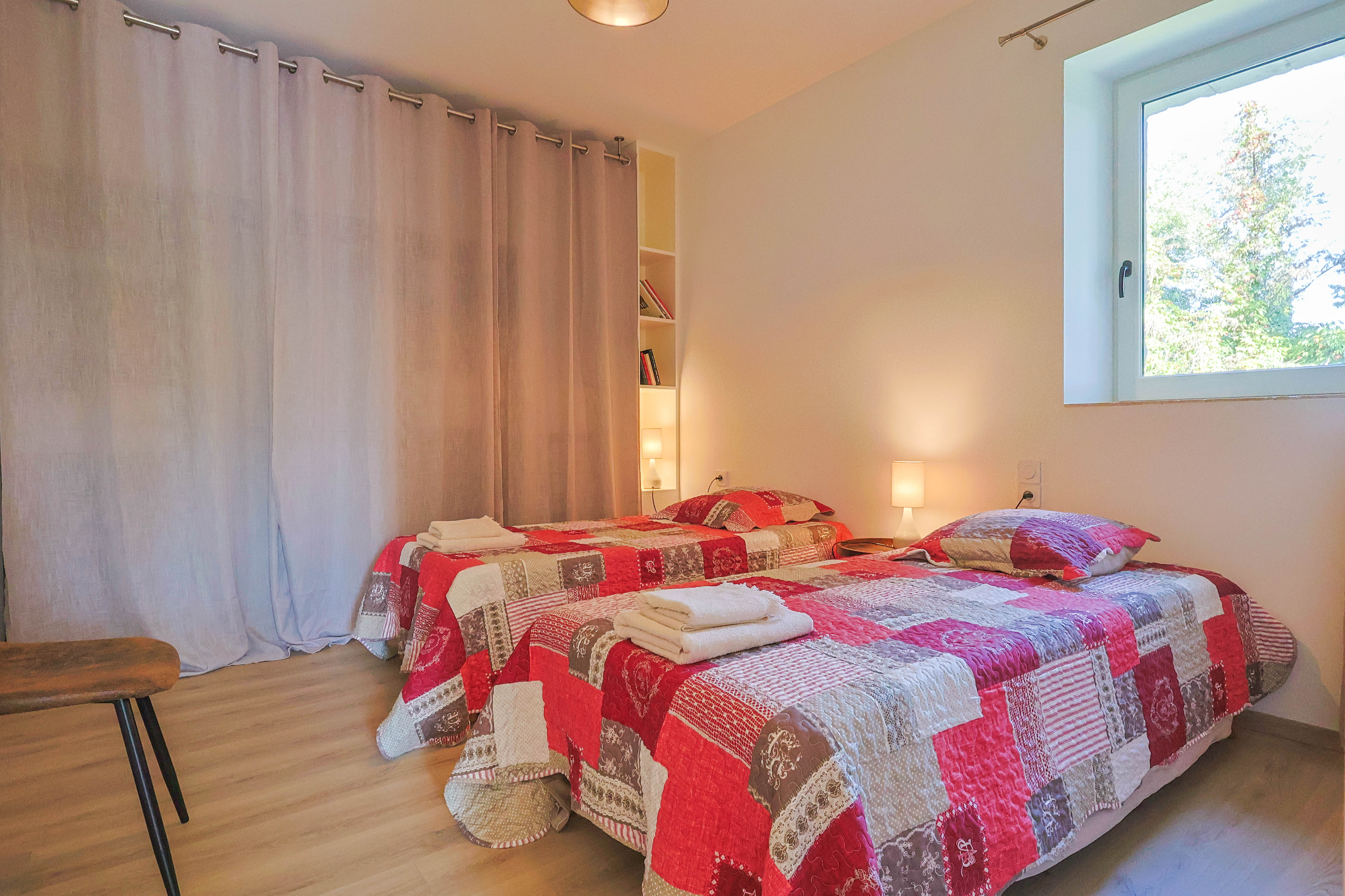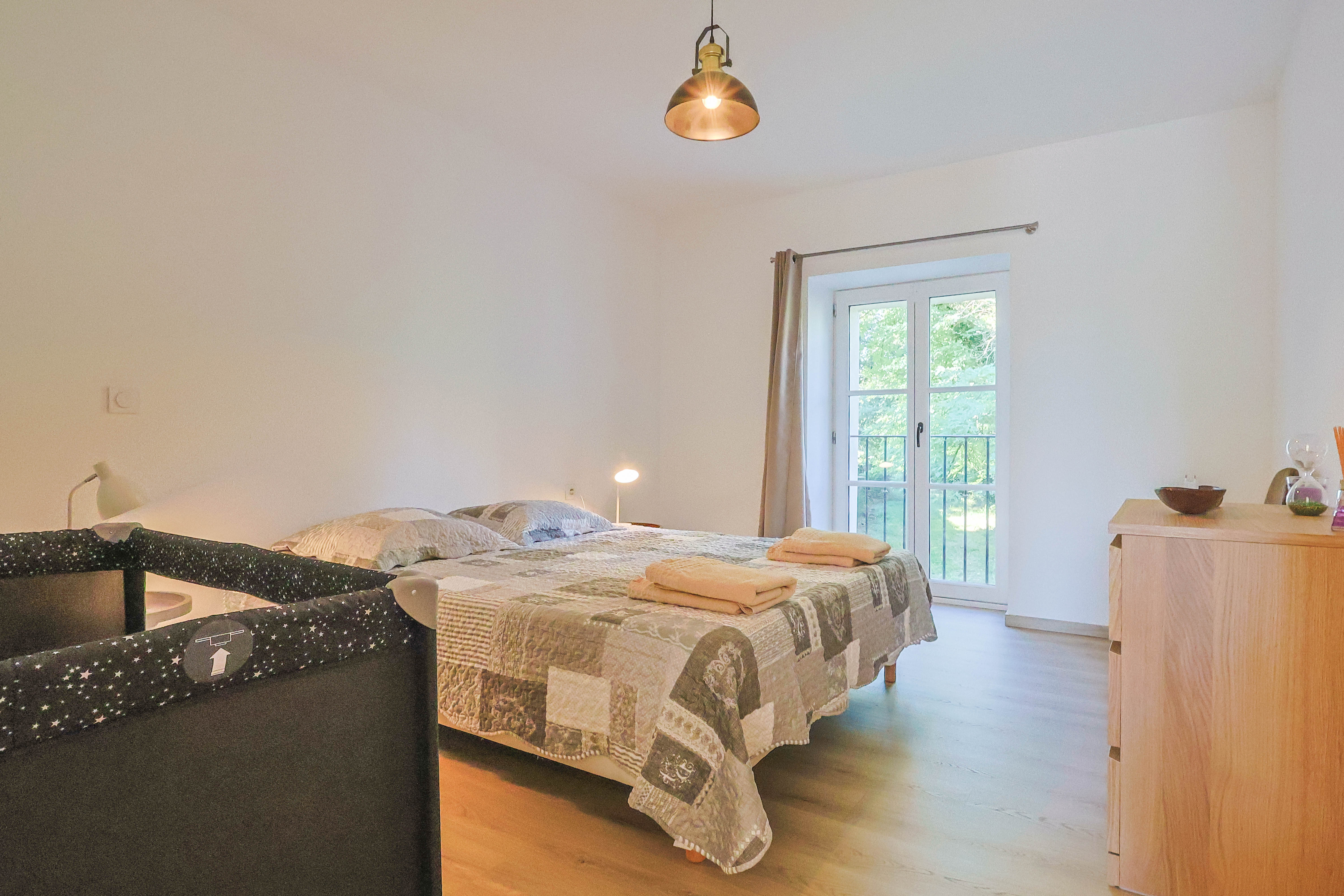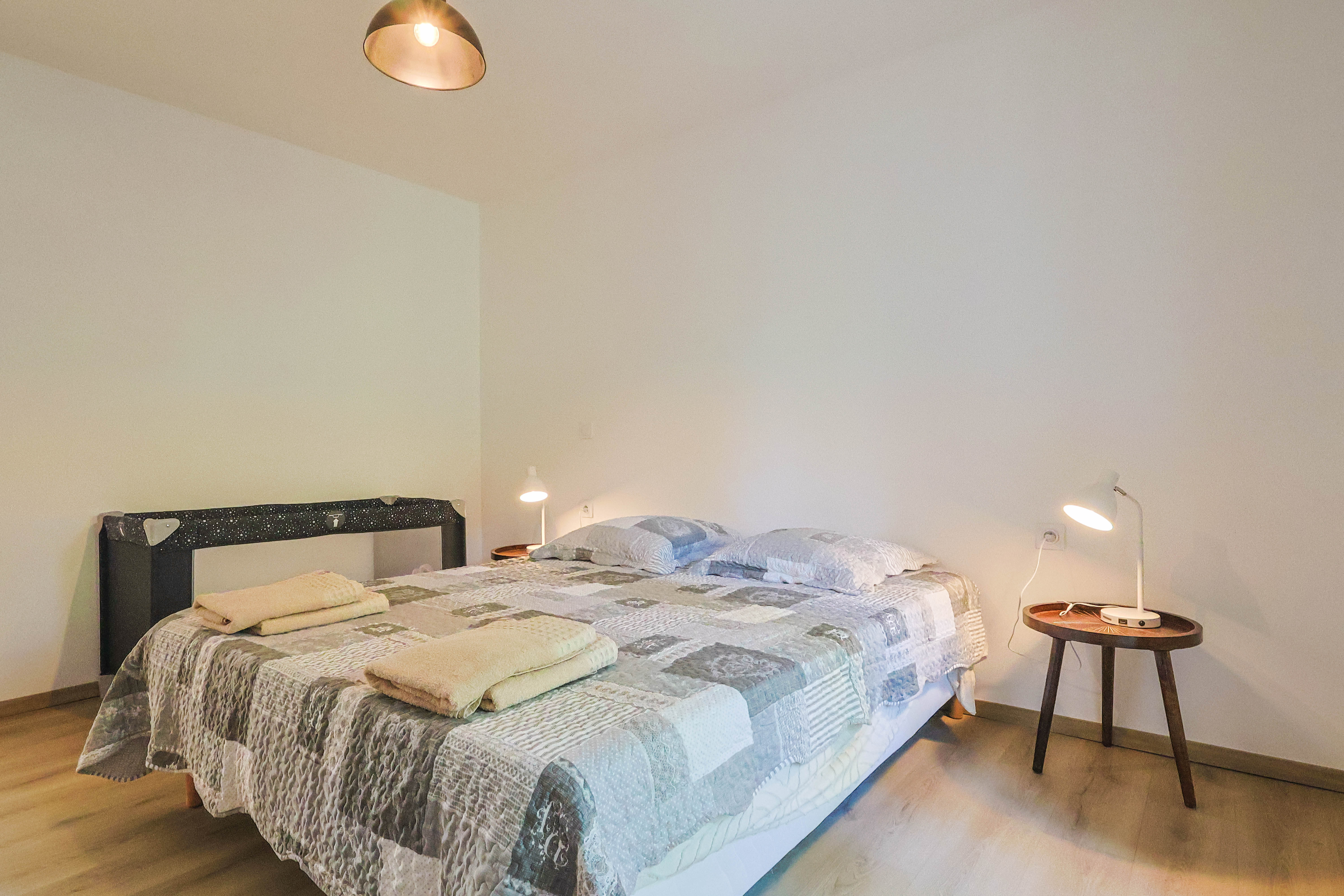 Interieur: Alle comfort in een warme, gezellige sfeer Deze knusse en goed uitgeruste vakantiewoning beschikt over twee slaapkamers: één met een tweepersoonsbed en één met twee eenpersoonsbedden — perfect voor een gezin. In de woonkamer staat een comfortabele slaapbank, zodat het vakantiehuis tot 6 personen kan herbergen. De lichte leefruimte bestaat uit een zithoek, een eethoek en een open, volledig uitgeruste keuken. Via een schuifraam komt u direct uit op het terras, ideaal voor gezellige diners in de buitenlucht.