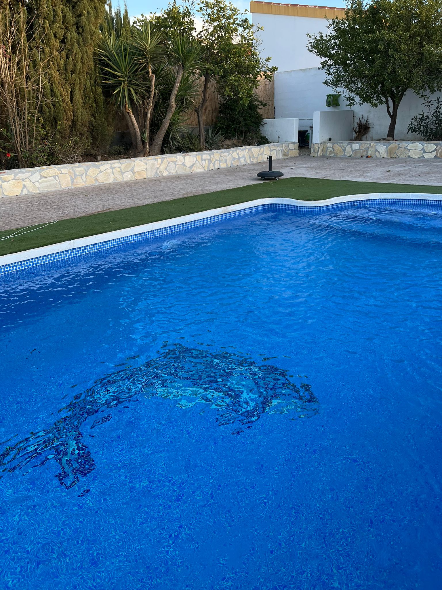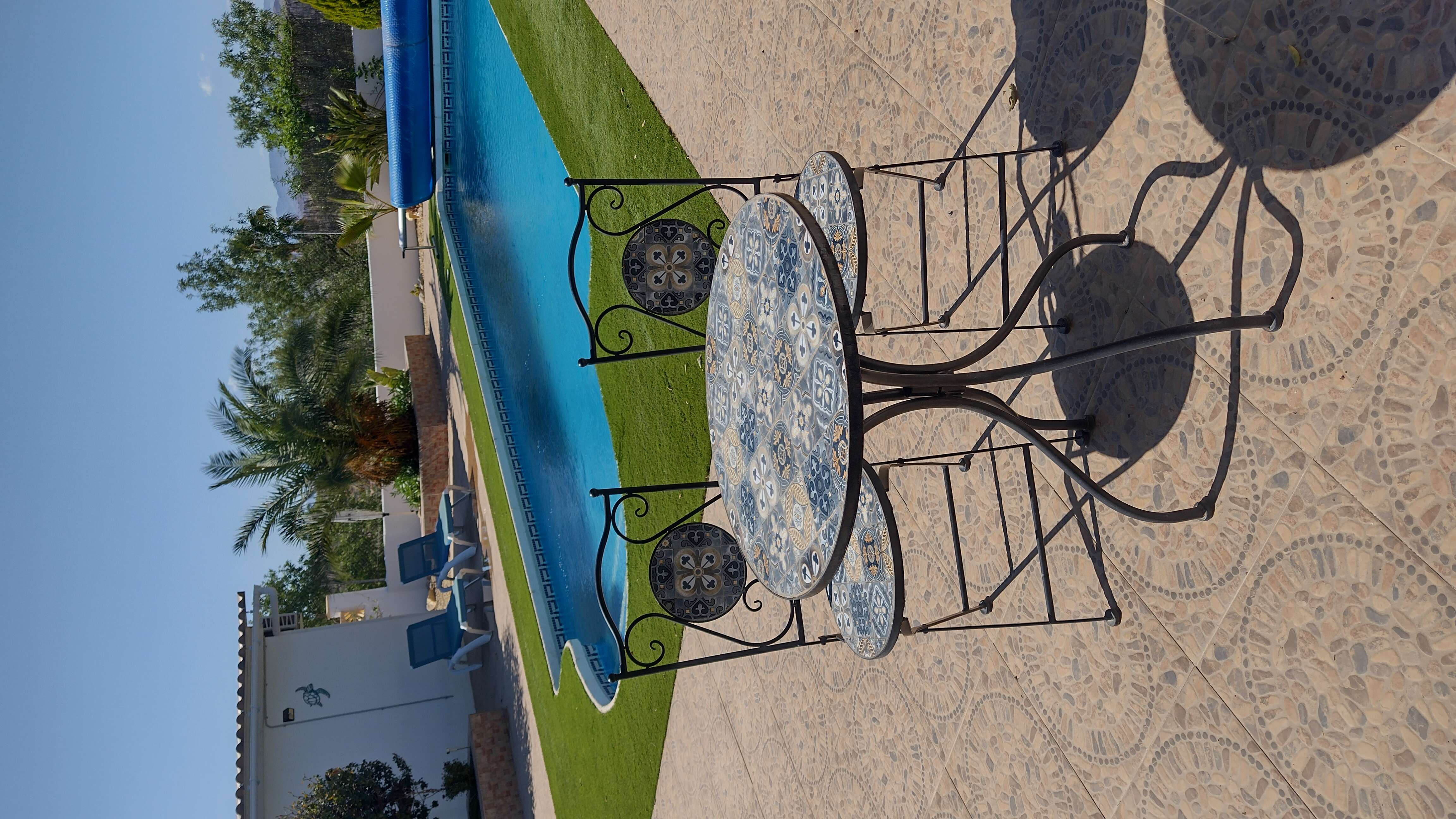 Vanuit de veranda leidt een deur naar het privézwembad en de tuin. De tuin is zeer goed onderhouden en biedt betegelde patio's en zonneterrassen om te zonnebaden en te zitten. Vanop de terrassen geniet je van een panoramisch uitzicht op de bergen. De achtertuin centreert zich rondom het verlicht en verwarmd privé zwembad (8x4m en 2,20m diepte, met afdekzeil op rol en romeinse treden in zwembad)