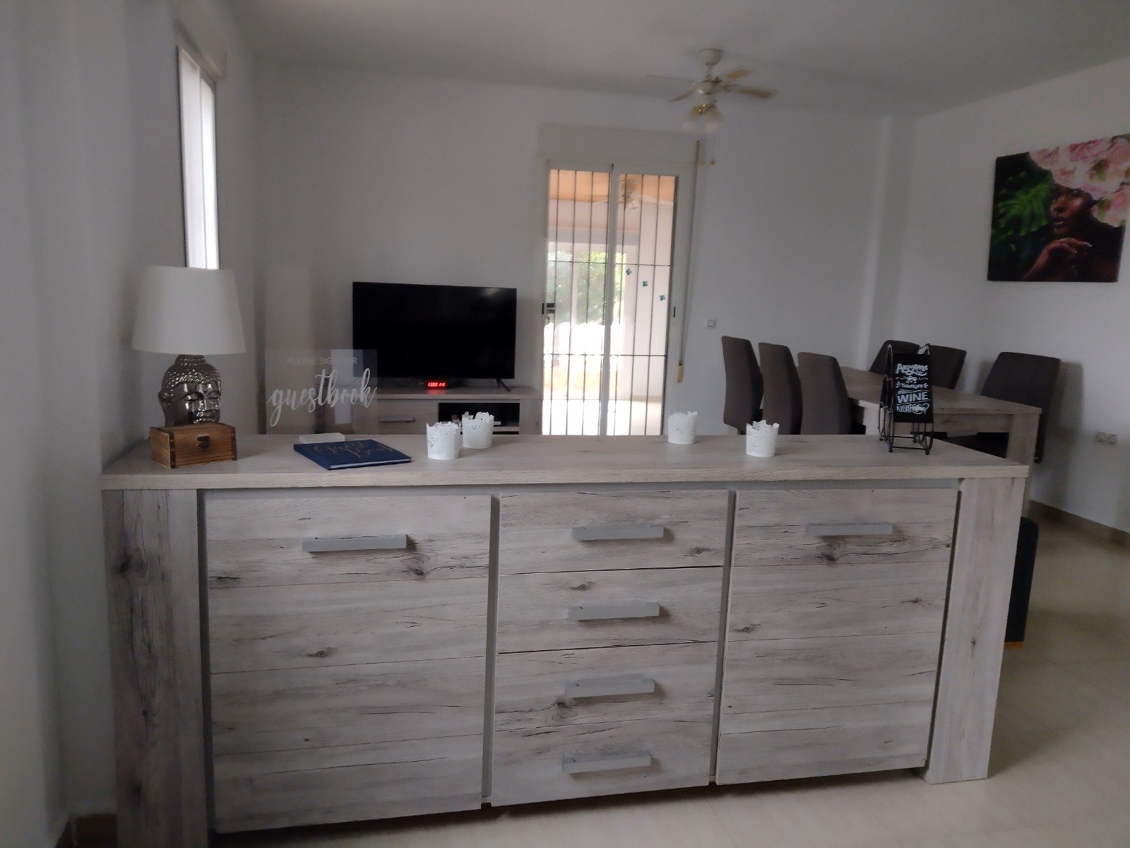Het interieur is comfortabel met op het gelijkvloers een ruime lounge met airconditioning en plafondventilatoren. Vanuit de woonkamer leidt een boog naar een volledig ingerichte keuken. Aan de rechterkant van de lounge is een kleine hal die vervolgens leidt naar de familie badkamer en twee slaapkamers. Een van de slaapkamers is de master, dat is een mooie grote kamer met inbouwkasten en een en-suite badkamer. Aan de achterzijde van de woonkamer leiden dubbele schuifdeuren naar een mooie veranda en een derde slaapkamer.