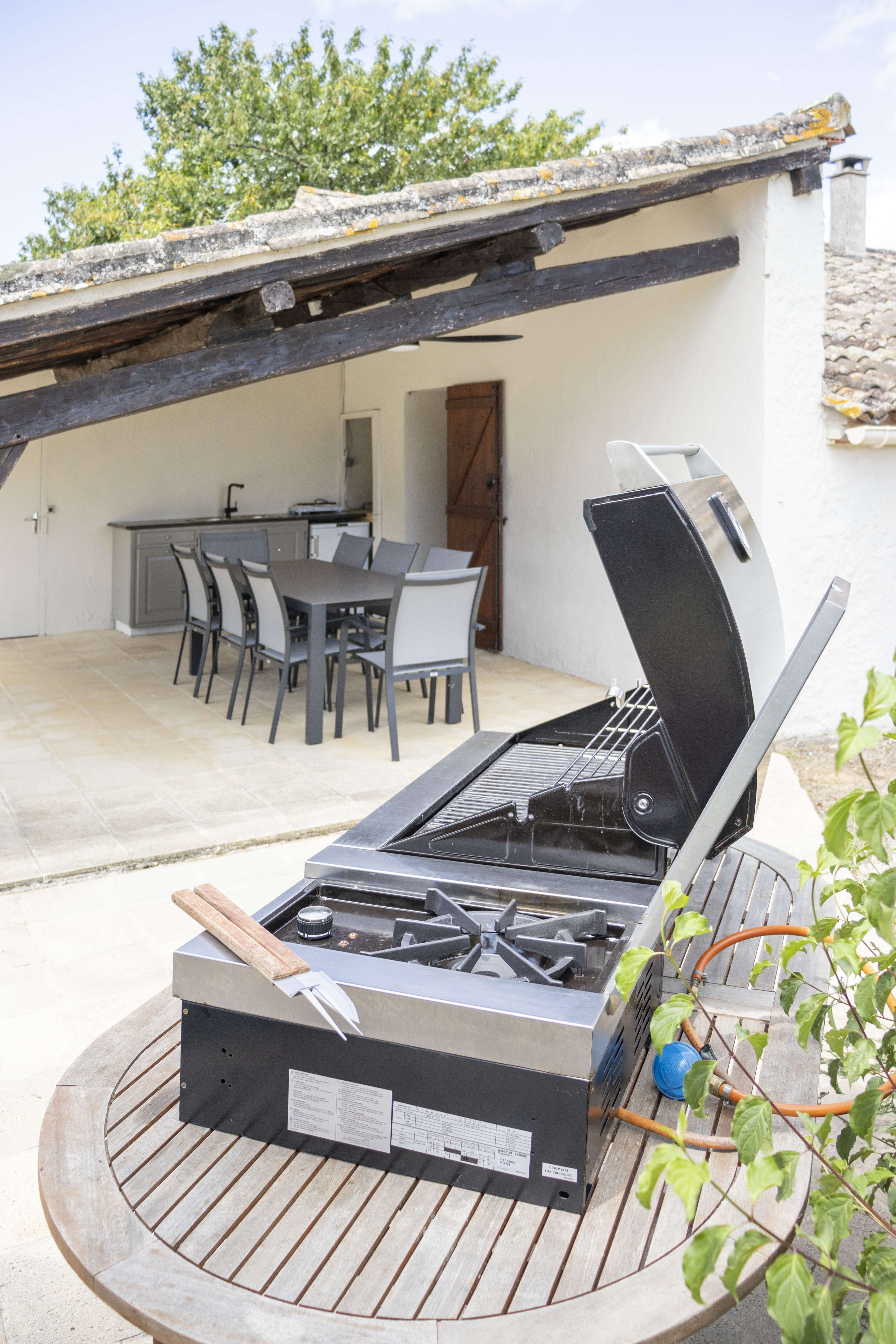 Buiten kun je genieten van een heerlijk overdekt terras met een volledig uitgeruste buitenkeuken (gasbarbecue, elektrische kookvuur, 2 koelkasten en 2 gootstenen) met uitzicht op het grote privézwembad (10x5 m met alarm en Afdekzeil op rol Romeinse treden en verlichting). Na het zwemmen kun je een douche nemen in het poolhouse of gewoon ontspannen in de zon op een ligstoel.