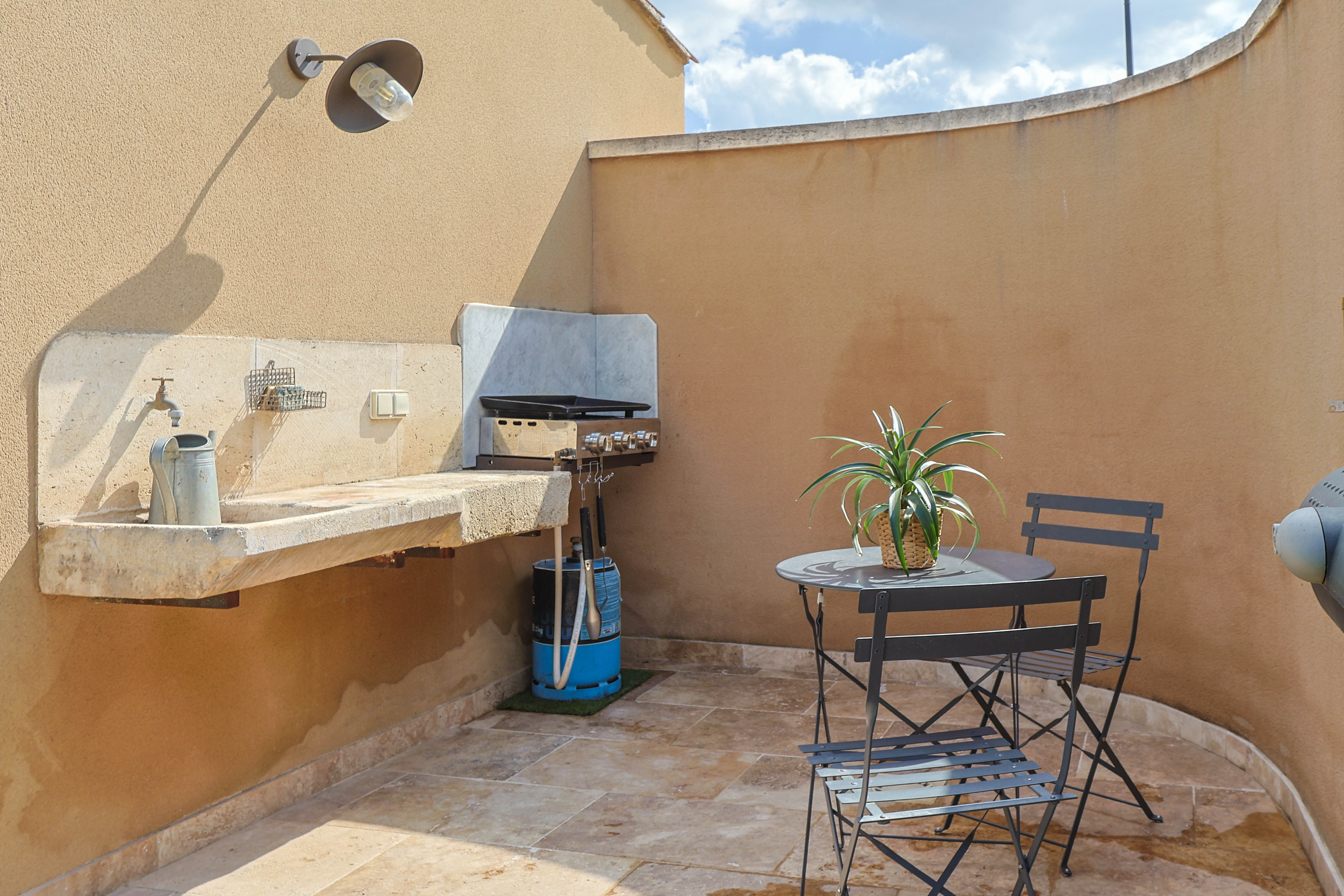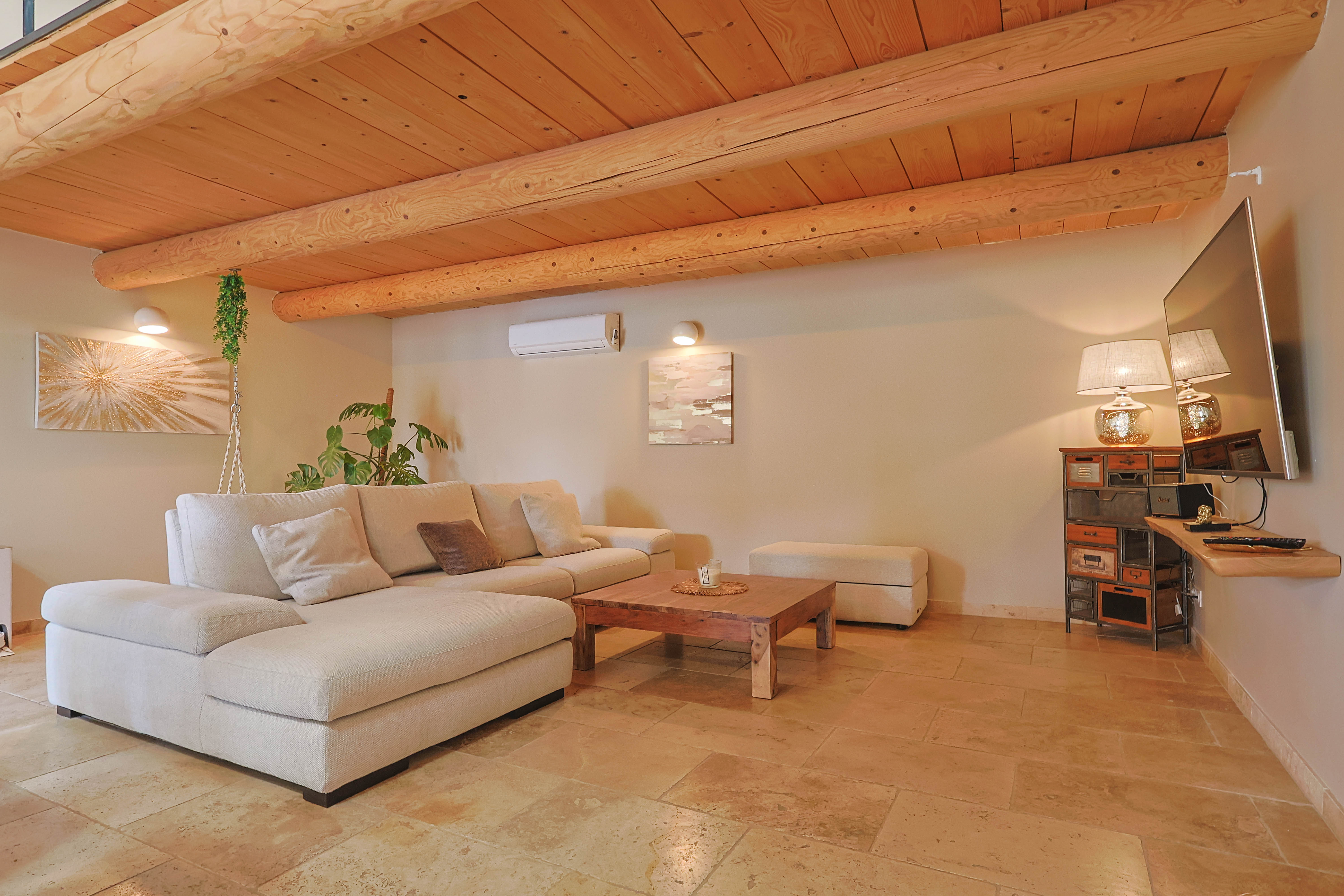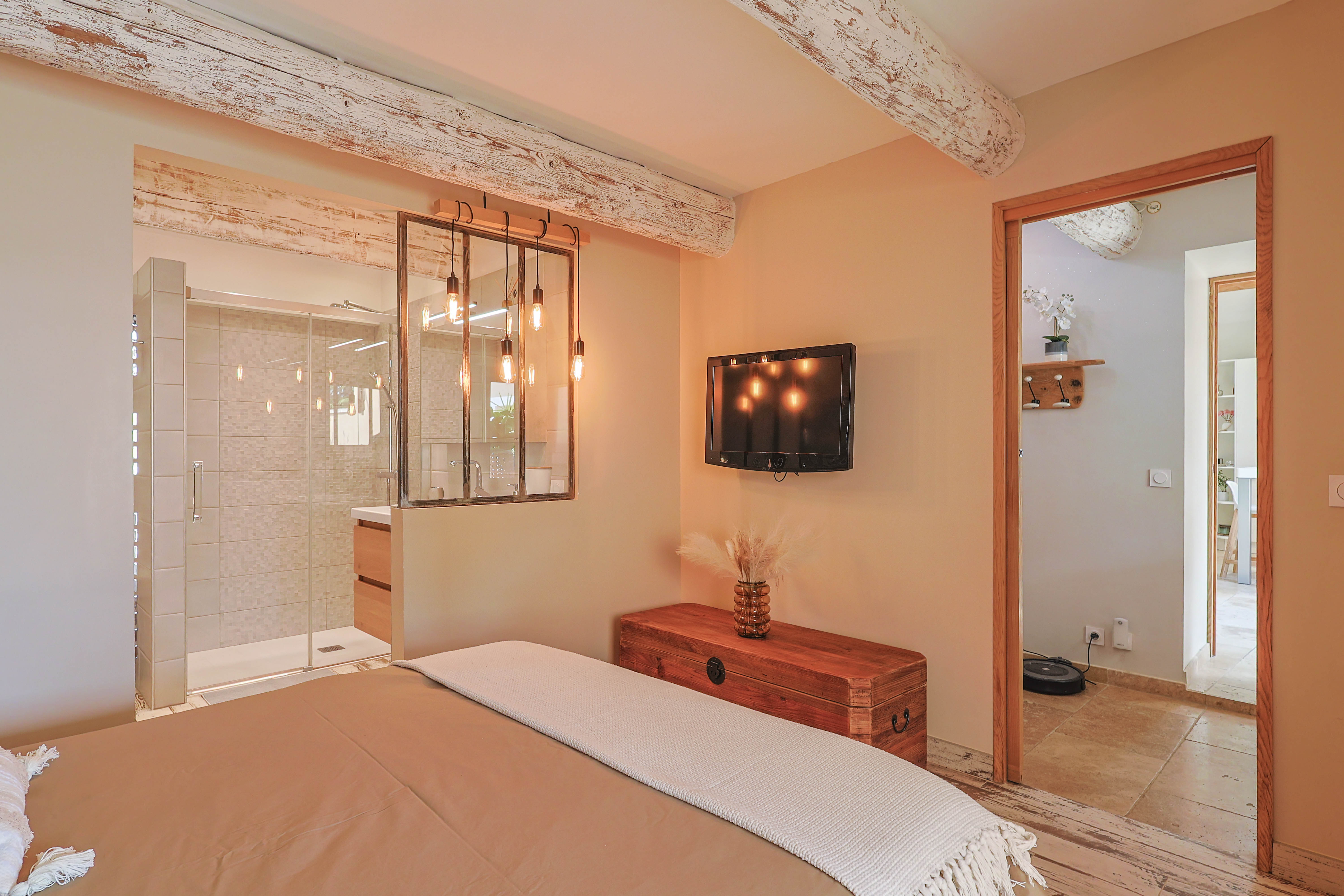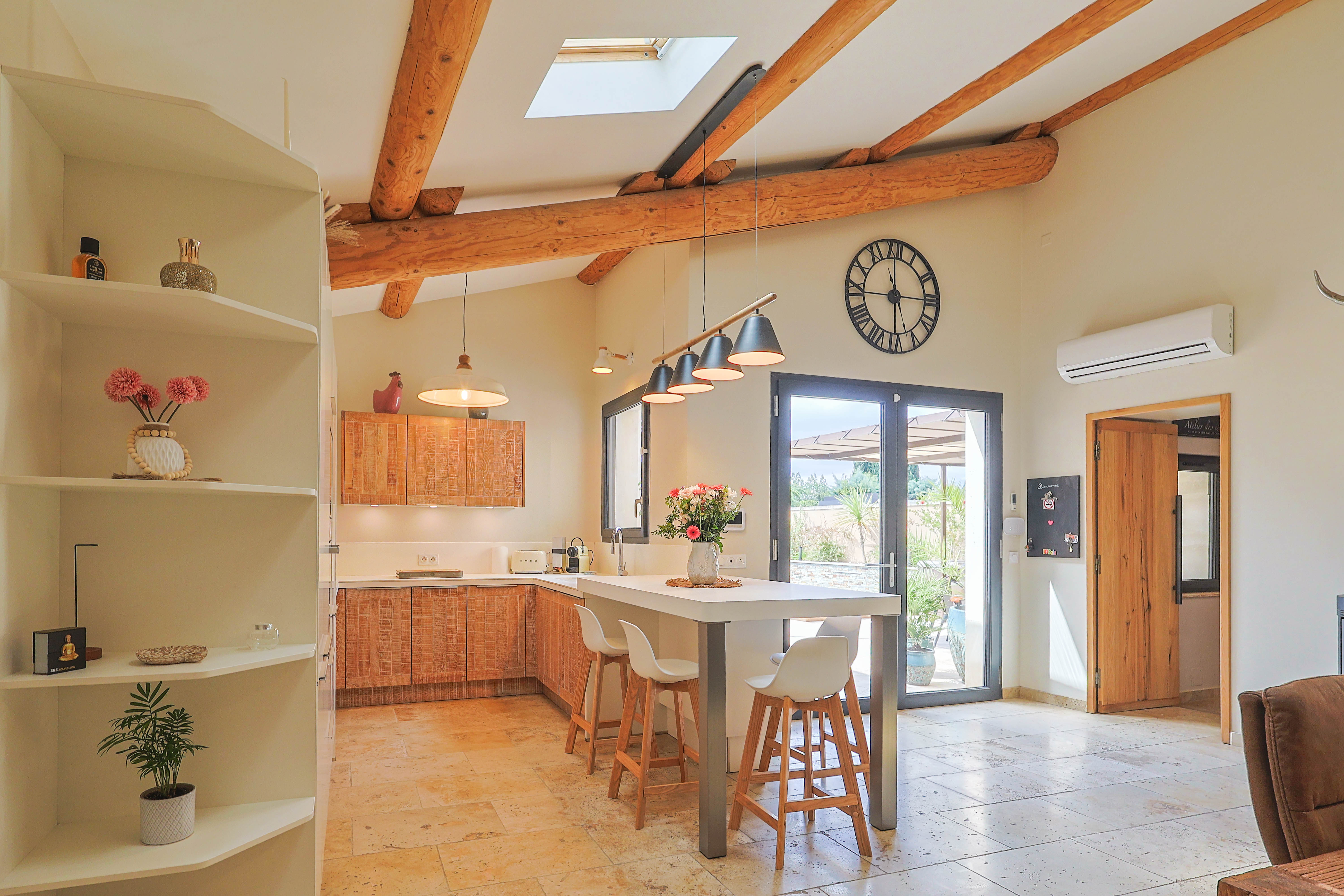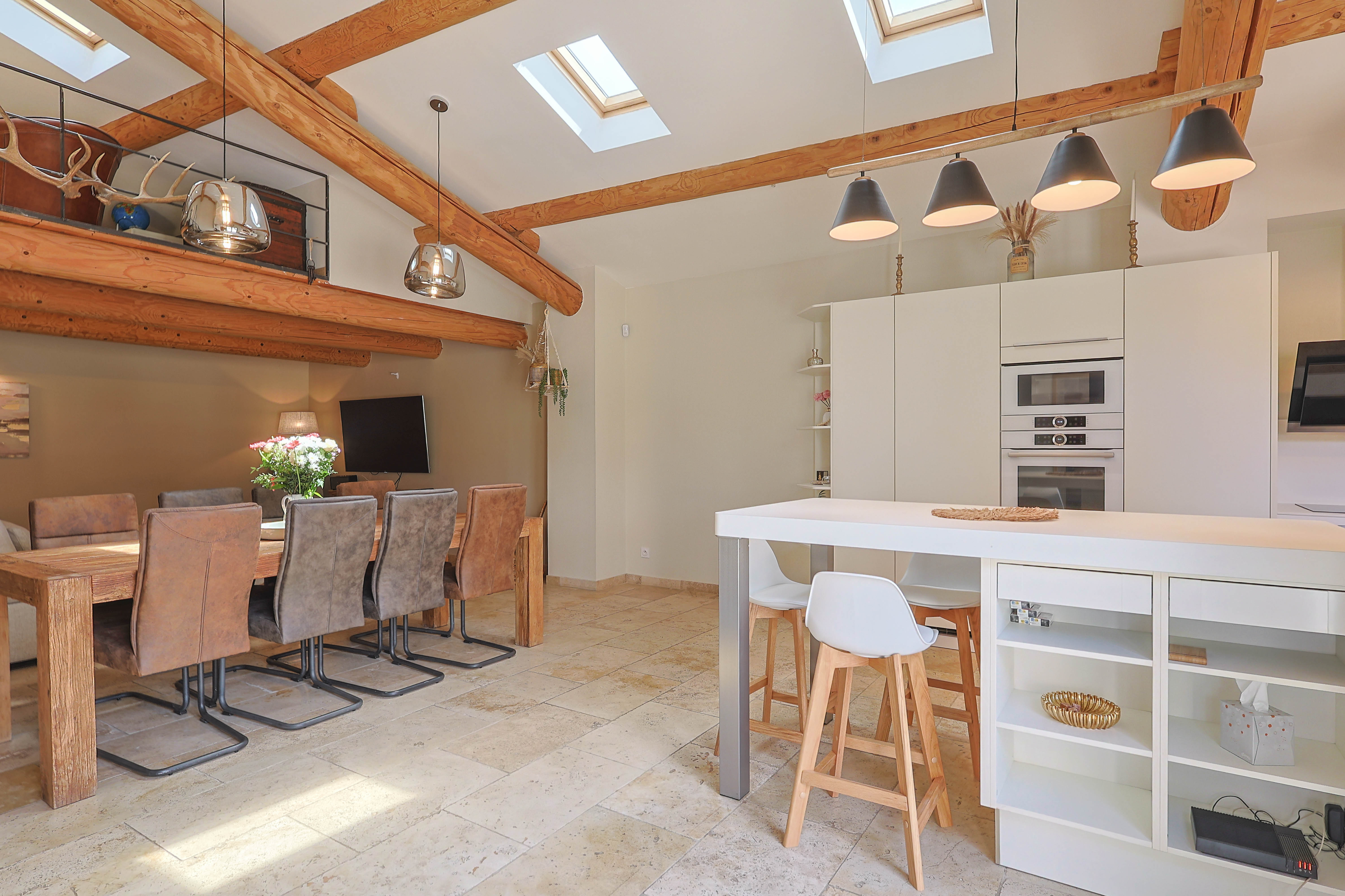 Interieur: Gezellig vakantiehuis met alle nodige voorzieningen Dit vakantiehuis voor 6 personen in de Provence is zeer goed uitgerust om maximaal comfort te garanderen tijdens je verblijf. Een volledig uitgeruste open keuken geeft direct uit op een mooie eettafel en een gezellige woonkamer met airco. De woonkamer is bekleed met mooie houten balken die typisch zijn voor de streek en straalt een warme, gezellige sfeer uit. De airconditioning bevindt zich in de gang boven en verspreidt zich goed in de slaapkamers.
