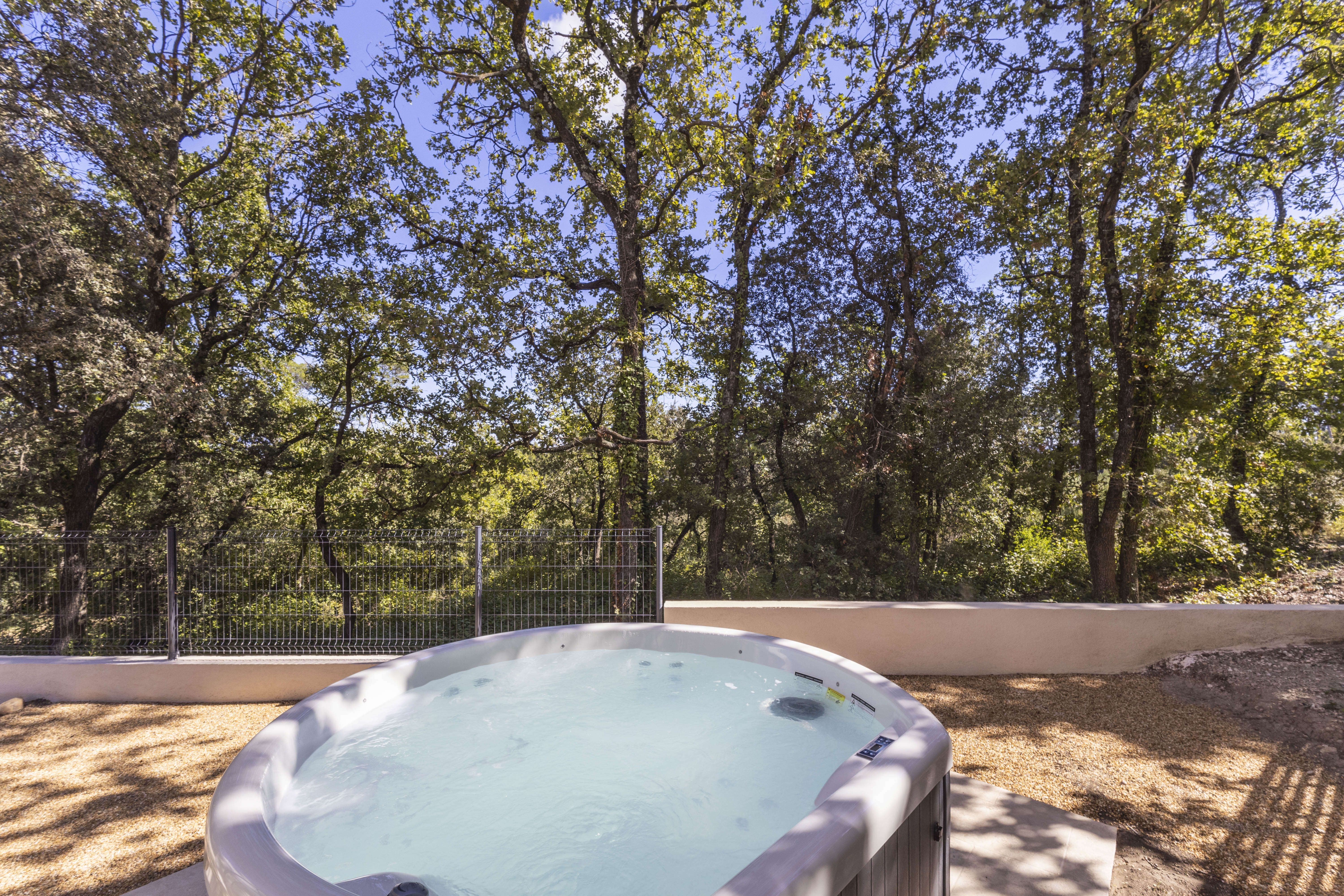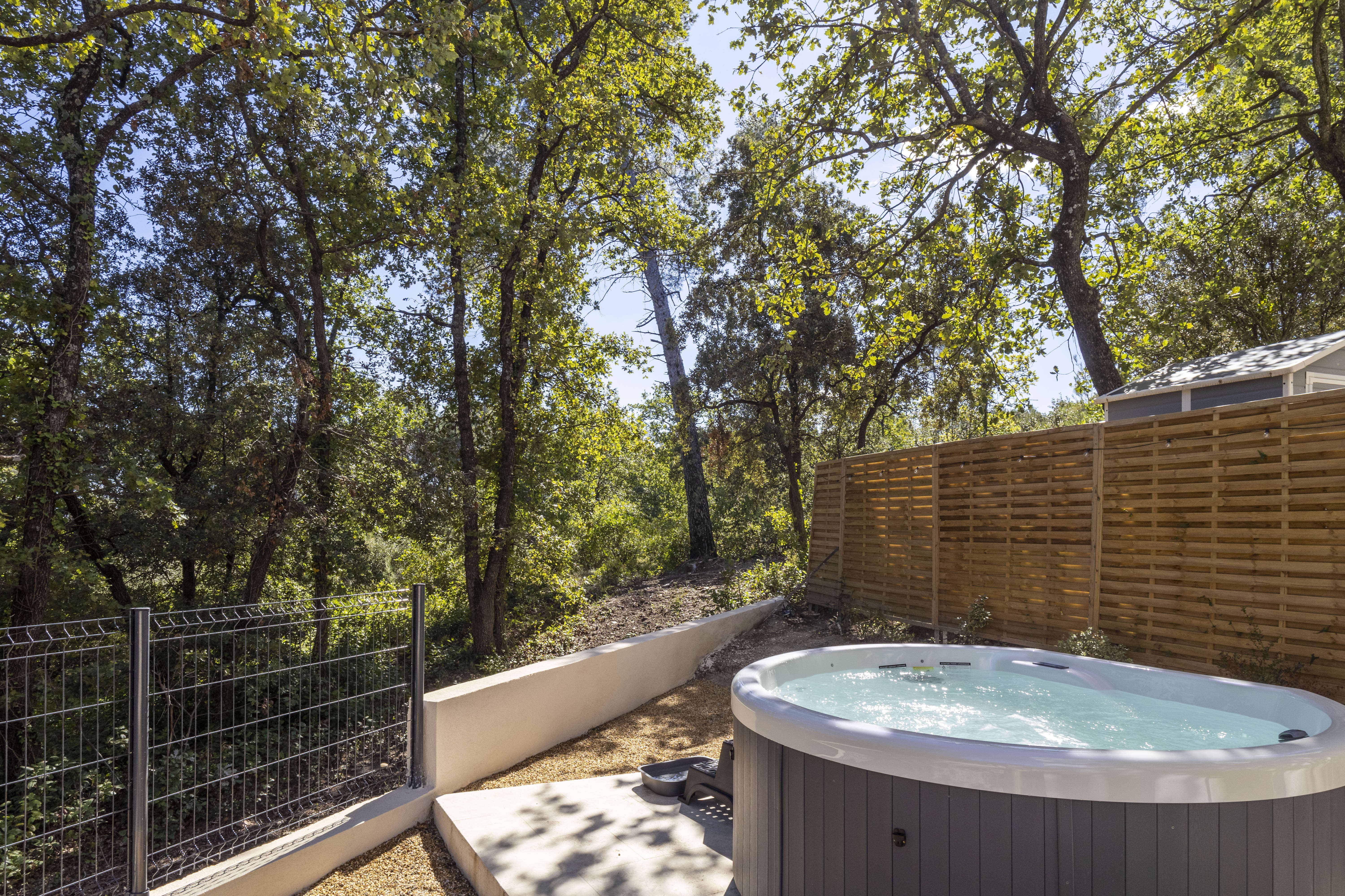 De jacuzzi buiten biedt zicht op een dennenbos en zorgt voor een ontspannend moment precies midden in de natuur. Geniet ook van de mooie plancha op het terras van het vakantiehuis, voor aangename lunches in de zon met vrienden of familie.