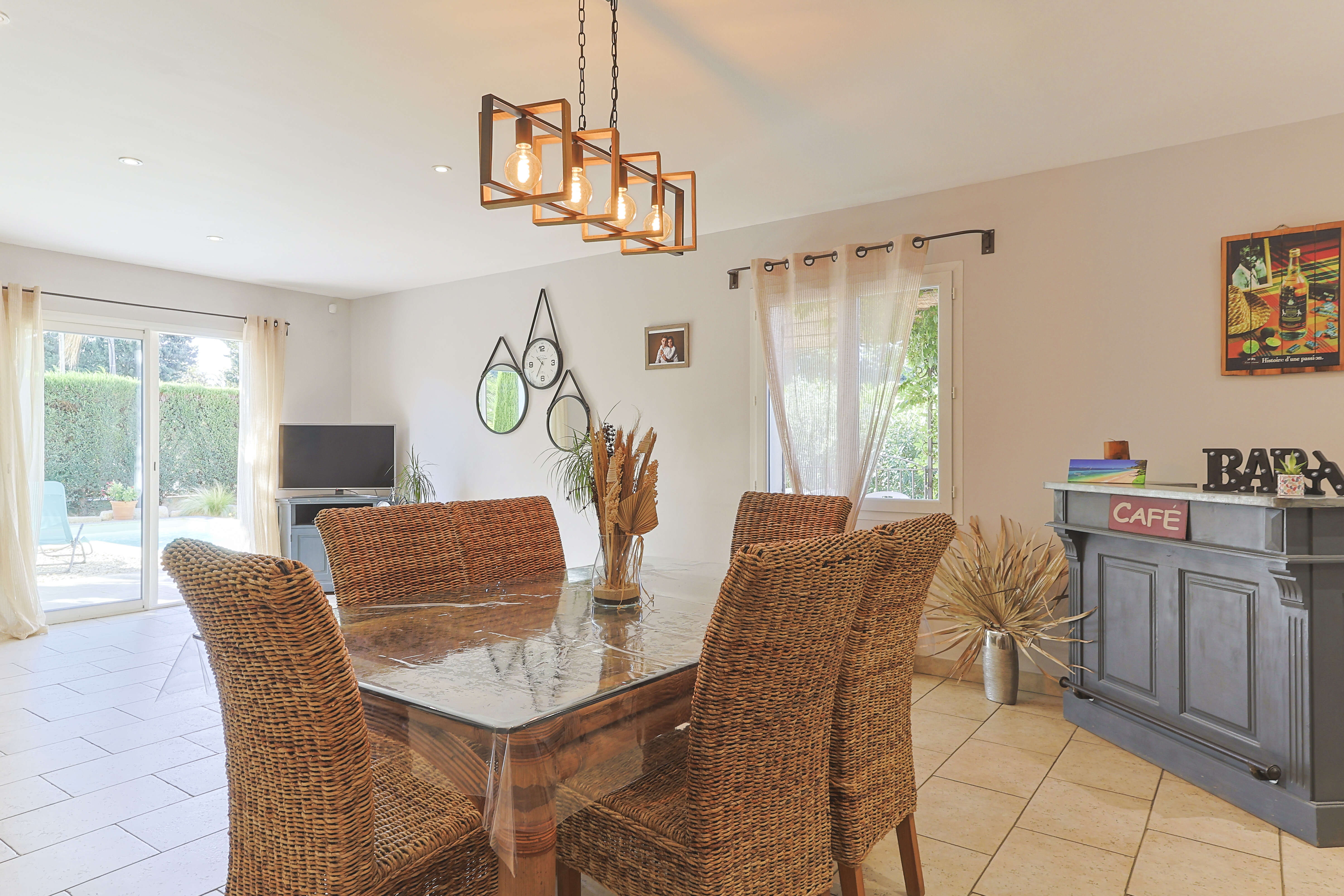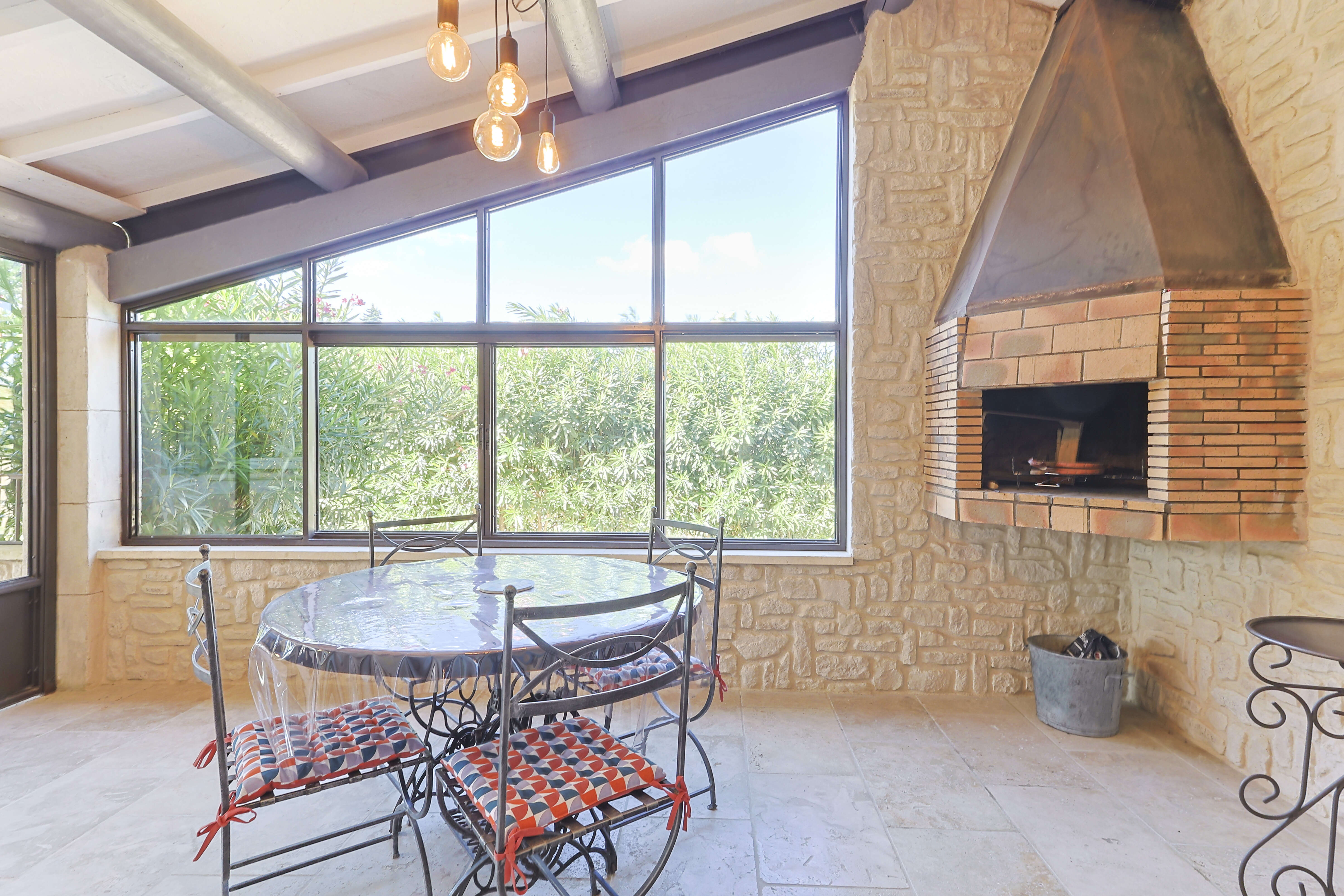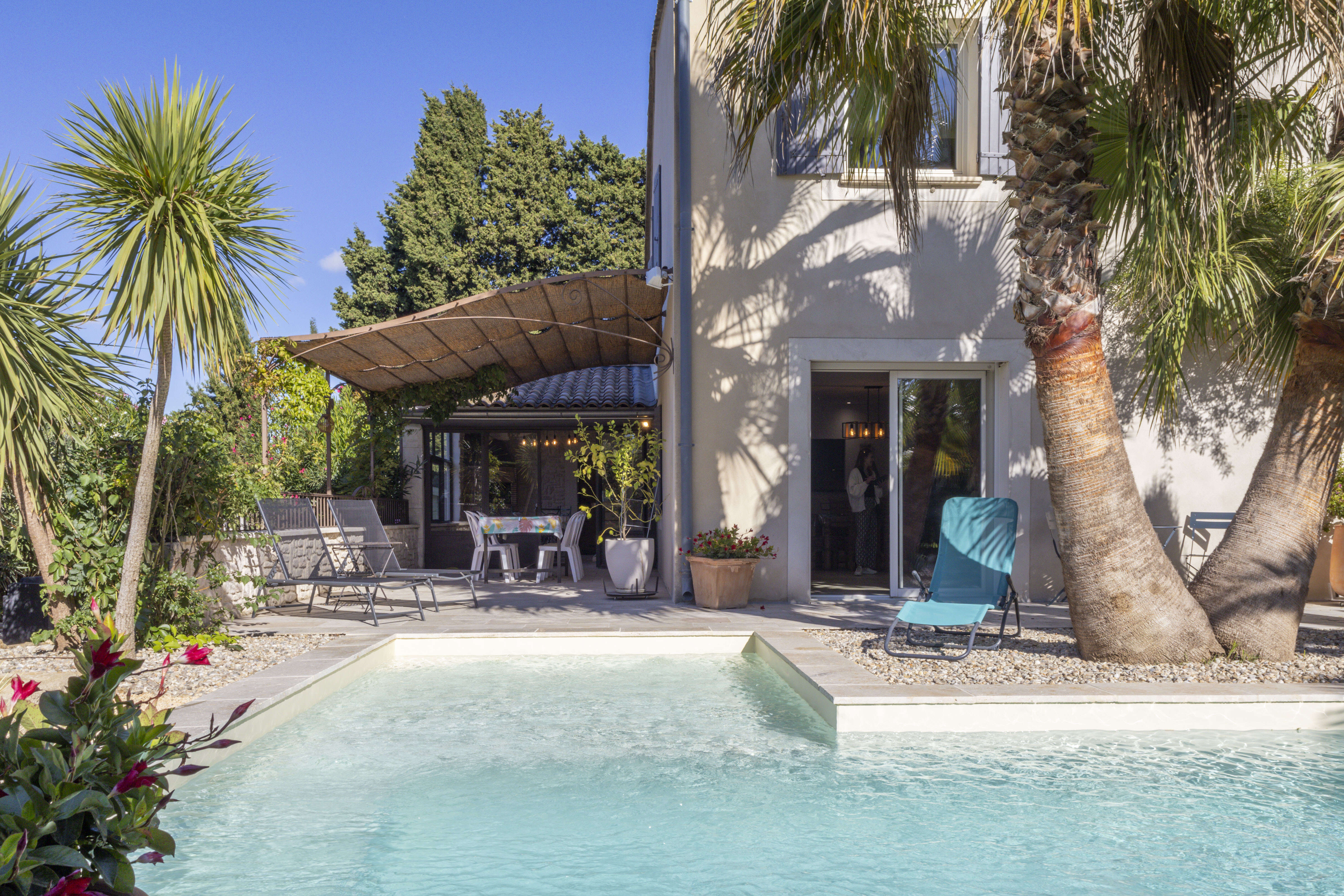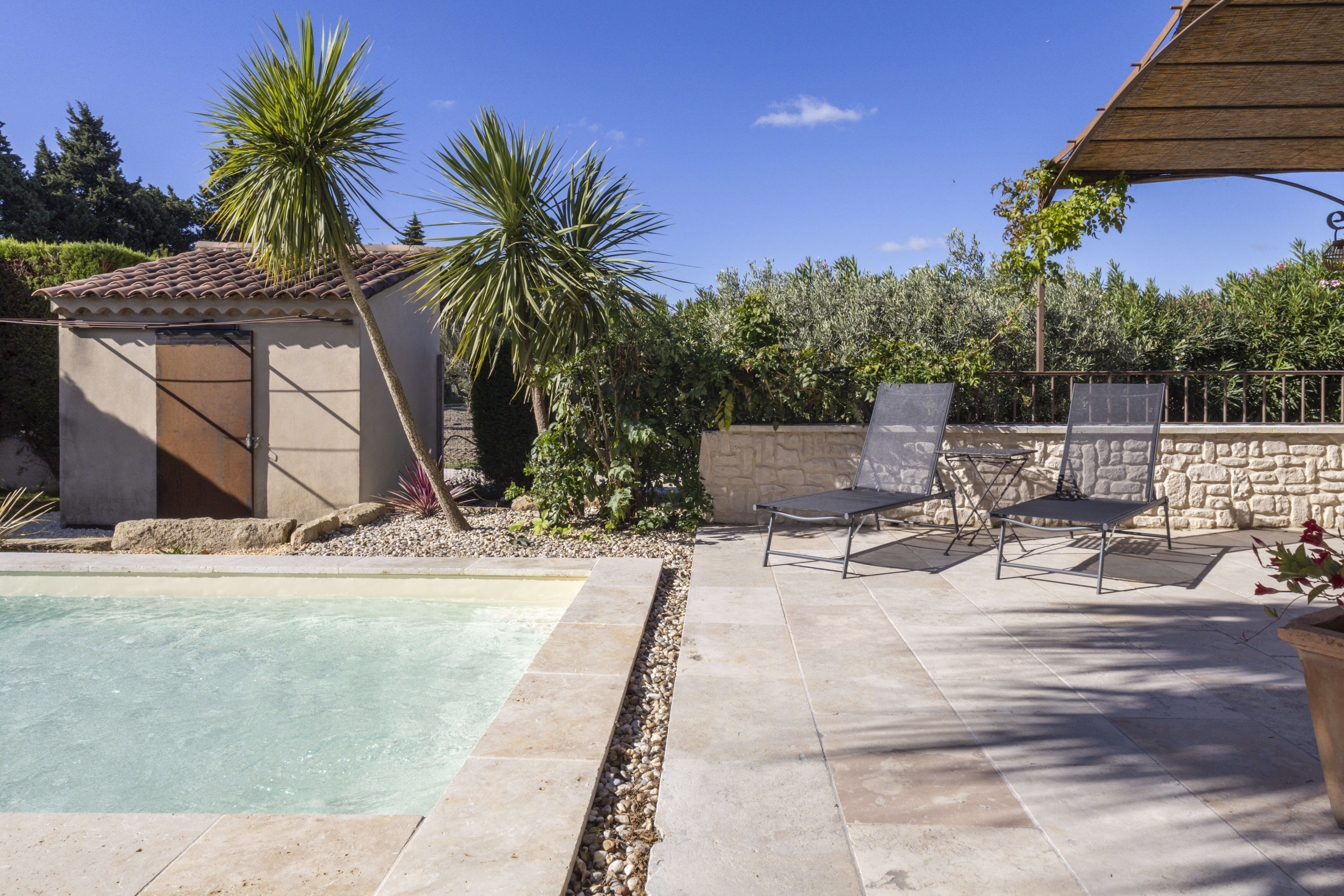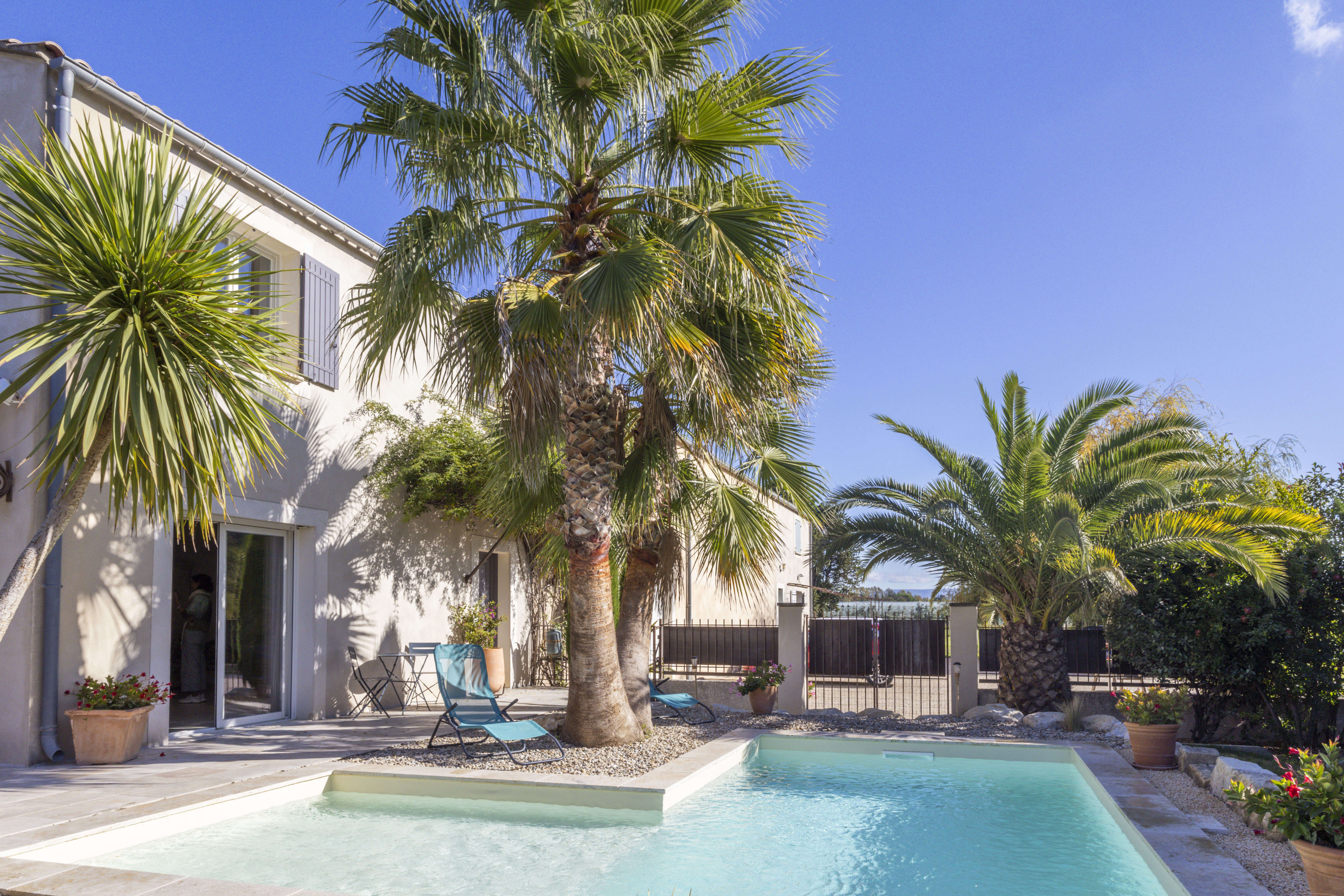 Geniet buiten van een mooi privézwembad in de vorm van een "L", met een kinderbad van 30 cm diep. Aangrenzend aan het huis is er een zeer leuk en ruim overdekt terras met comfortabel tuinmeubilair en een stenen barbecue voor gezellige momenten zowel overdag als 's avonds! Voor jong en oud zijn er ook een pingpongtafel, een petanque baan en zelf een voetbalveld aan de voorkant van het vakantiehuis. De prachtige palmbomen en de avondverlichting zorgen voor een unieke sfeer.