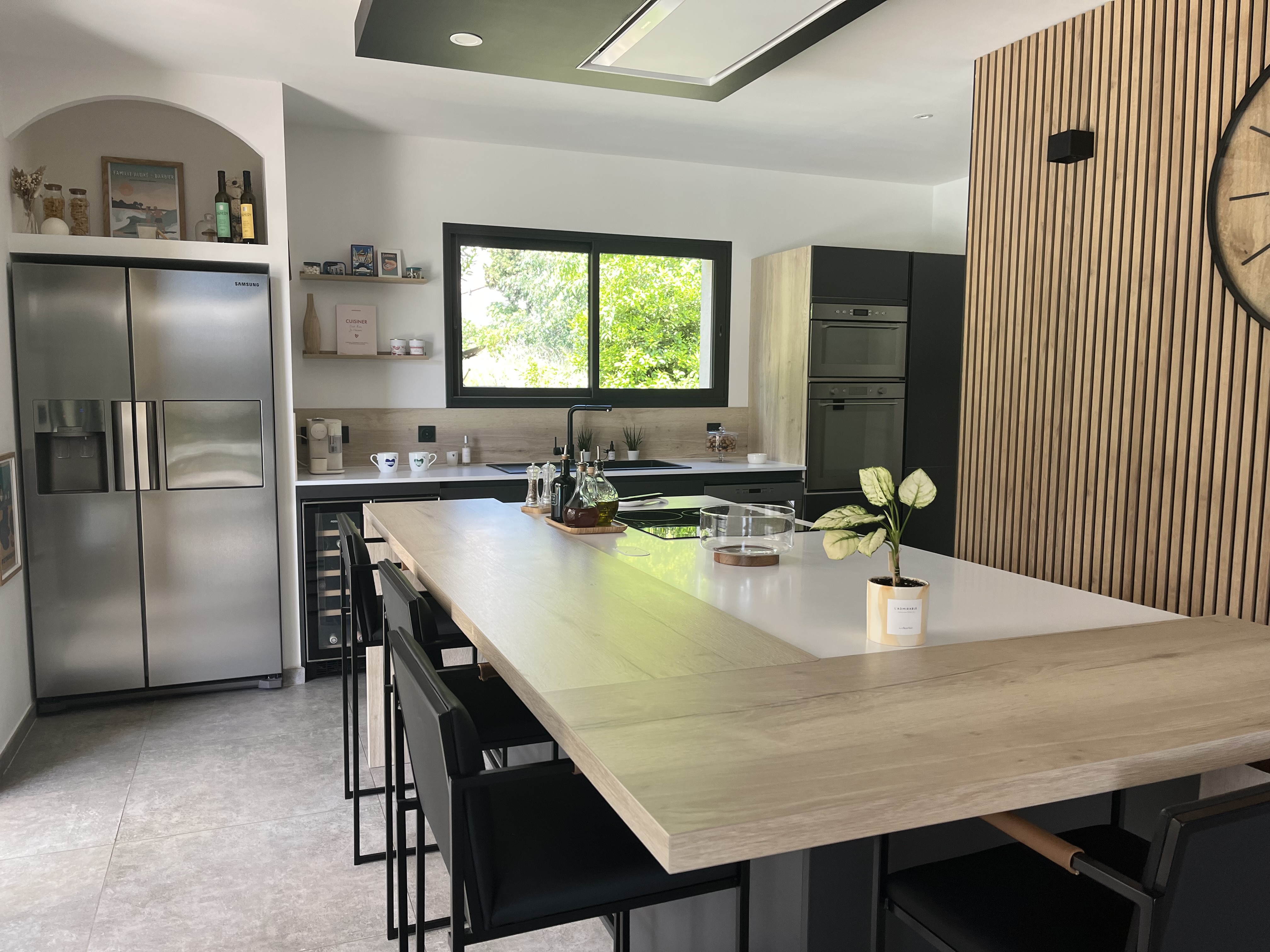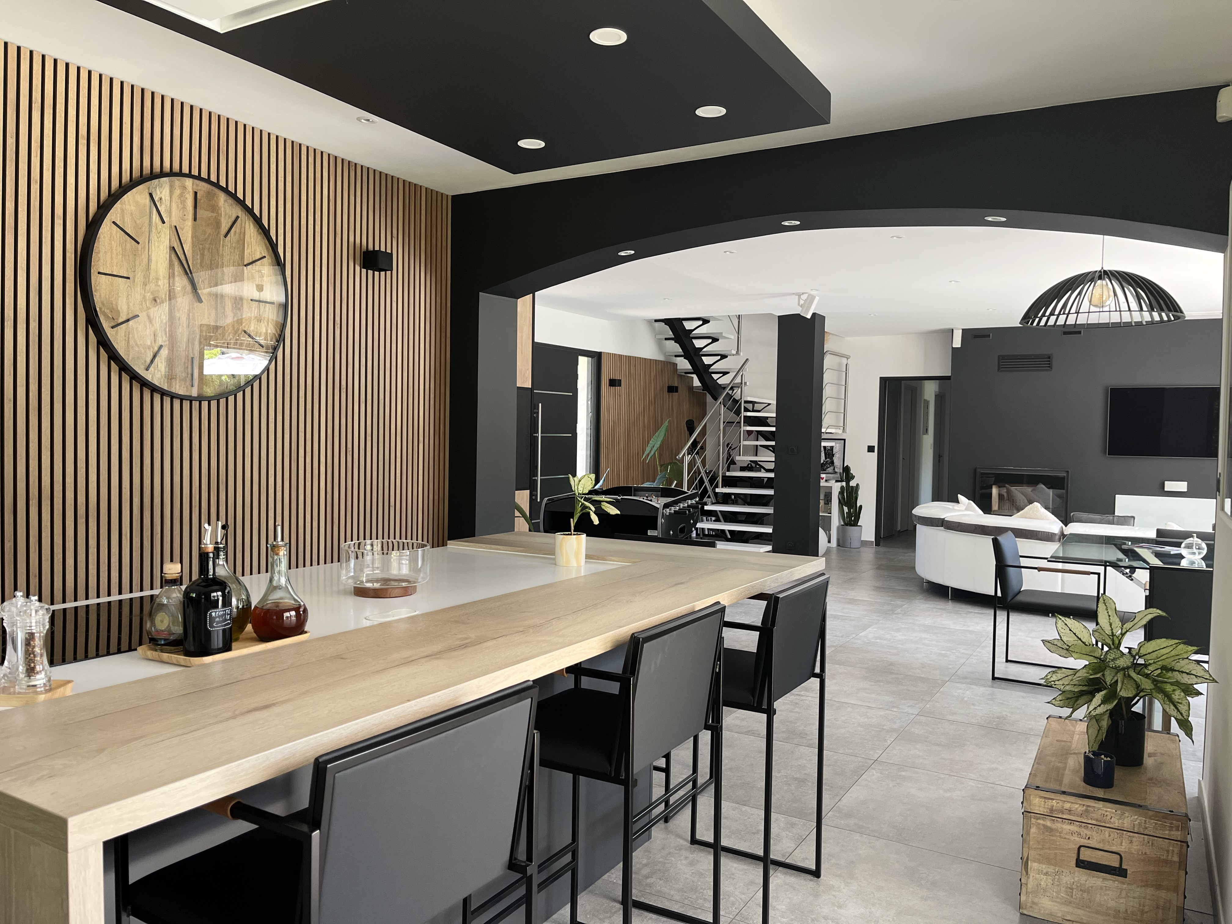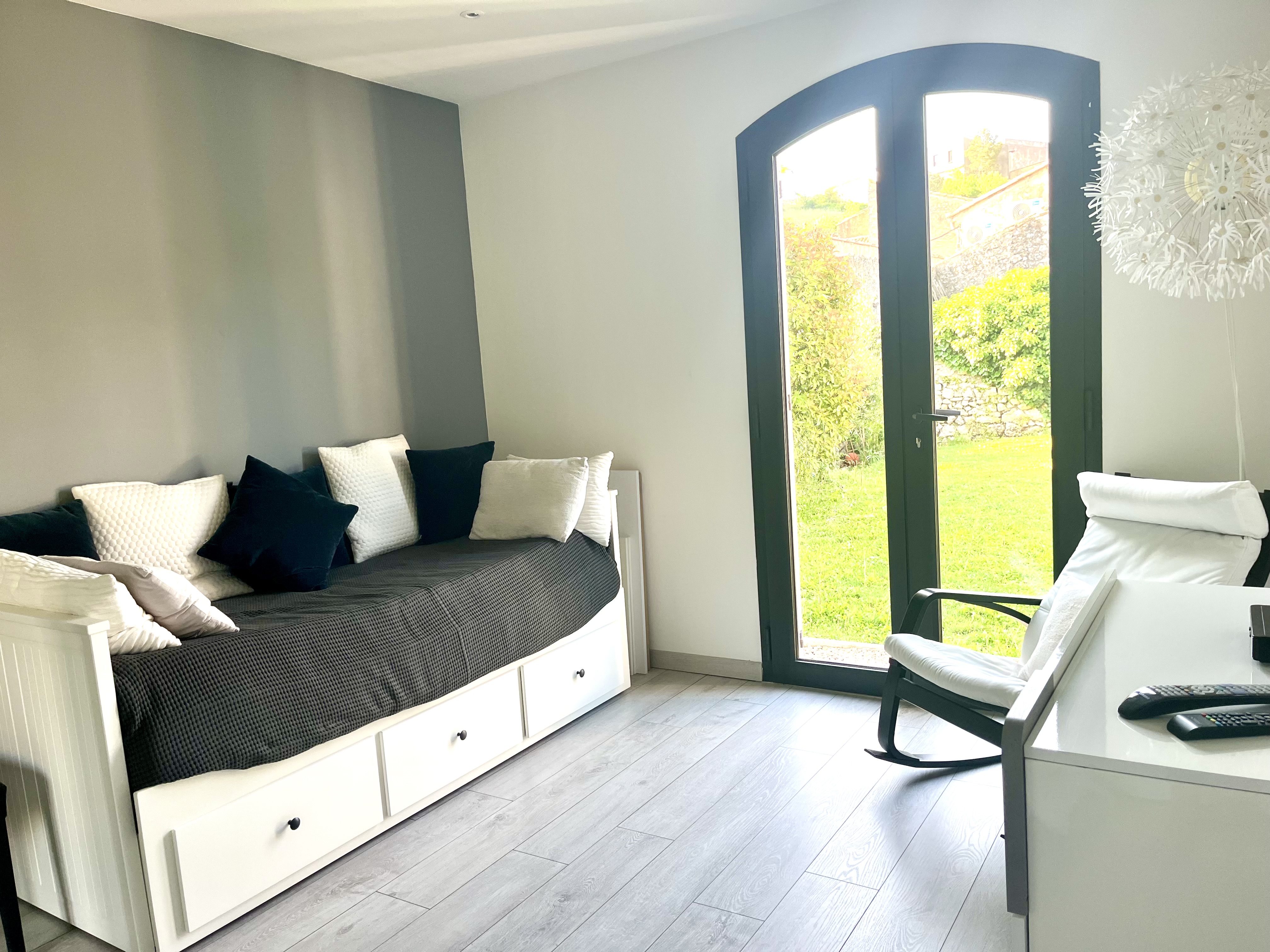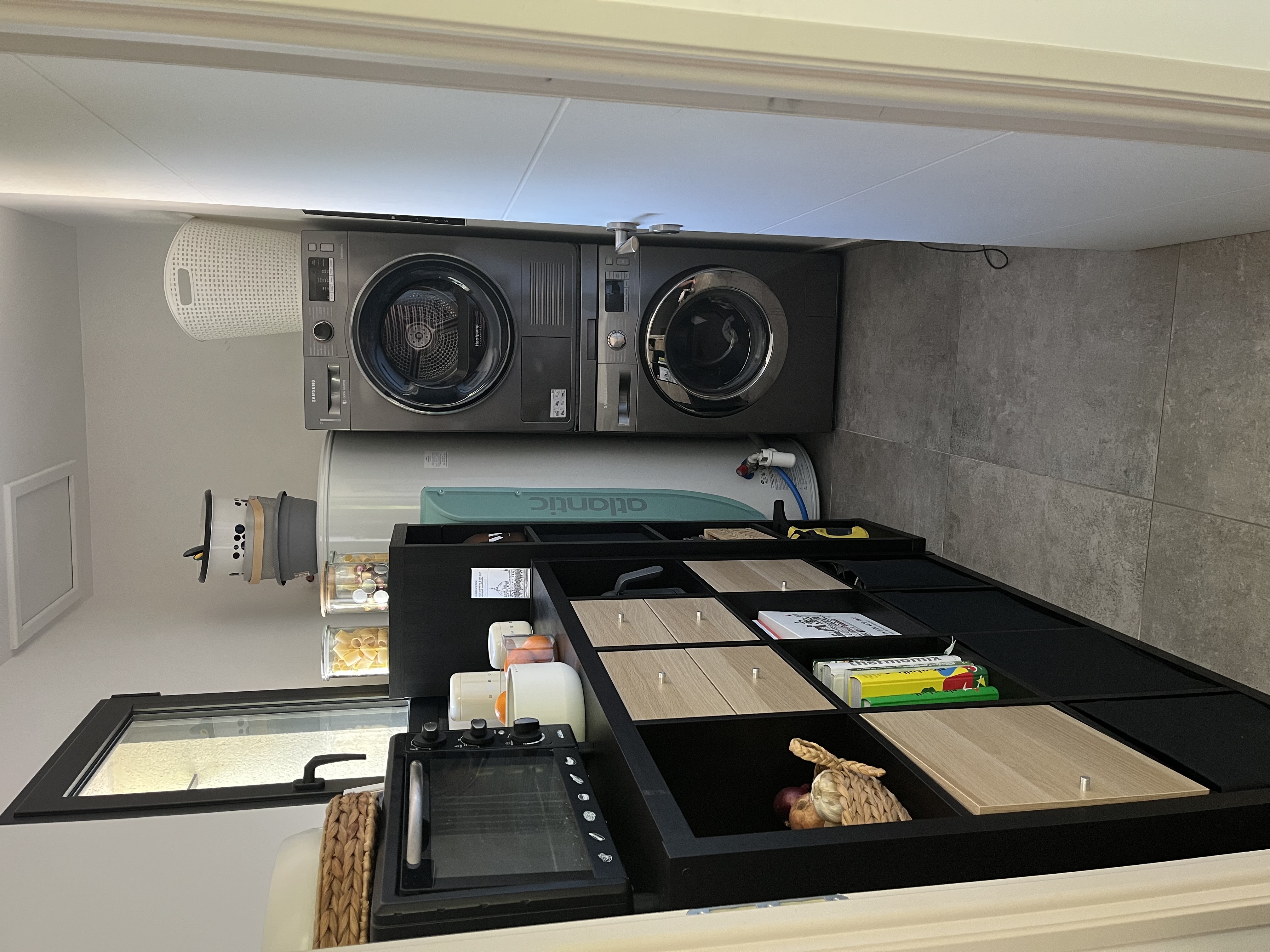Interieur: Comfort en kwaliteit Het interieur van de vakantievilla is zeer comfortabel met veel designkeuzes en kwaliteitsvol meubilair, wat zorgt voor een moderne en strakke uitstraling. De open keuken en leefruimte geven rechtstreeks uit op het terras, dat uitgerust is met een tafel en buitenstoelen. Grote ramen in de woonkamer en keuken bieden direct zicht op de tuin en laten overvloedig daglicht binnen in de leefruimtes. De slaapkamers zijn ruim en comfortabel ingericht en voorzien van airconditioning.