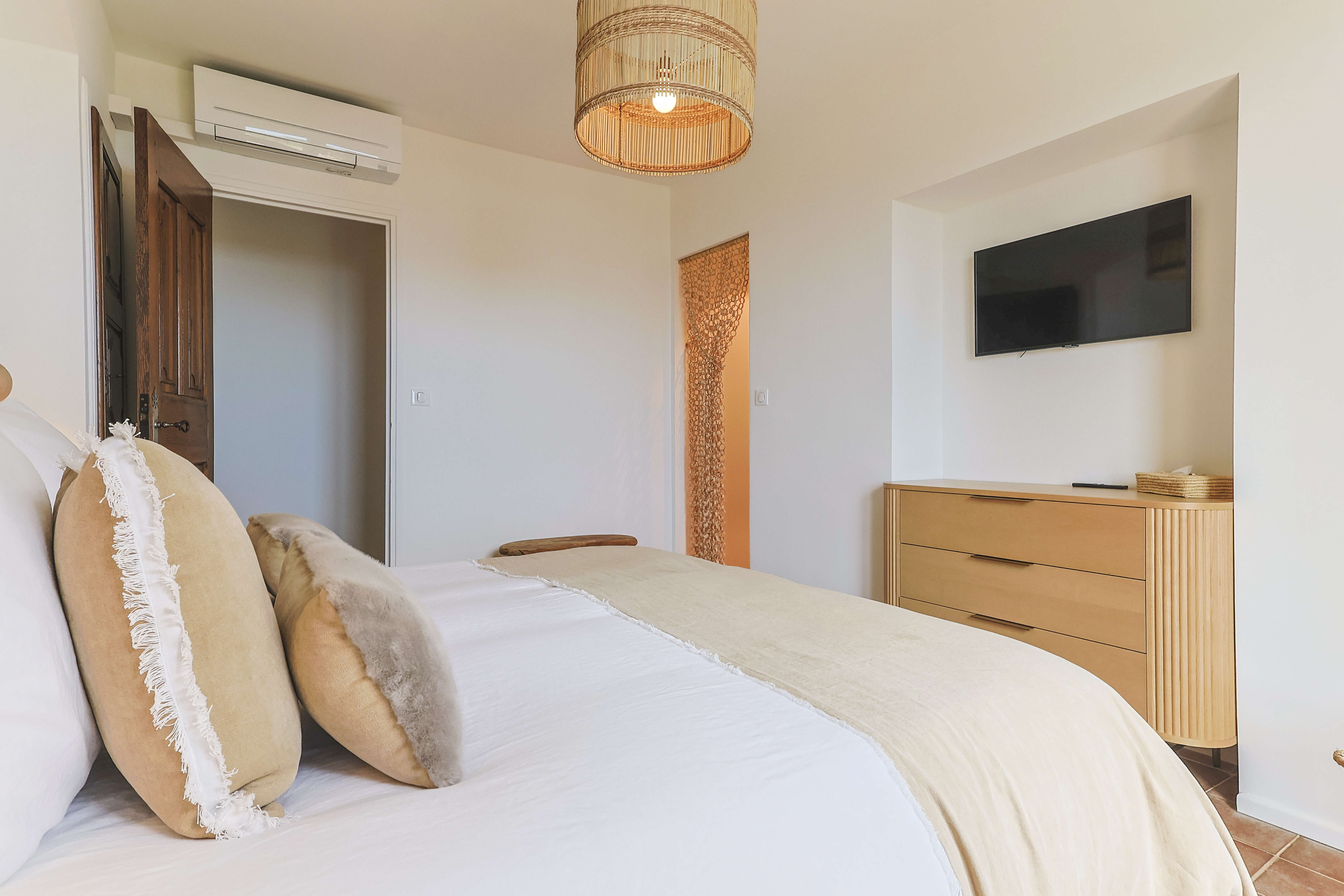 Deze vakantievilla, geschikt voor 6 personen, werd met veel zorg en aandacht ingericht. Het interieur straalt een warme, huiselijke sfeer uit, gecombineerd met luxueuze materialen en een bijzonder smaakvolle inrichting. Alle slaapkamers genieten van verfrissende airco voor een aangename nachtrust in de zwoele zomeravonden en twee slaapkamers hebben terrassen met uitzicht op zee.