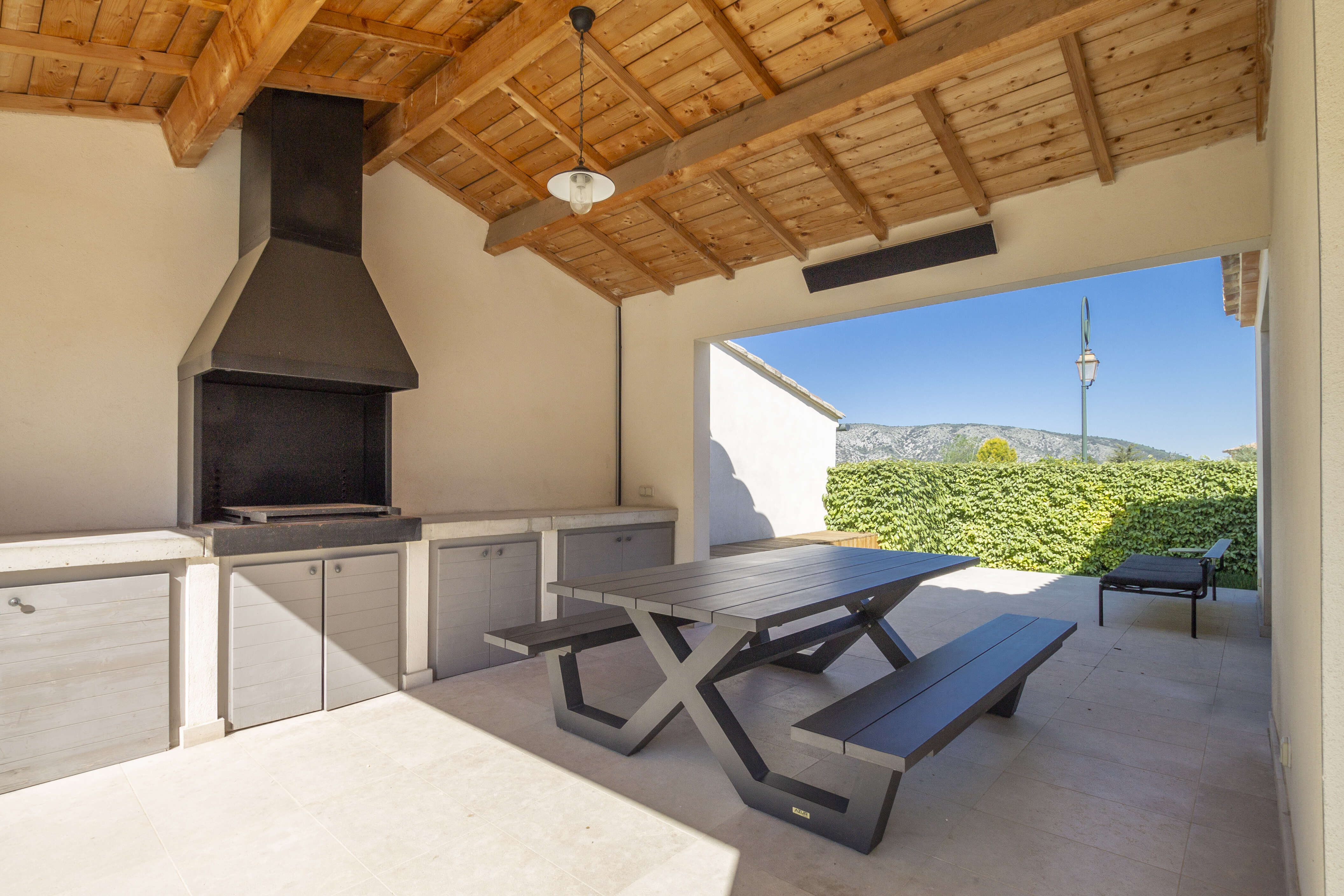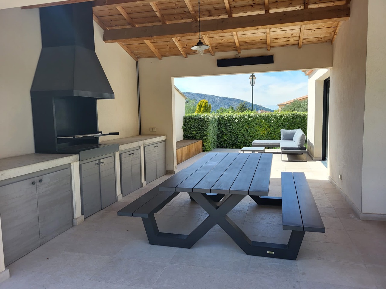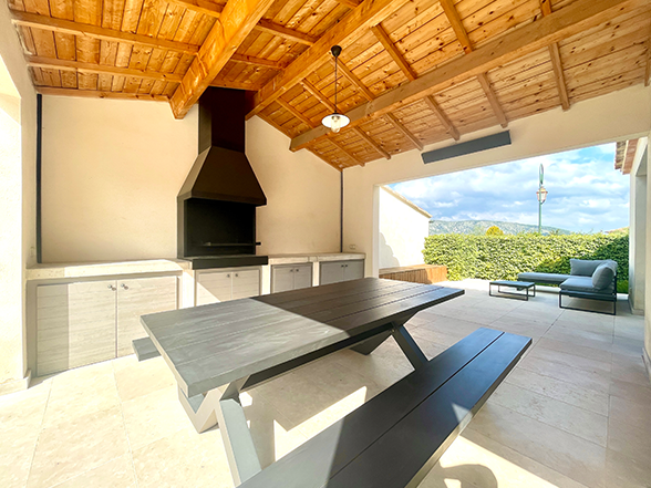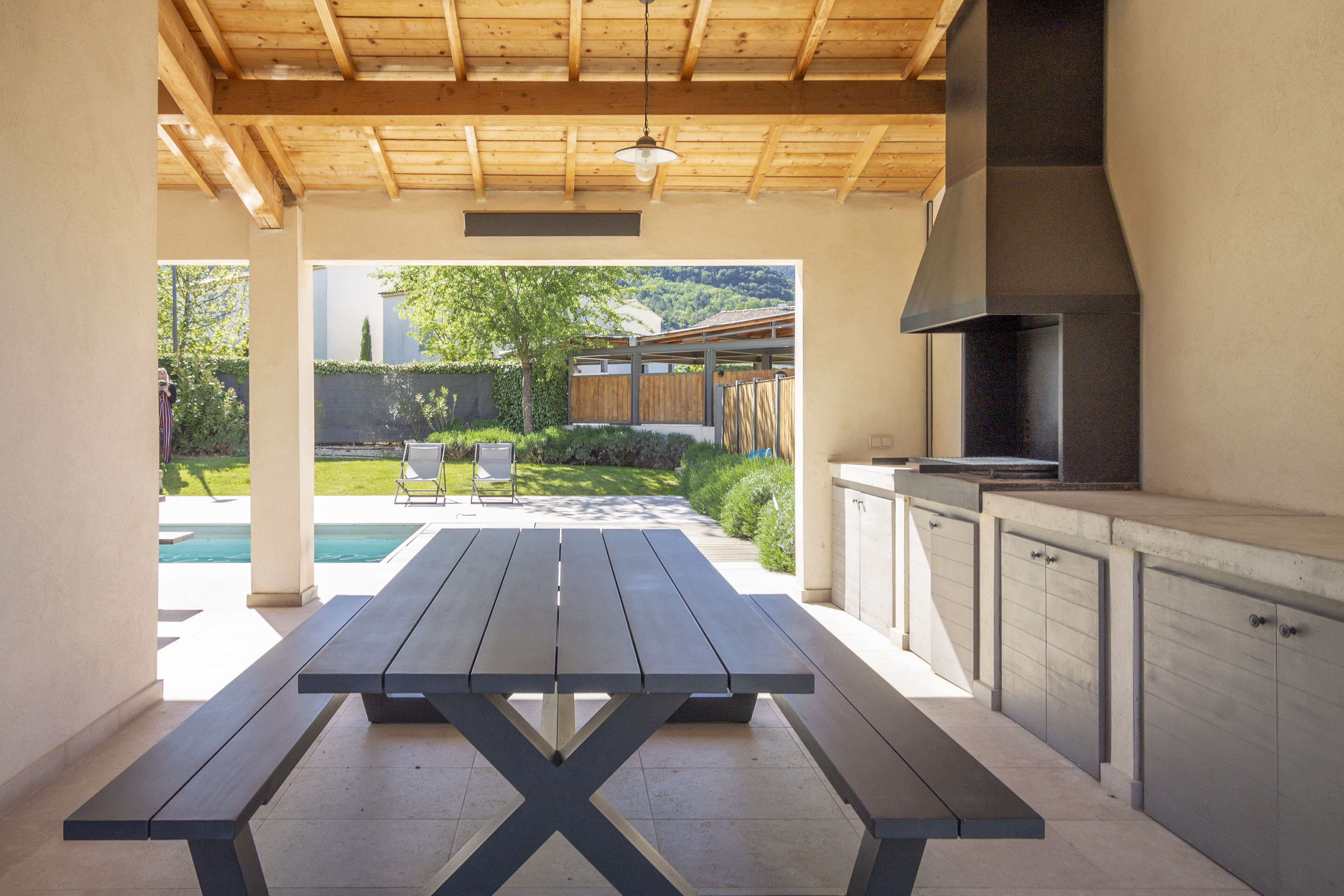 De buitenkeuken met grote barbecue bevindt zich onder het mooie overdekte terras, waar je zalig kan aperitieven en gezellig dineren tijdens de zwoele zomeravonden. Je kan er genieten van het mooie landschap en zicht op het zwembad.