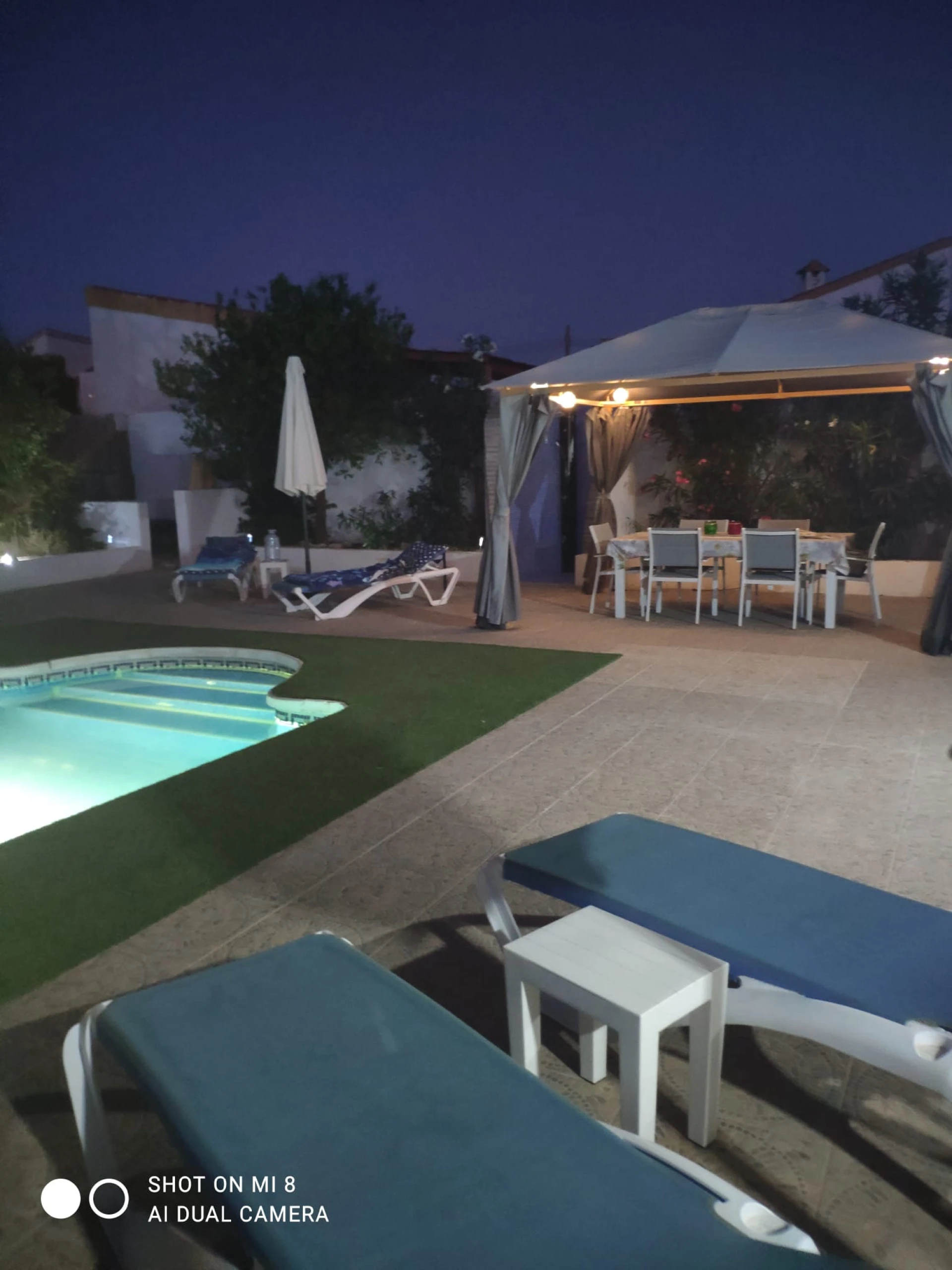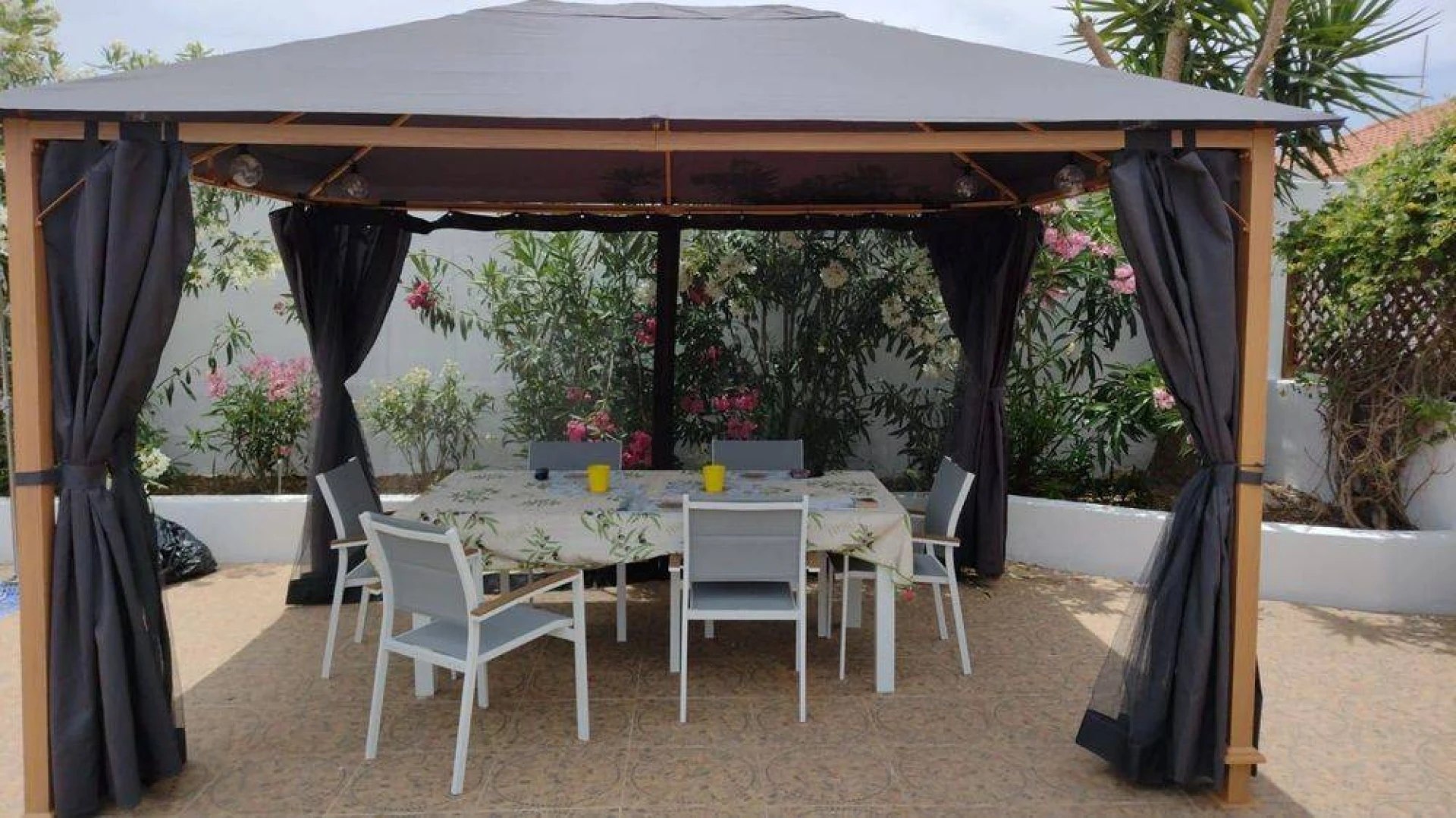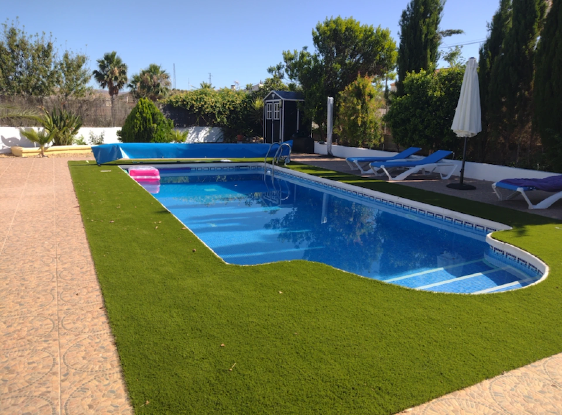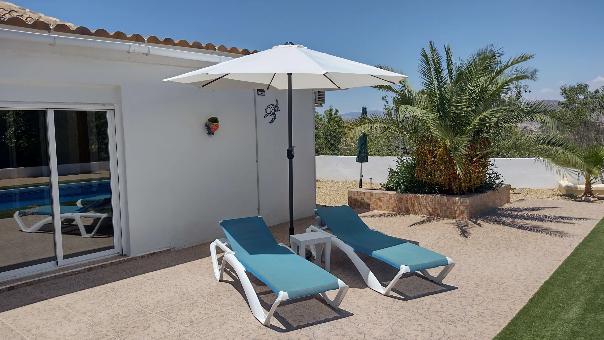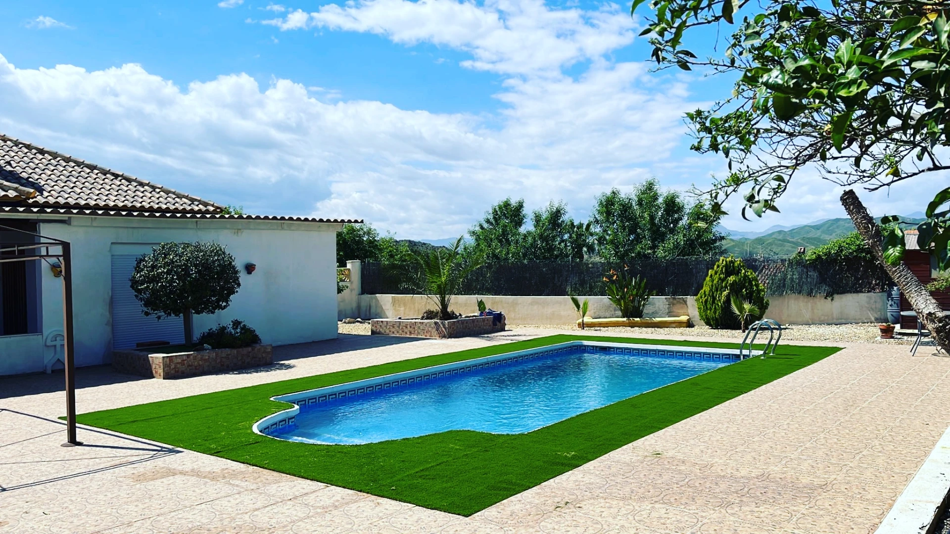Vanuit de veranda leidt een deur naar het privézwembad en de tuin. De tuin is zeer goed onderhouden en biedt betegelde patio's en zonneterrassen om te zonnebaden en te zitten. Vanop de terrassen geniet je van een panoramisch uitzicht op de bergen. De achtertuin centreert zich rondom het verlicht en verwarmd privé zwembad (8x4m en 2,20m diepte, met afdekzeil op rol en romeinse treden in zwembad)