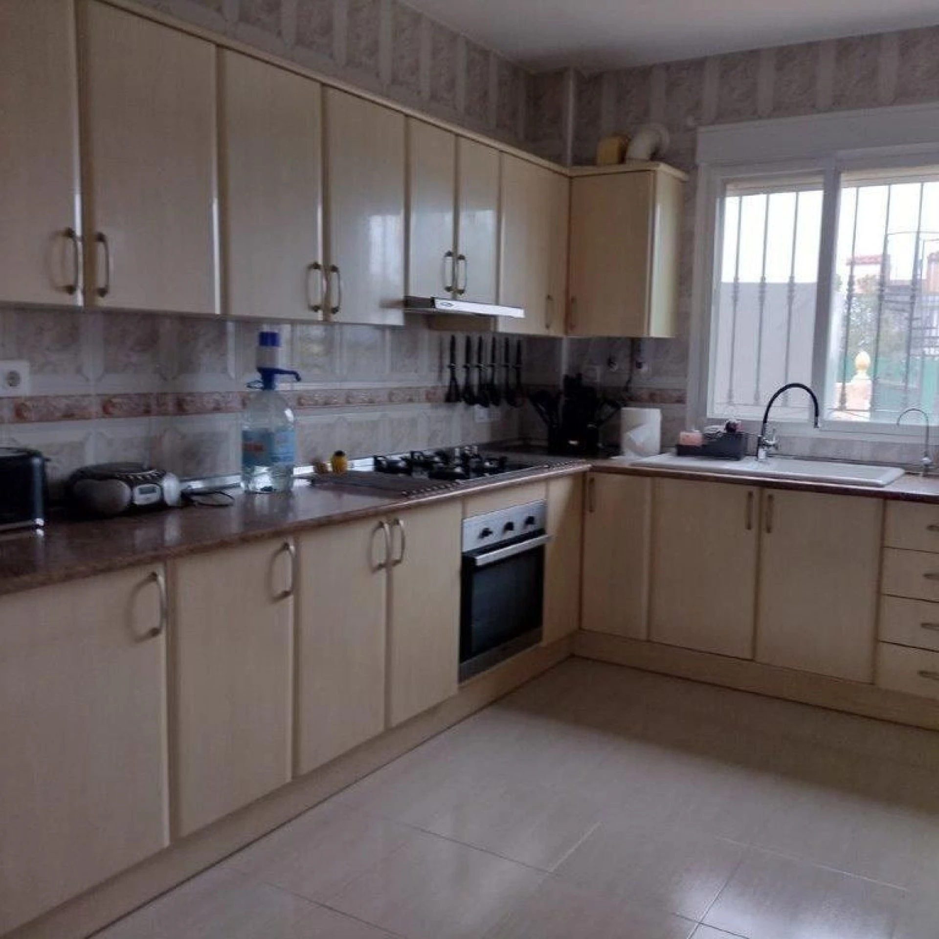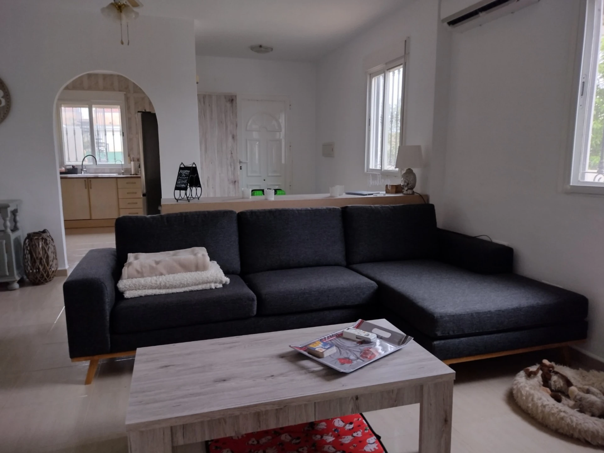 Het interieur is comfortabel met op het gelijkvloers een ruime lounge met airconditioning en plafondventilatoren. Vanuit de woonkamer leidt een boog naar een volledig ingerichte keuken. Aan de rechterkant van de lounge is een kleine hal die vervolgens leidt naar de familie badkamer en twee slaapkamers. Een van de slaapkamers is de master, dat is een mooie grote kamer met inbouwkasten en een en-suite badkamer. Aan de achterzijde van de woonkamer leiden dubbele schuifdeuren naar een mooie veranda en een derde slaapkamer.