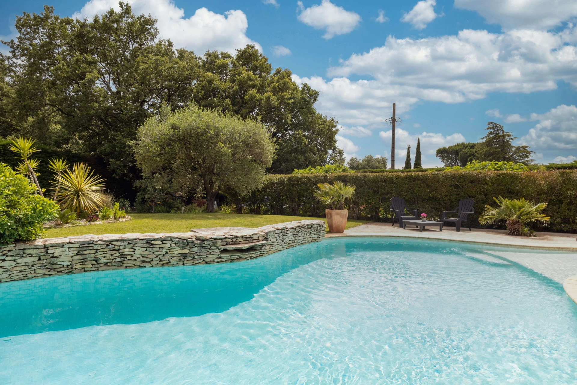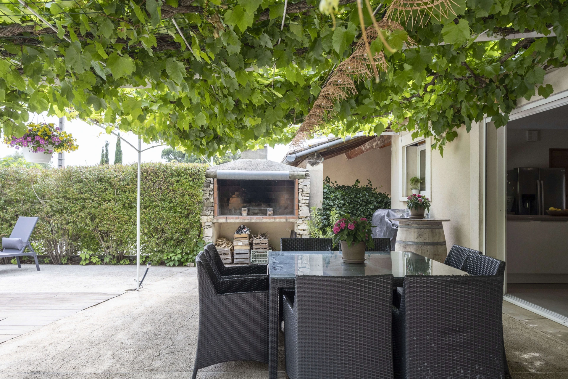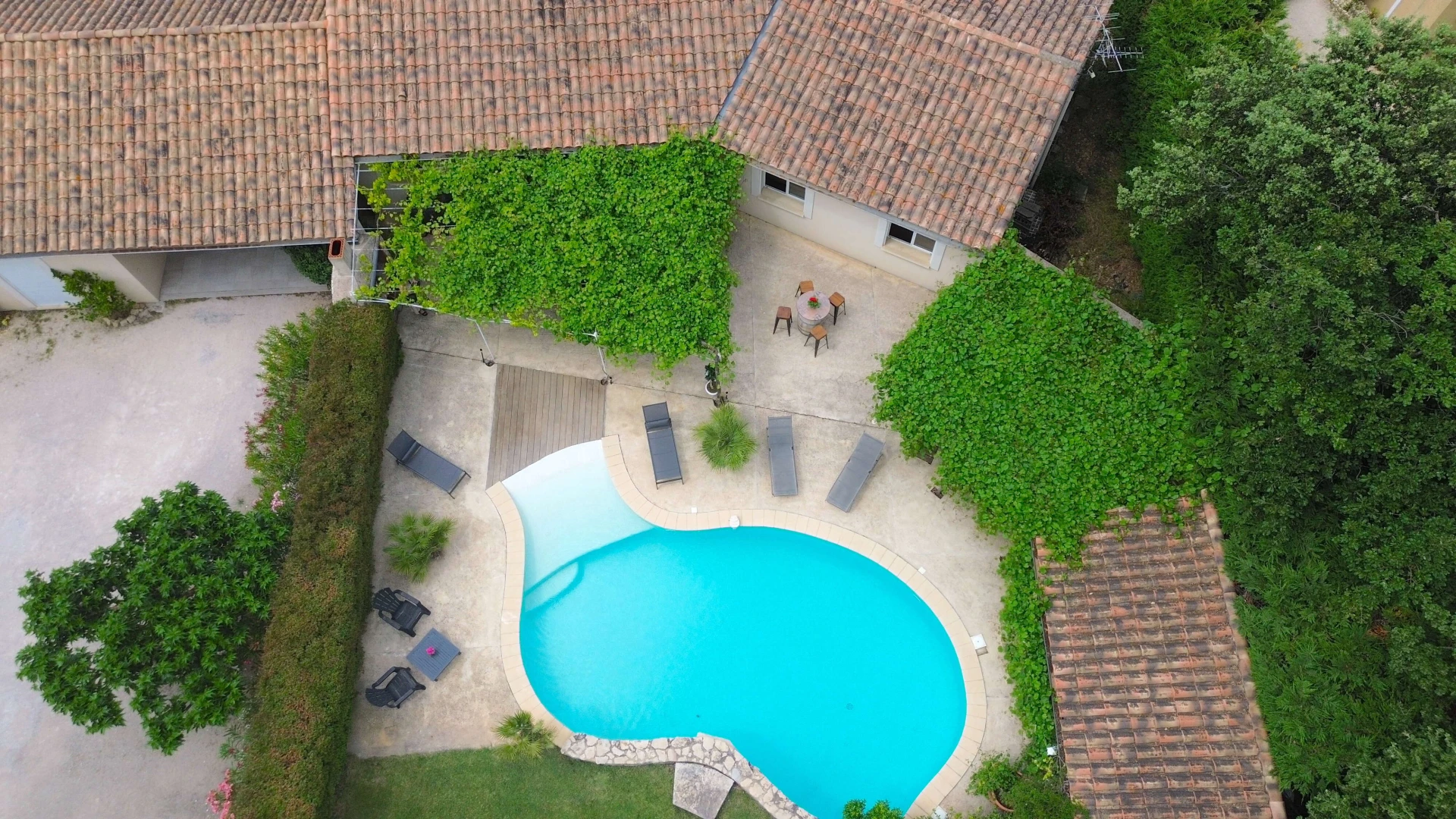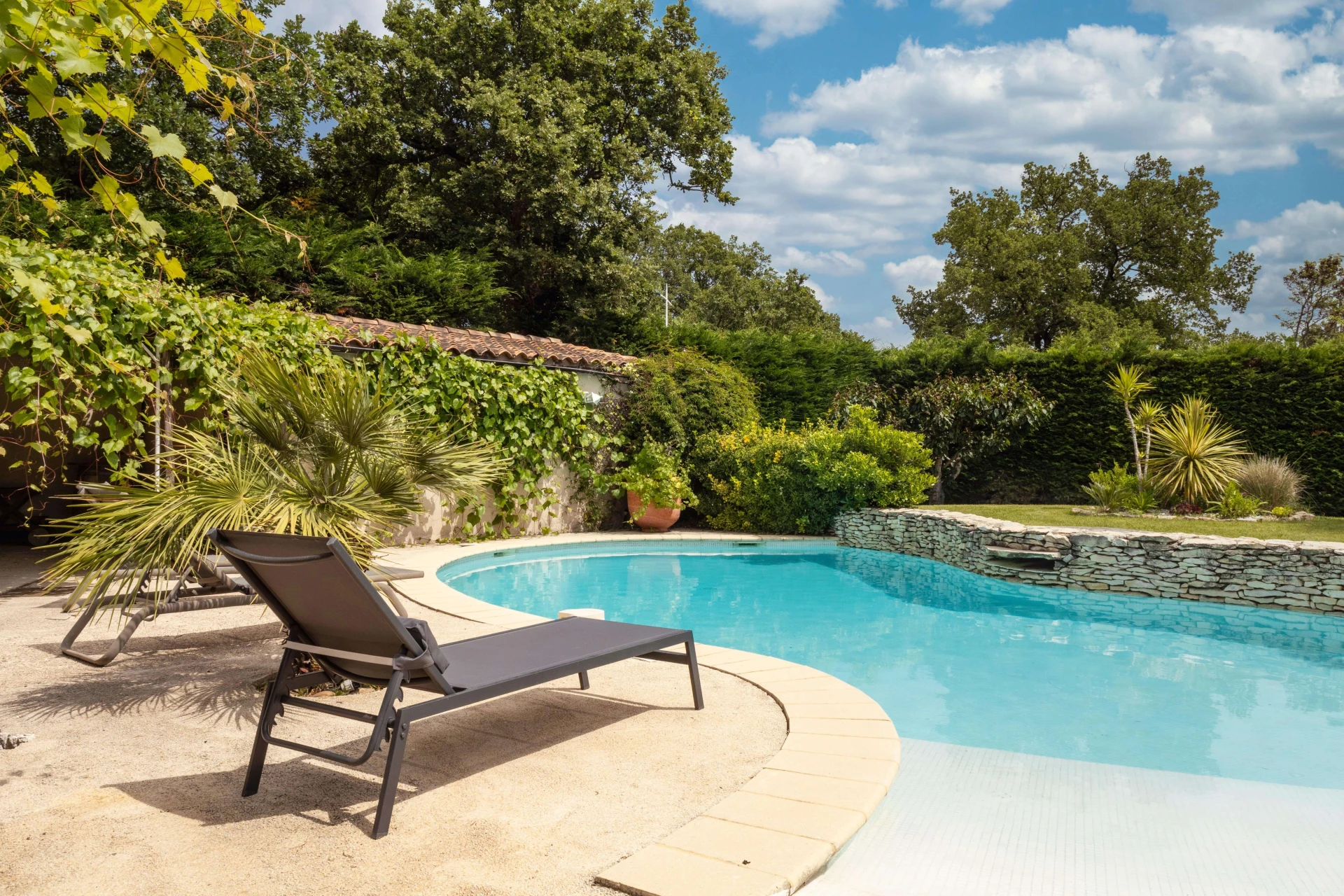 Er zijn ruime en mooie terrassen met 2 super aangename pergolas. Het privé zwembad (10x5m - 1,10m tot 1,60m diep met fonteintje) is prachtig en heel speciaal door zijn mooie vorm. Aan het zwembad is er een poolhouse met douche, toilet, lavabo, frigo en microgolf. Er is tevens een gemetste barbecue.