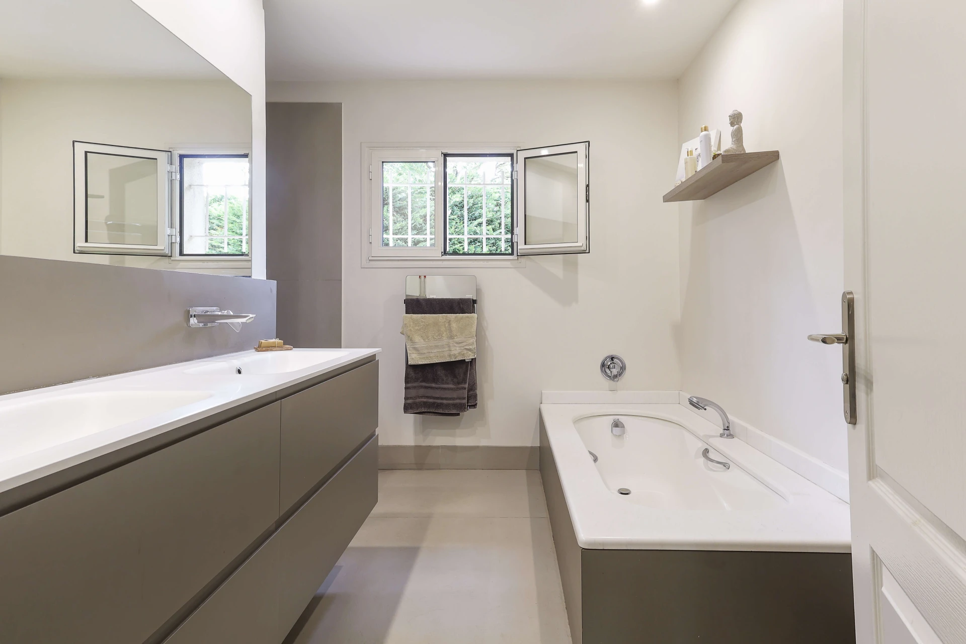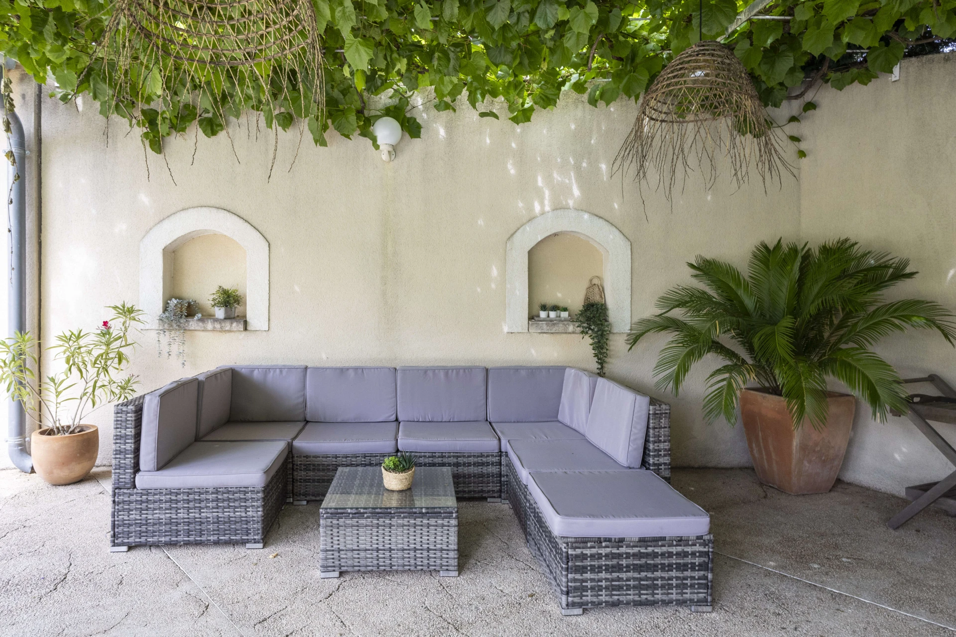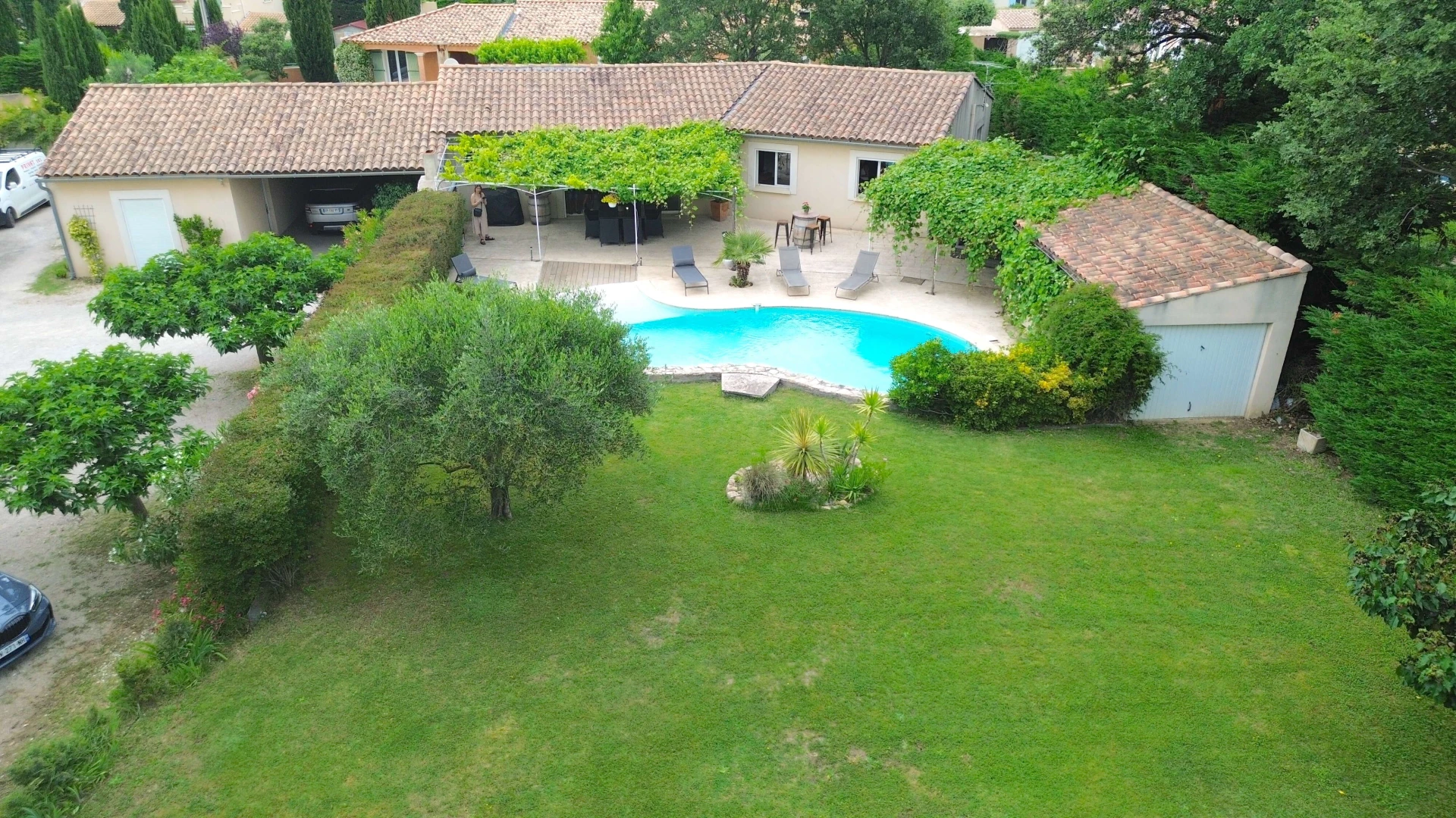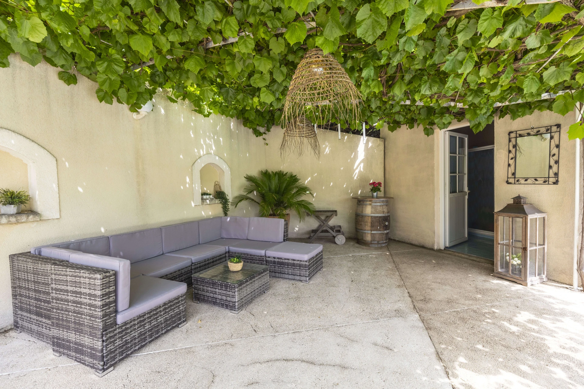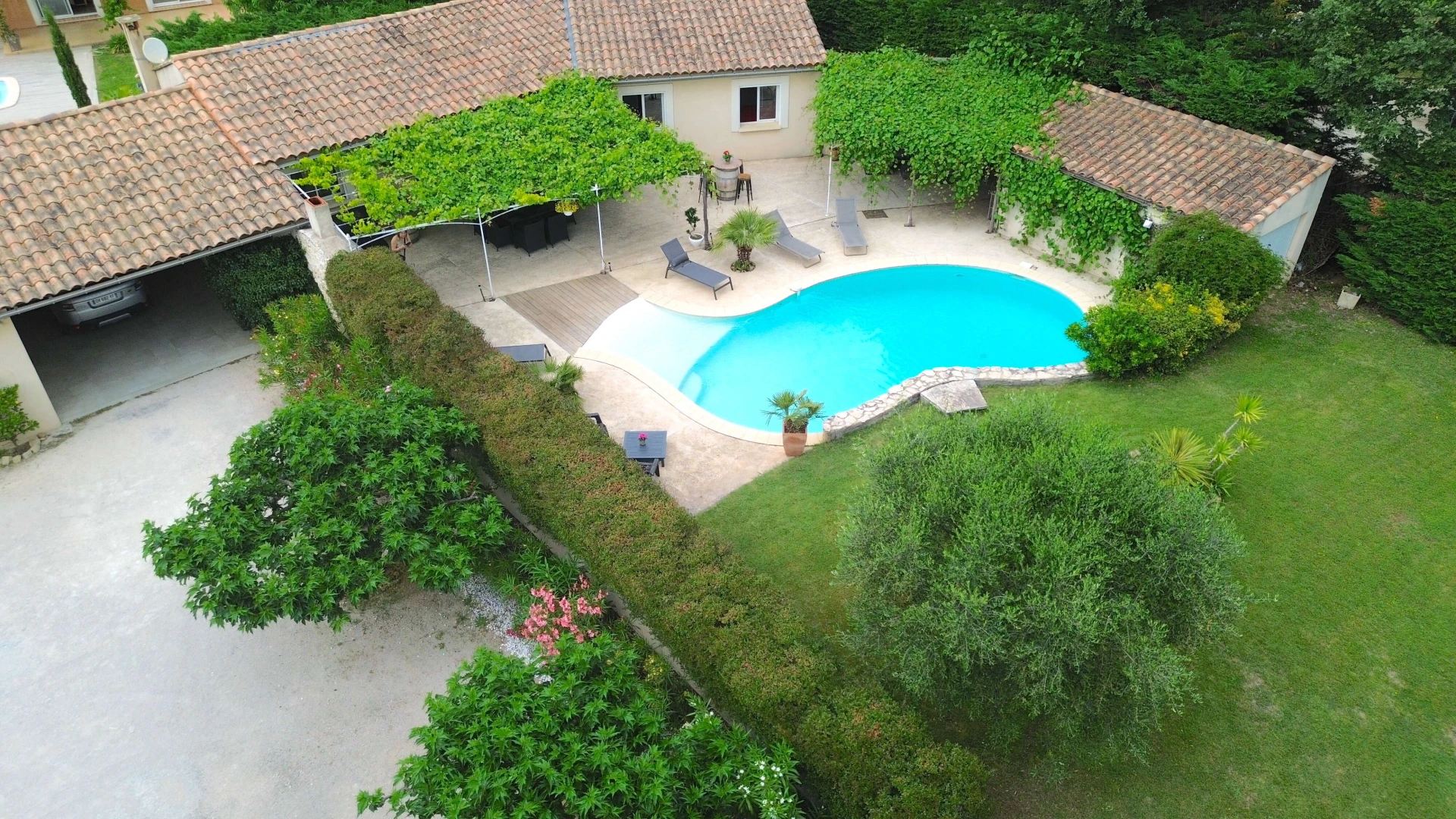 Er zijn ruime en mooie terrassen met 2 super aangename pergolas. Het privé zwembad (10x5m - 1,10m tot 1,60m diep met fonteintje) is prachtig en heel speciaal door zijn mooie vorm. Aan het zwembad is er een poolhouse met douche, toilet, lavabo, frigo en microgolf. Er is tevens een gemetste barbecue.