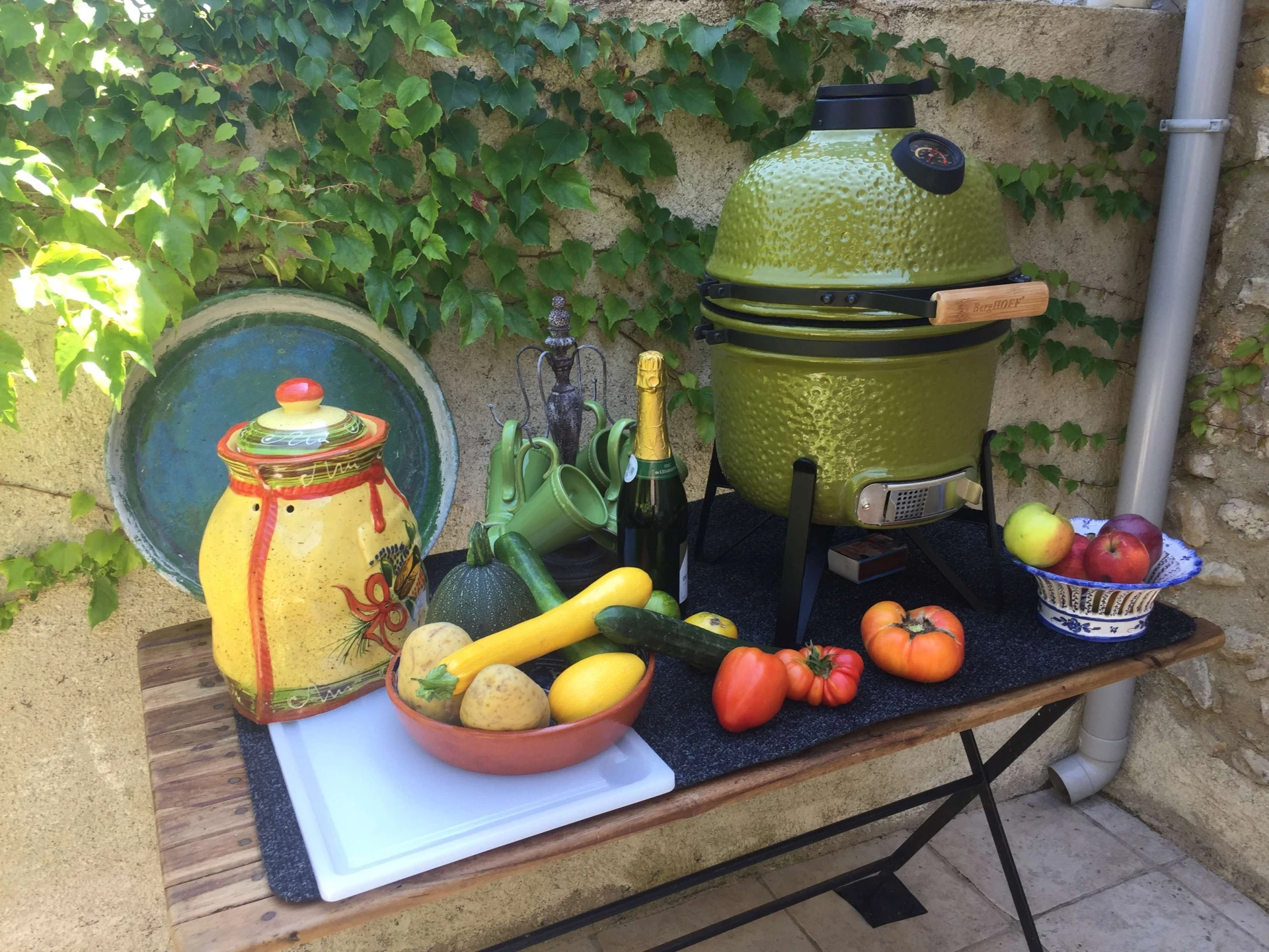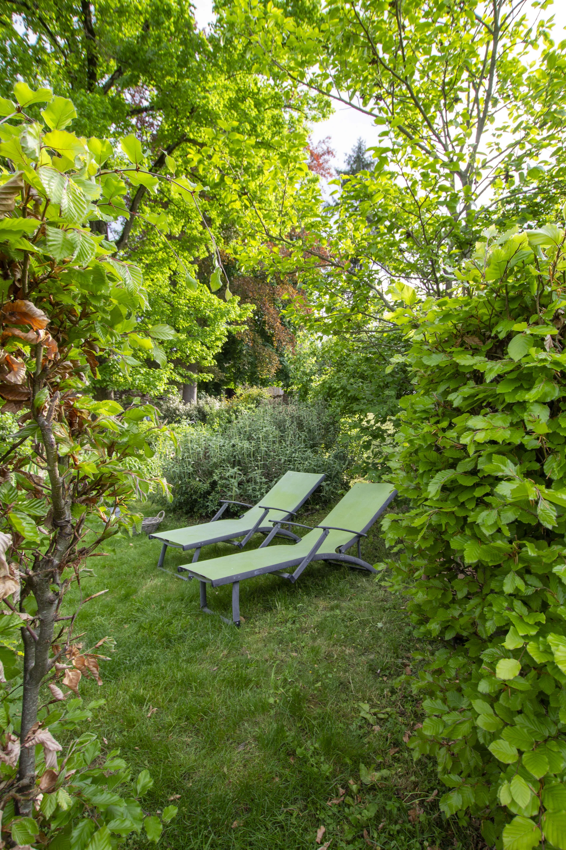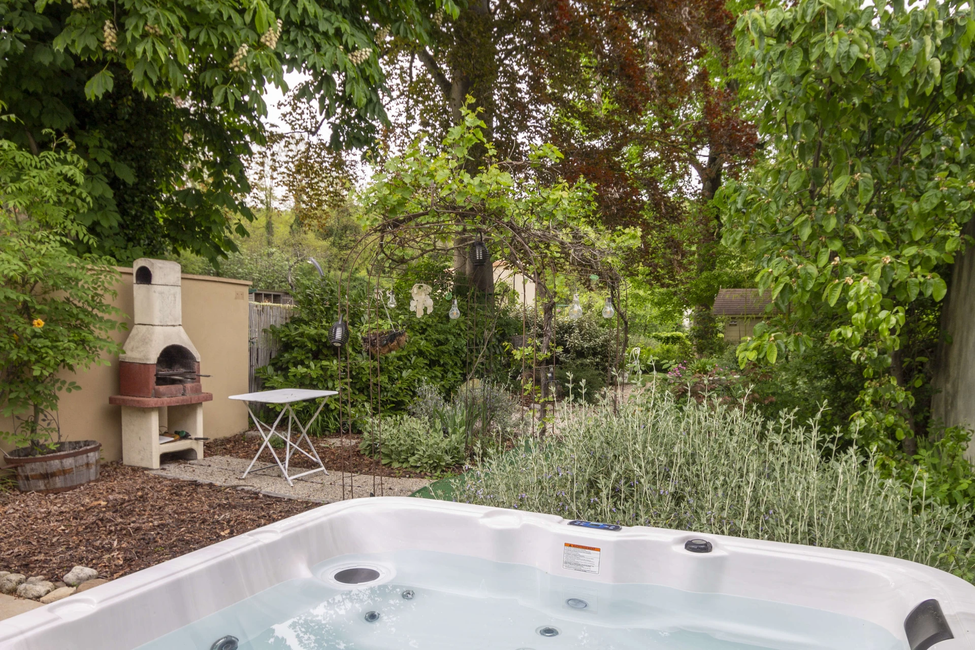 De tuin is bijzonder gezellig met veel kruiden en planten. Er is een barbecue, maar ook een egg-cooker waar je heerlijke gerechten kan in klaarmaken. 's Avonds is het zeer sfeervol en romantisch door de verlichte tuin en het verlicht zwembad.