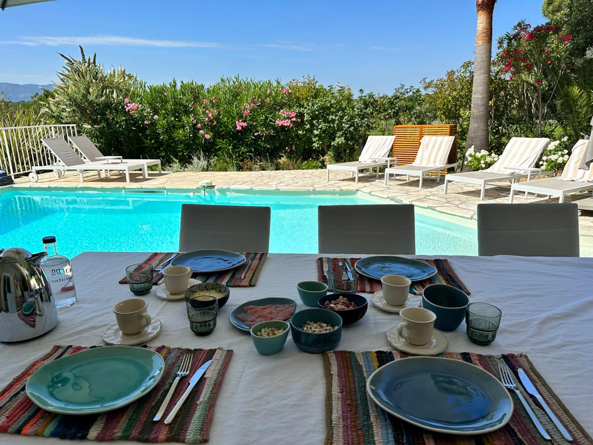 Buiten wacht het echte vakantiegevoel. De villa beschikt over een verwarmd privézwembad (6x3 m, 1,70 m diep), beschikbaar van begin april tot eind november. Rondom het zwembad vind je comfortabele ligstoelen en gezellige hoekjes om te genieten van de zon, de rust en het uitzicht. De tuin is een oase van groen en stilte, met adembenemende zichten op de omliggende wijnvelden en het Massif des Maures. Hier ervaar je het beste van het buitenleven in de Provence.
