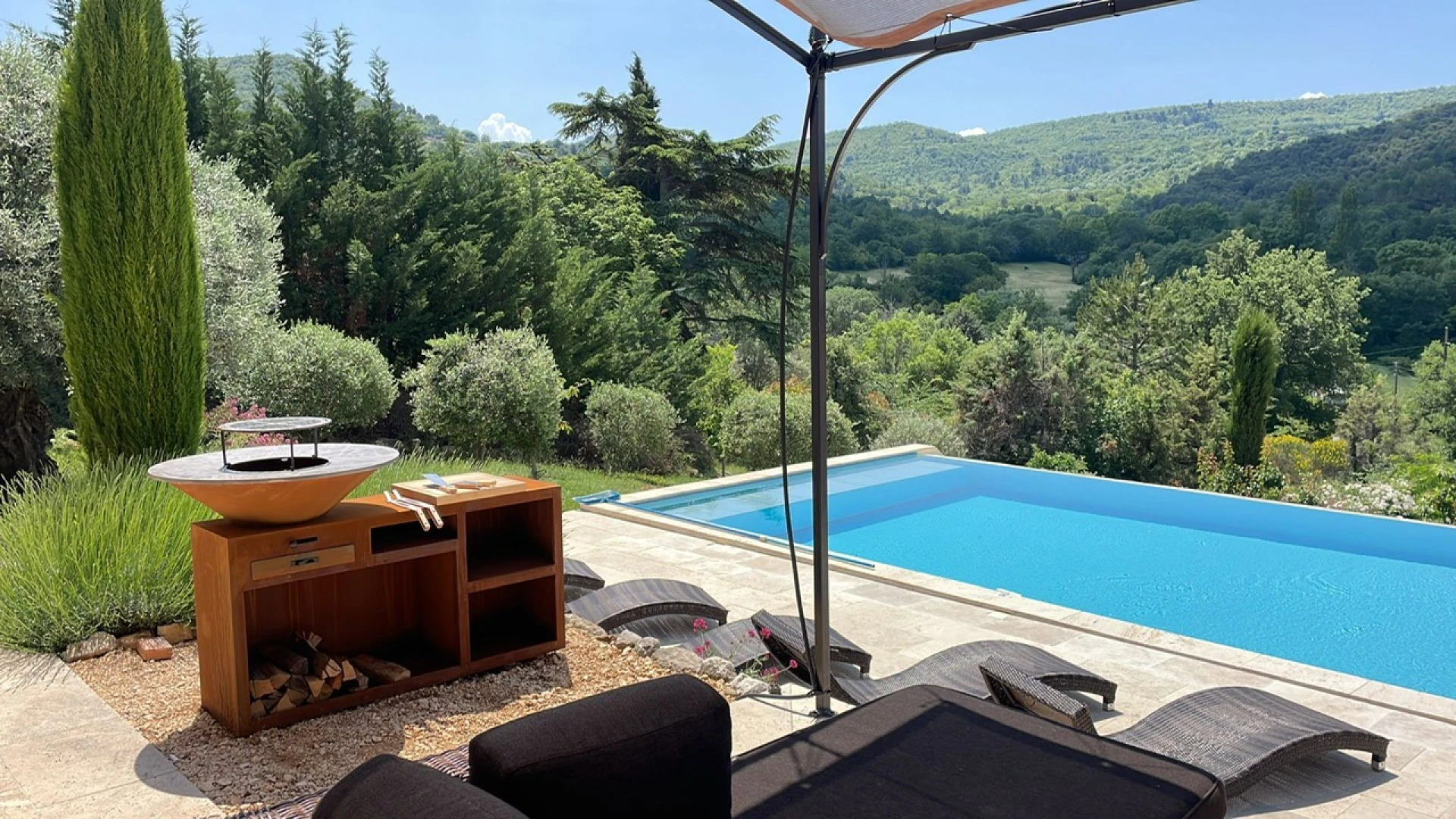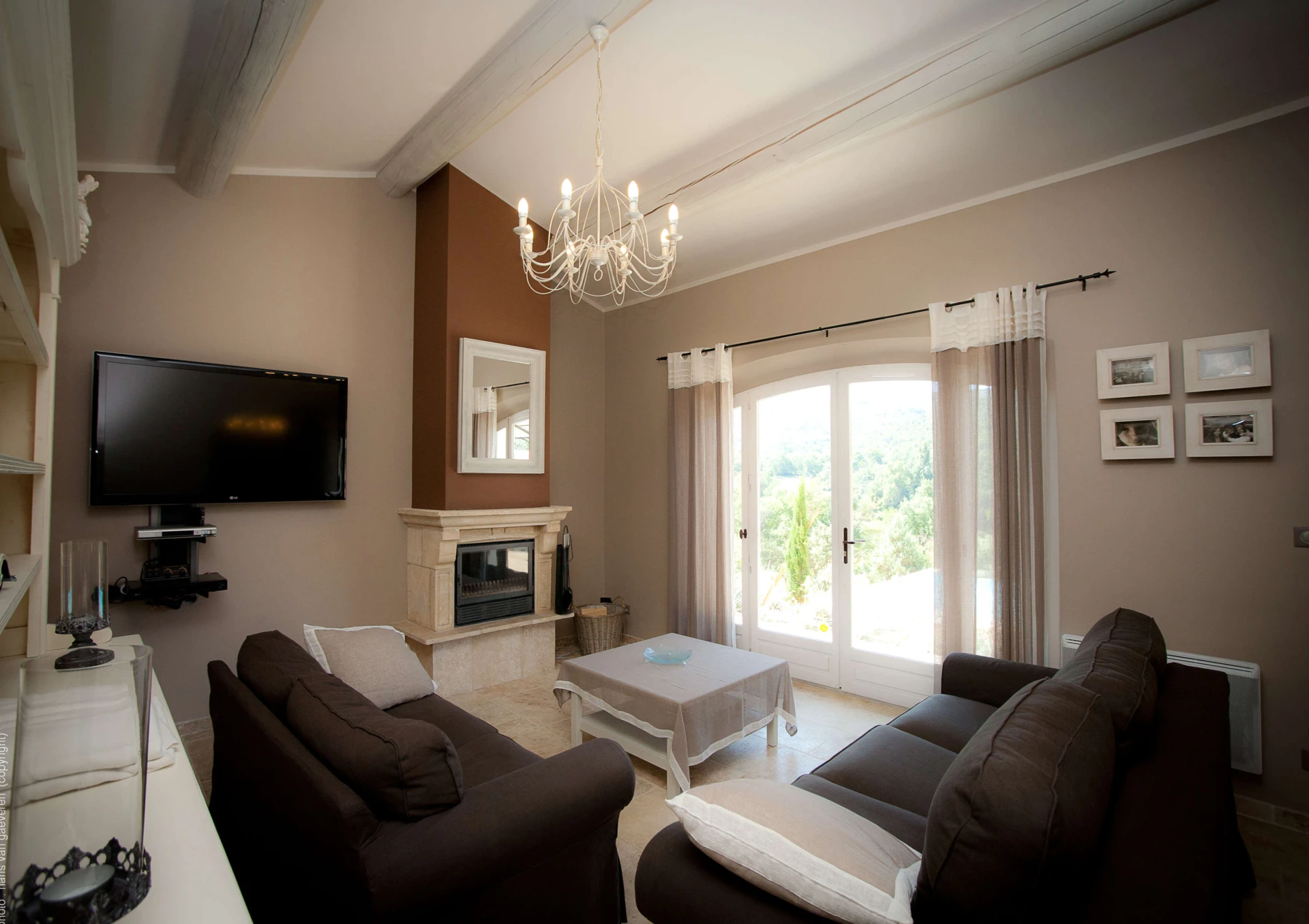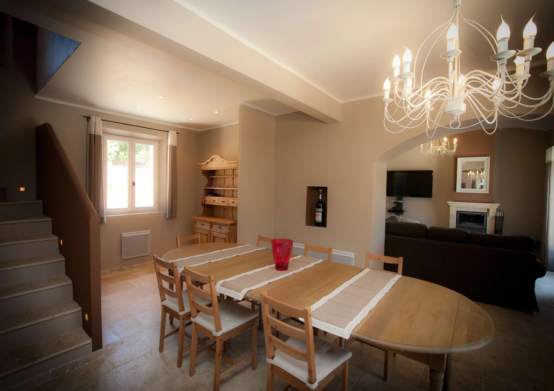 De living geeft uitzicht en toegang tot het privé zwembad en ook een fraai panoramisch beeld op Provençaals landschap. Grenzend is er een afzonderlijke salonruimte met open haard en tv hoek en aan de andere zijde is er de open keuken voorzien van alle comfort, deze geeft tevens meteen uit op de prachtige terrassen en privé verwarmd zwembad.