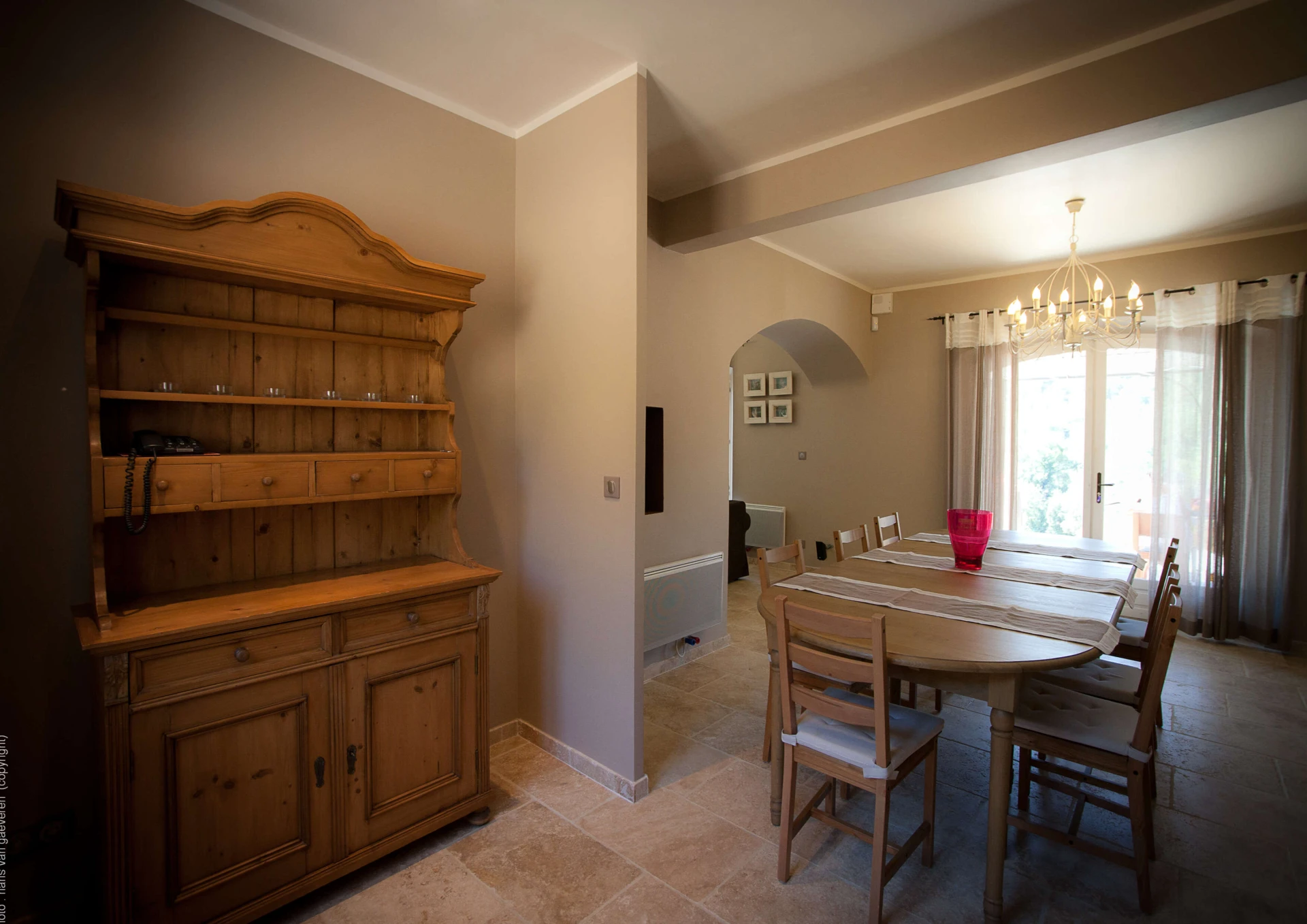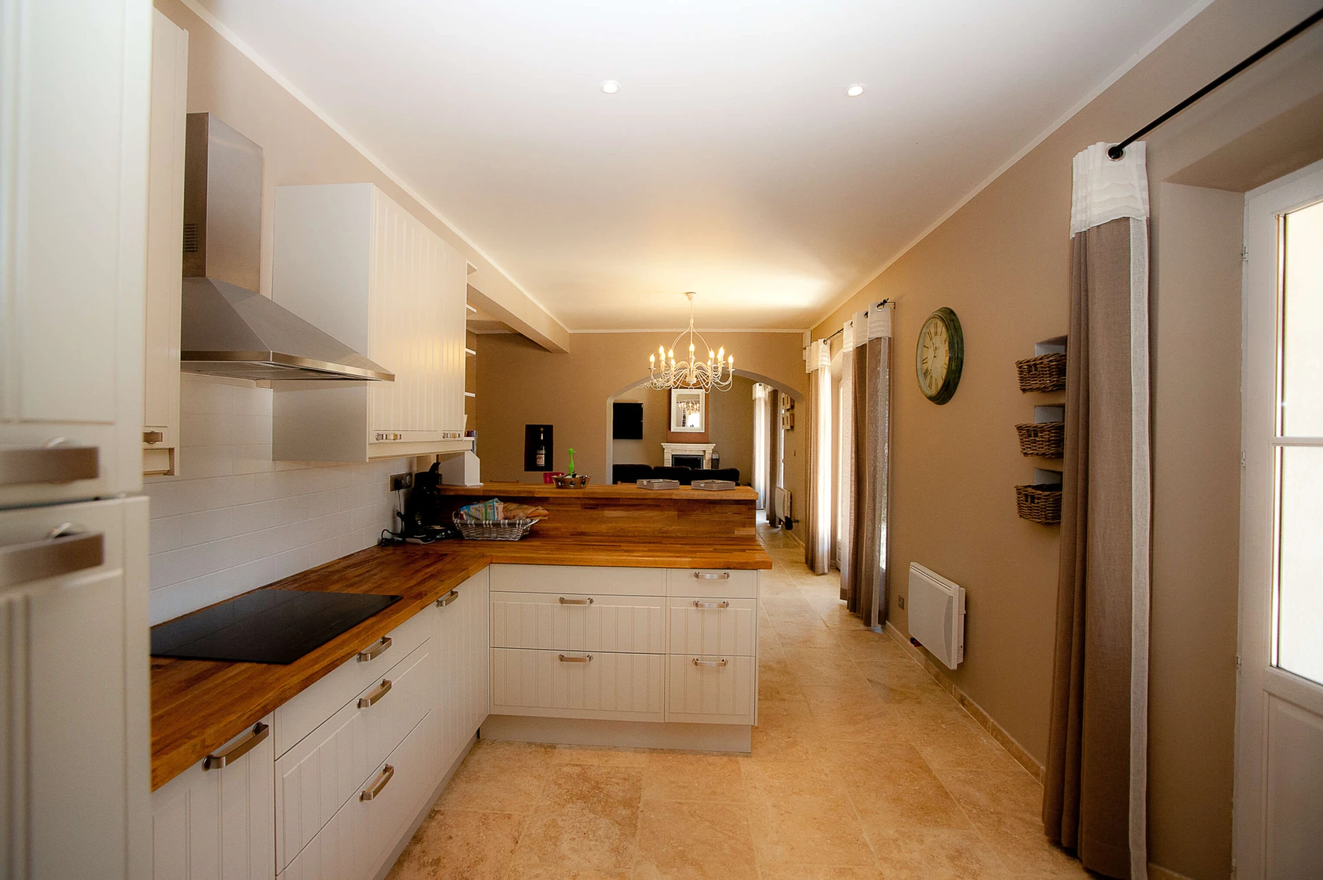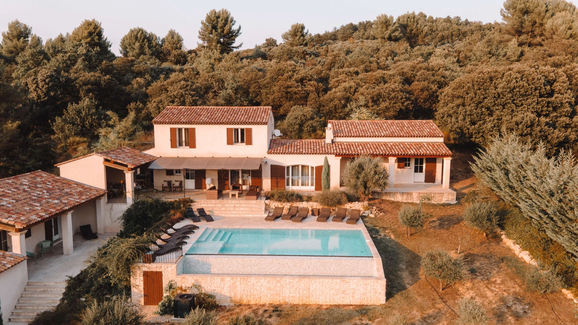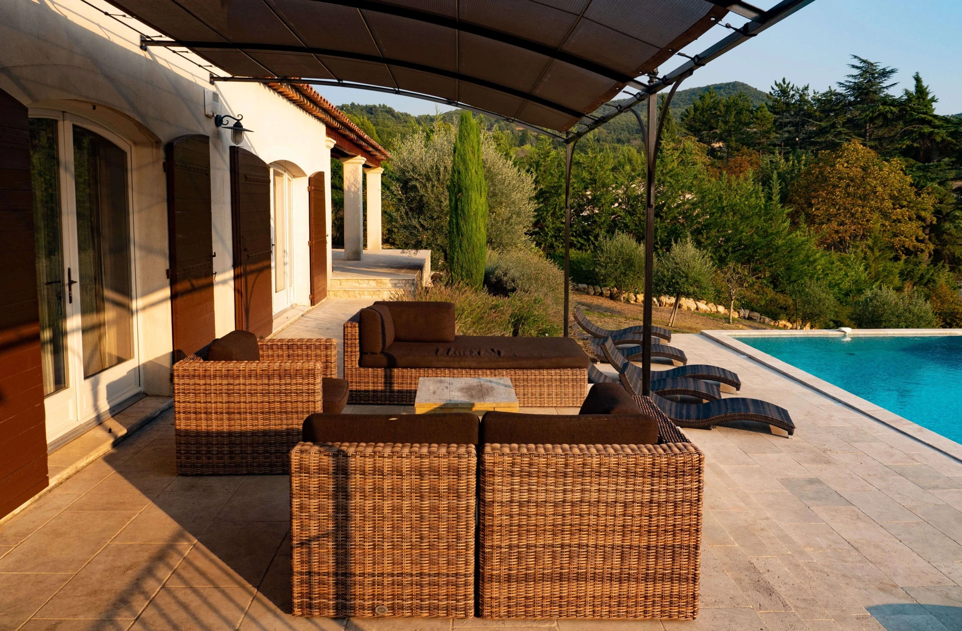 De living geeft uitzicht en toegang tot het privé zwembad en ook een fraai panoramisch beeld op Provençaals landschap. Grenzend is er een afzonderlijke salonruimte met open haard en tv hoek en aan de andere zijde is er de open keuken voorzien van alle comfort, deze geeft tevens meteen uit op de prachtige terrassen en privé verwarmd zwembad.