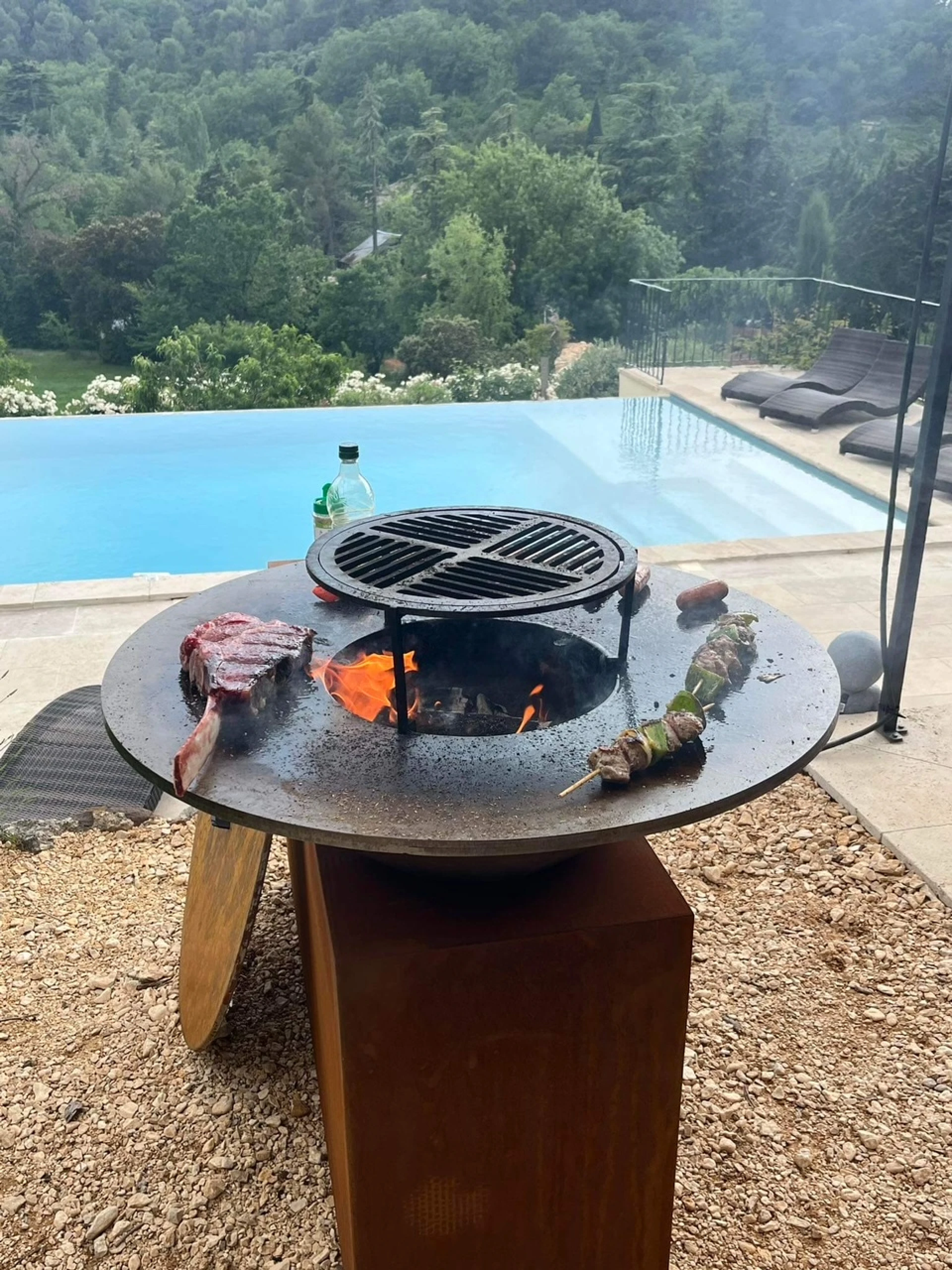 Geniet ten volle buiten van de zeer ruime terrassen (totaal 200m2) met volledig uitgeruste zomerkeuken met kookvuur en wasbak. Vanop de terrassen heb je een prachtig panoramisch uitzicht op het groen van de omliggende heuvels en het groot overloop privézwembad (5x10m, diepte van 1m20 – 1m80. Verwarming zwembad juni - september, paas verlof onder voorbehoud weersomstandigheden). De ingebouwde LED verlichting brengt s’avonds een feeërieke sfeer.