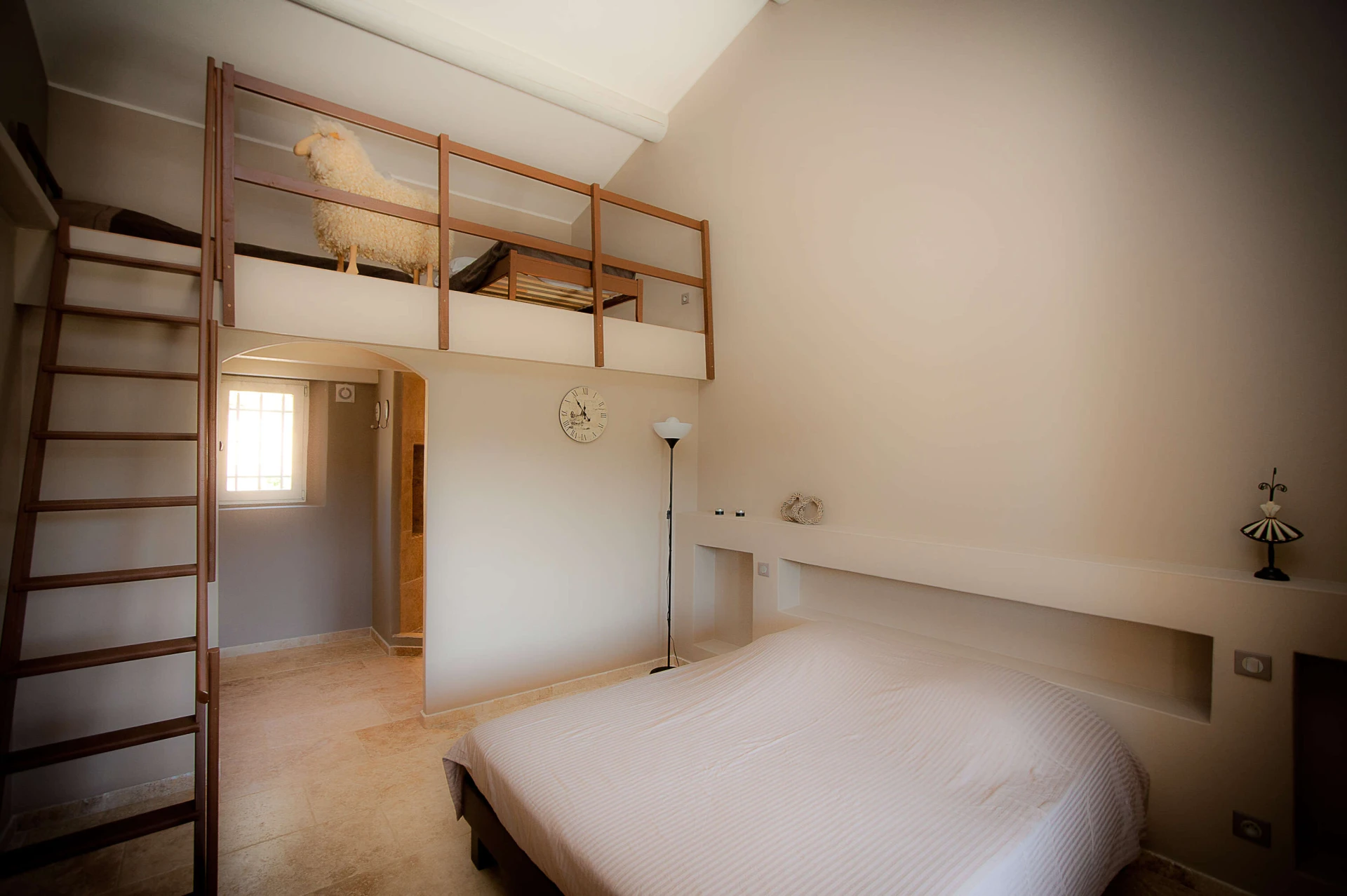 2 Kamers beschikken bovendien ook nog over een afzonderlijke mezzanine waar nog eens 2×2 kinderen kunnen slapen. Dus in totaal zijn er volwaardige plaatsen voor 12 volwassenen en 4 kinderen = 16 personen. Per gîte worden max 2 volwassenen toegelaten.