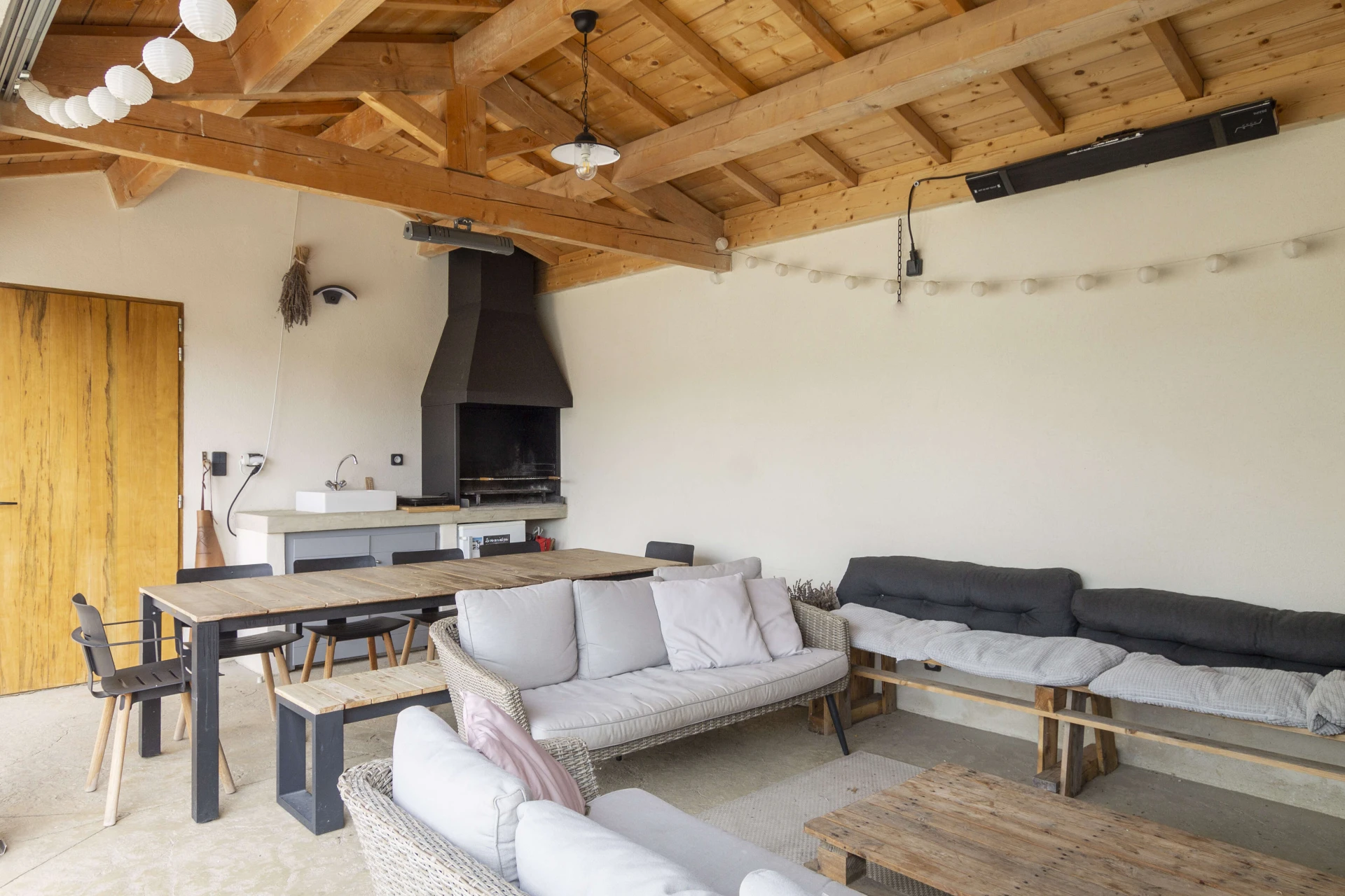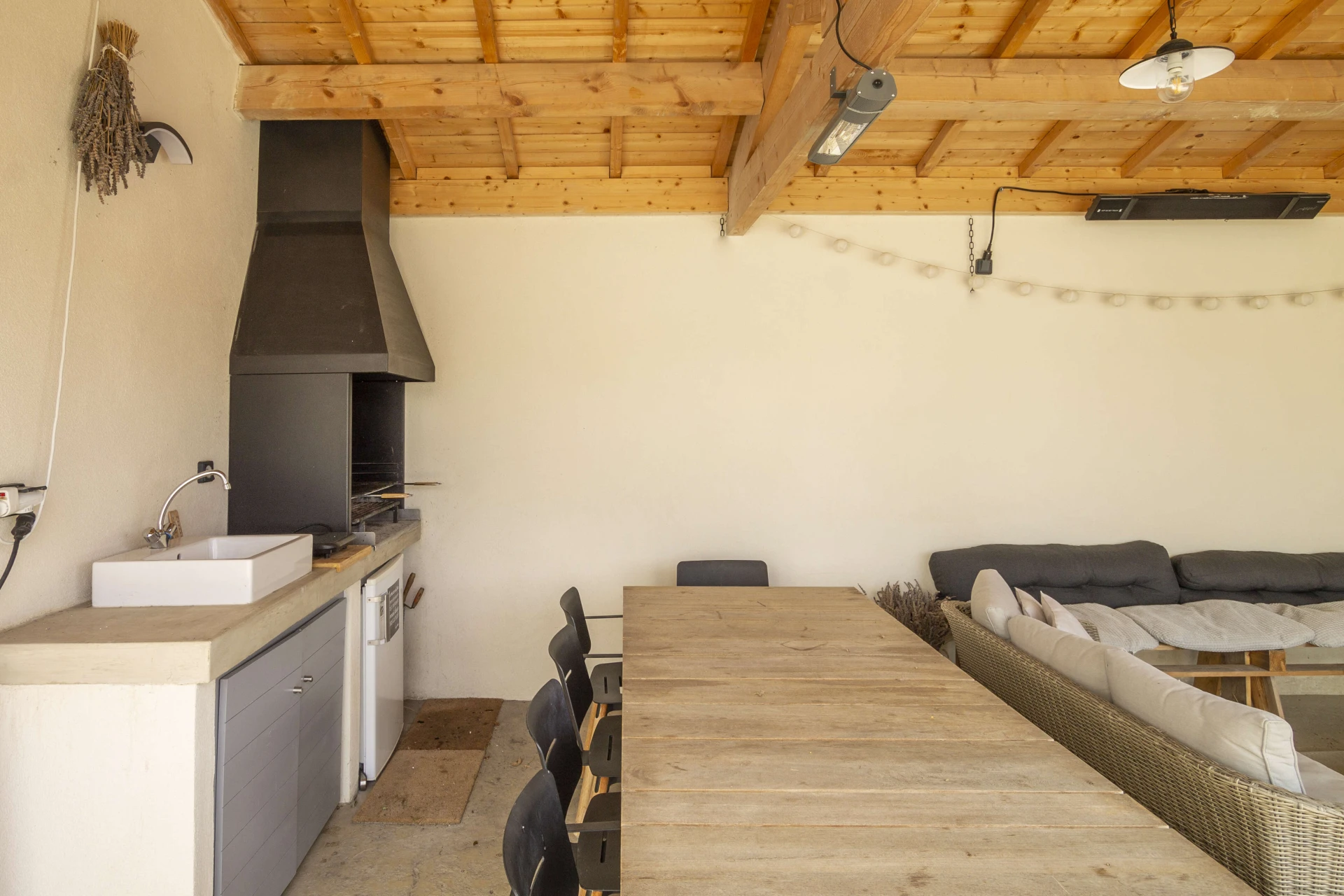De buitenkeuken met grote barbecue bevindt zich onder het mooie overdekte terras, waar u zalig kan aperitieven en gezellig dineren tijdens de zwoele zomeravonden. Men geniet van een mooi landschap en zicht op het zwembad. Door de tuinverlichting en de verlichting aan het zwembad is de sfeer 's avonds buitengewoon.