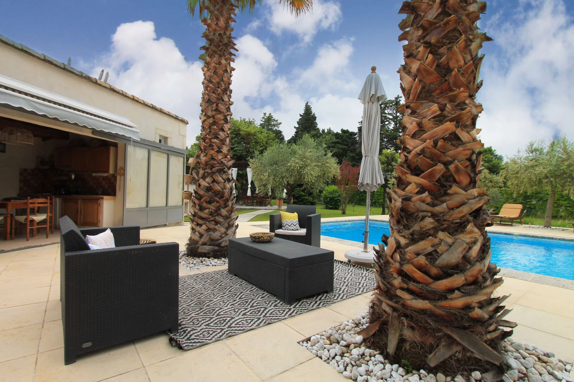 In de hall komt men via een trap in een ruime, zeer mooi en lichtrijk ingerichte living die uitgeeft op een terras met zicht op de tuin en het zwembad. Ook de slaapkamers zijn aangenaam aangekleed met veel lichtinval. Deze vakantiewoning biedt een zeer mooi, verzorgd en gezellig interieur.