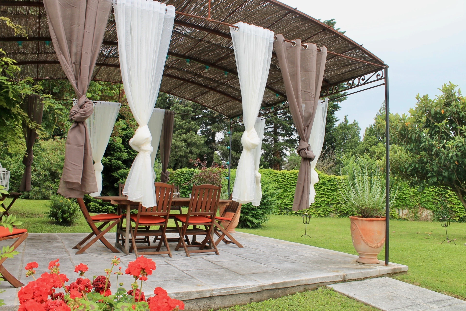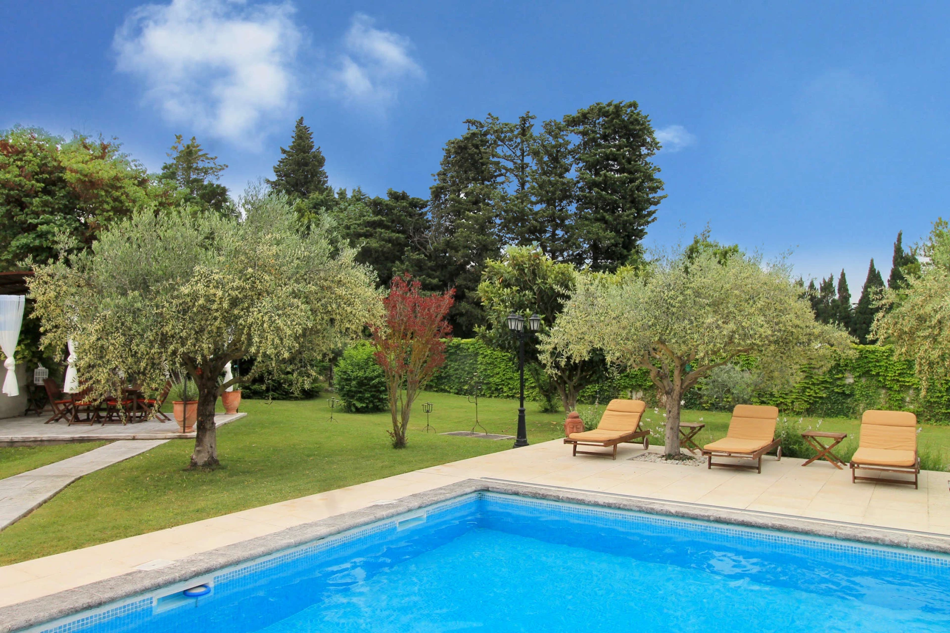 In deze vakantiewoning geniet je volop van een tuin met prachtige bomen en vele bloemen. Er is een privé omheind zwembad (5x10m - 0,8m tot 2,5 m diep) met terrassen en de nodige schaduw. Het poolhouse werd tot in de puntjes ingericht met alles voor een perfect verblijf (frigo/freezer, gasvuur, koffiezet, oven) met douchekamer en lavabo. s'Avonds voel je de feeërieke sfeer dankzij de mooie tuinverlichting.