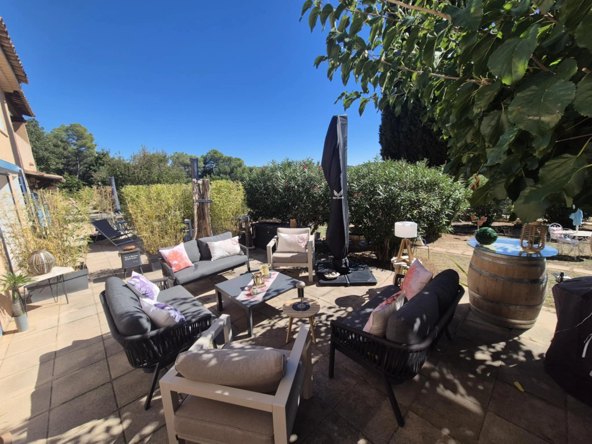 Buiten kunt u genieten van een groot ingericht terras van 100 m², ideaal voor maaltijden in de openlucht of om heerlijk te ontspannen. Het patio van 30 m² biedt een intieme plek om te relaxen, te lunchen of te dineren en beschutting te zoeken tegen de zon. Daarnaast is er een speelruimte met een tafelvoetbal en een elektronisch dartspel.