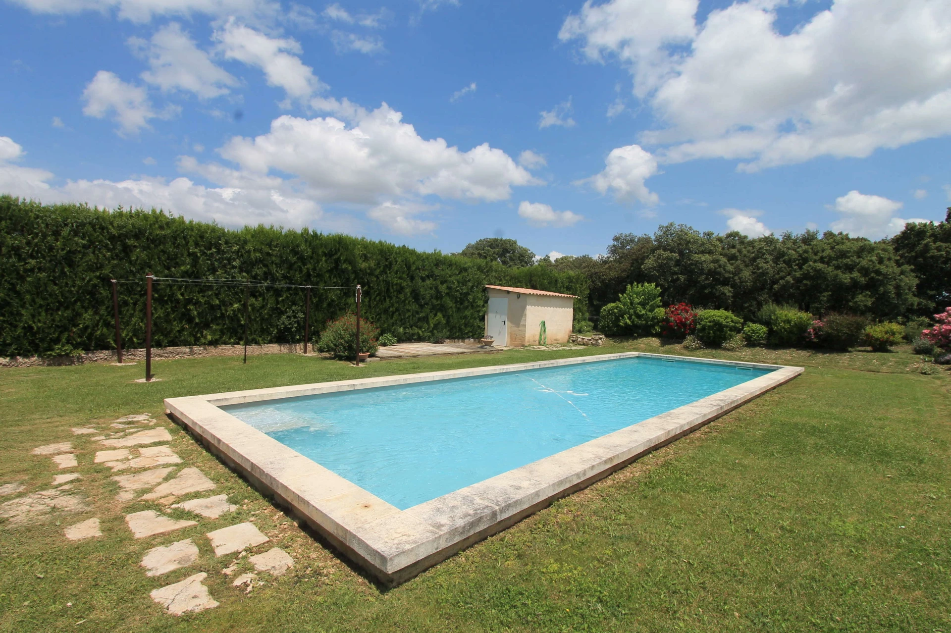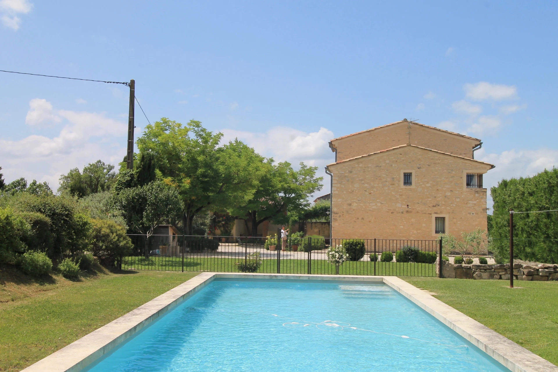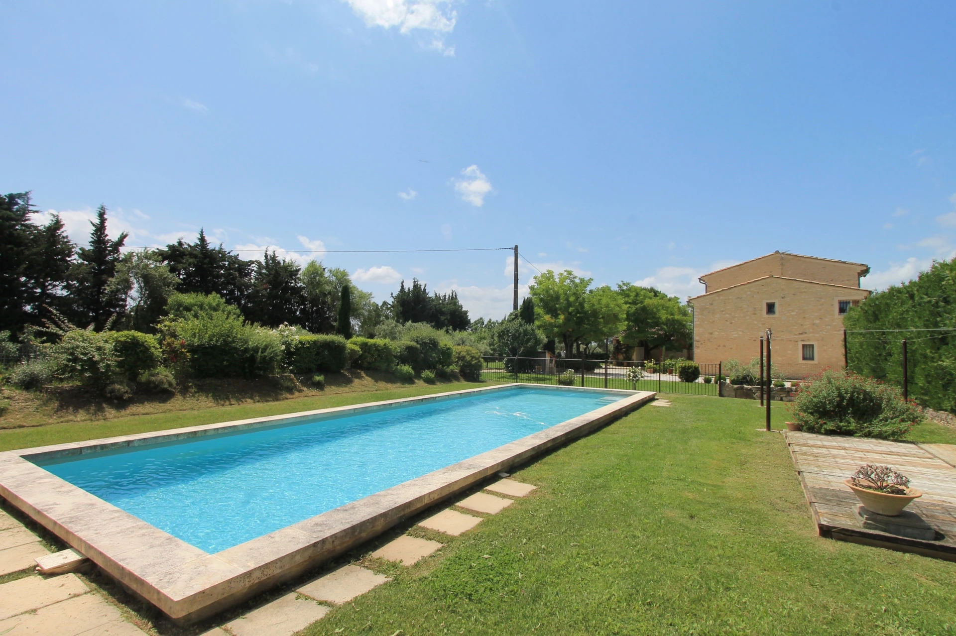 Dit vakantiehuis met privé zwembad heeft leuke ligzetels rond het zwembad, een prachtige tuin (2800m2) met verschillende aangename schaduwplekjes en zeer ruime en gezellige terrassen, voorzien van kwalitatief tuinmeubilair. De inrichting en de decoratie is met heel veel zorg en smaak gebeurd. Het prachtige, omheinde privé zwembad (14x4,5m-romeinse treden-omheind) met ligzetels is heel goed gesitueerd in de tuin. Je begeeft je met deze vakantiewoning tussen de wijngaarden, olijfbomen en lavendelvelden, ervaar hier het echte provencaalse gevoel.