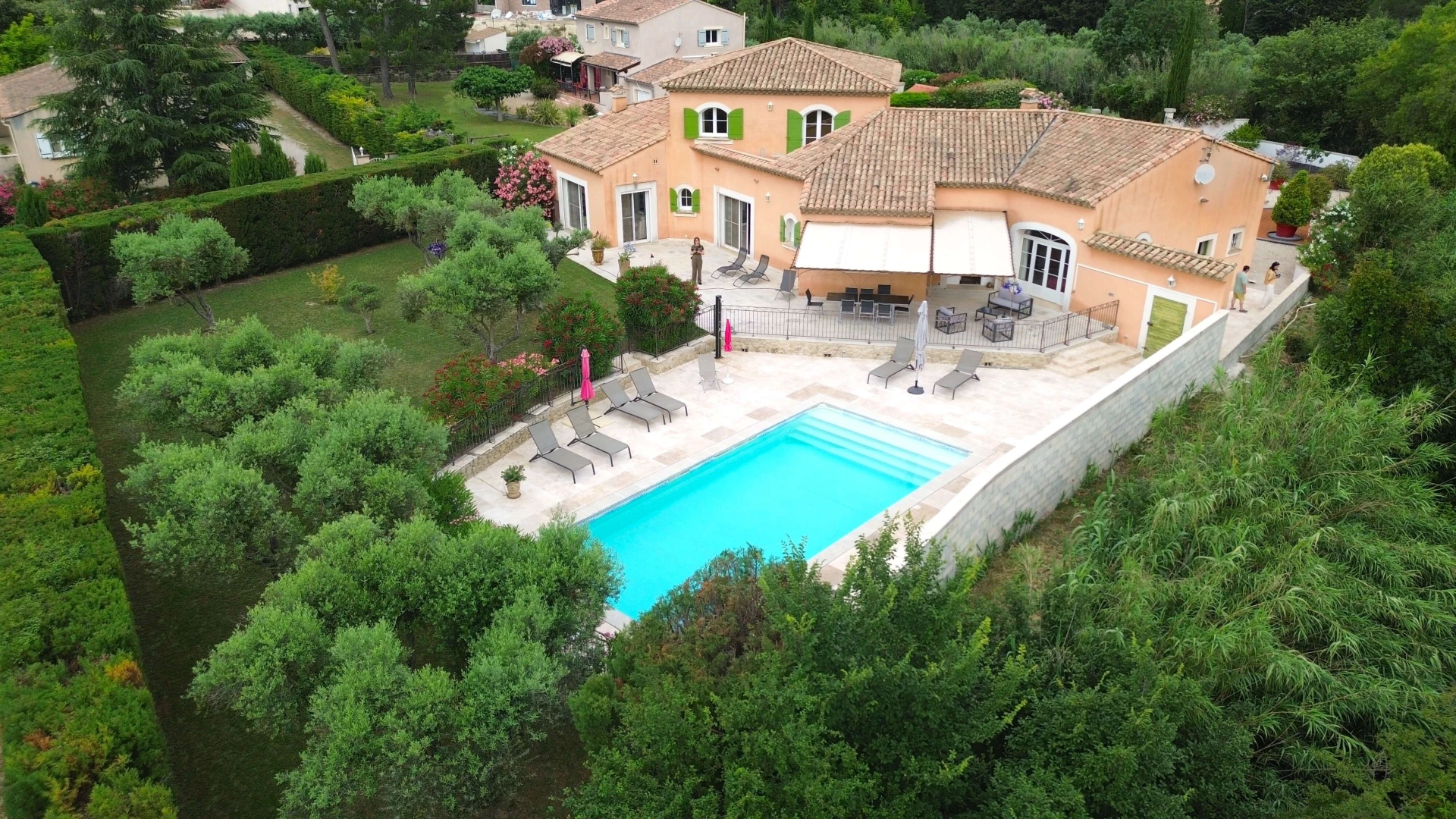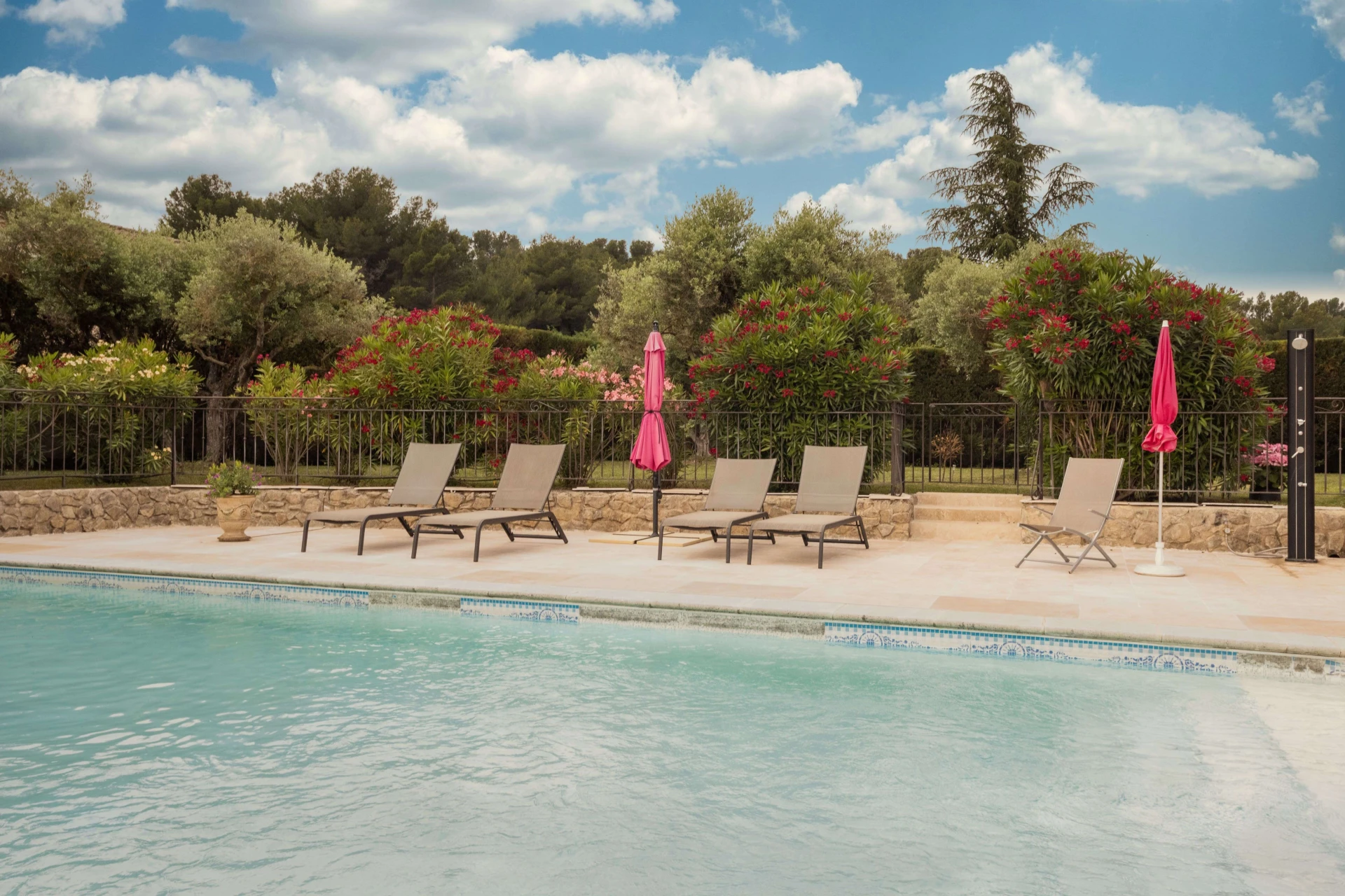 Het toppunt van dit vakantiehuis is zeker haar grote omheinde zwembad (10x5m - diepte 1,40 m), omringd door een open terras en overdekt door een zonneluifel. De omheining rond het zwembad is bijzonder mooi en discreet. Naast het zwembad ligt een poolhouse met wastafel, wc en douche, met 2 plancha grills (let op: BBQ niet toegestaan in het hoogseizoen). Een buitendouche is ook beschikbaar in de garage.